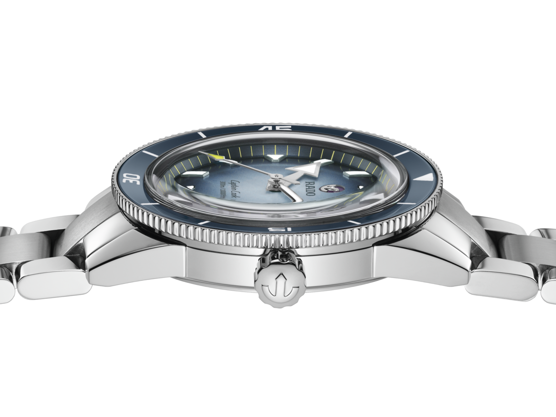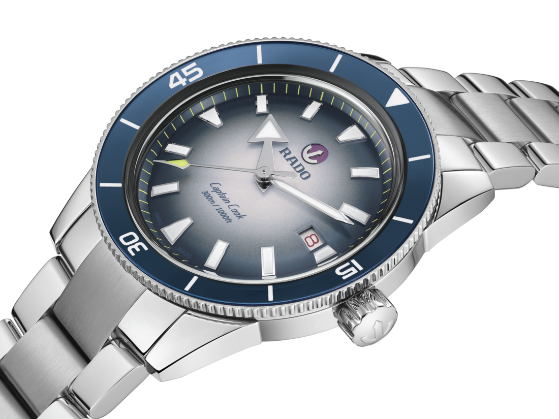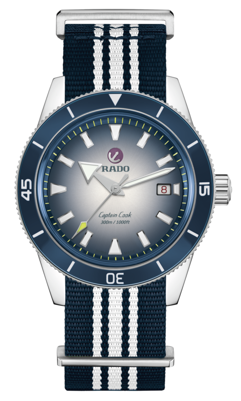The Captain Cook Automatic features a 42mm polished stainless-steel case and crown. On top, a polished stainless steel rotating bezel with a polished blue high-tech ceramic bezel insert with engraved numbers and markers in matt white Super-LumiNova®. Powering this watch is a Rado calibre R763, an automatic movement that delivers an impressive 80-hour power reserve. The rhodium coloured hour and minute hands are treated with white Super-LumiNova® and the tip of the central seconds hand is treated in yellow Super-LumiNova®, a playful nod to the colour of tennis balls. The Captain Cook Automatic watch is delivered with a stainless steel bracelet and a blue leather pouch. A pair of strap options is available including a classic blue leather strap or a blue and white NATO-style textile strap.