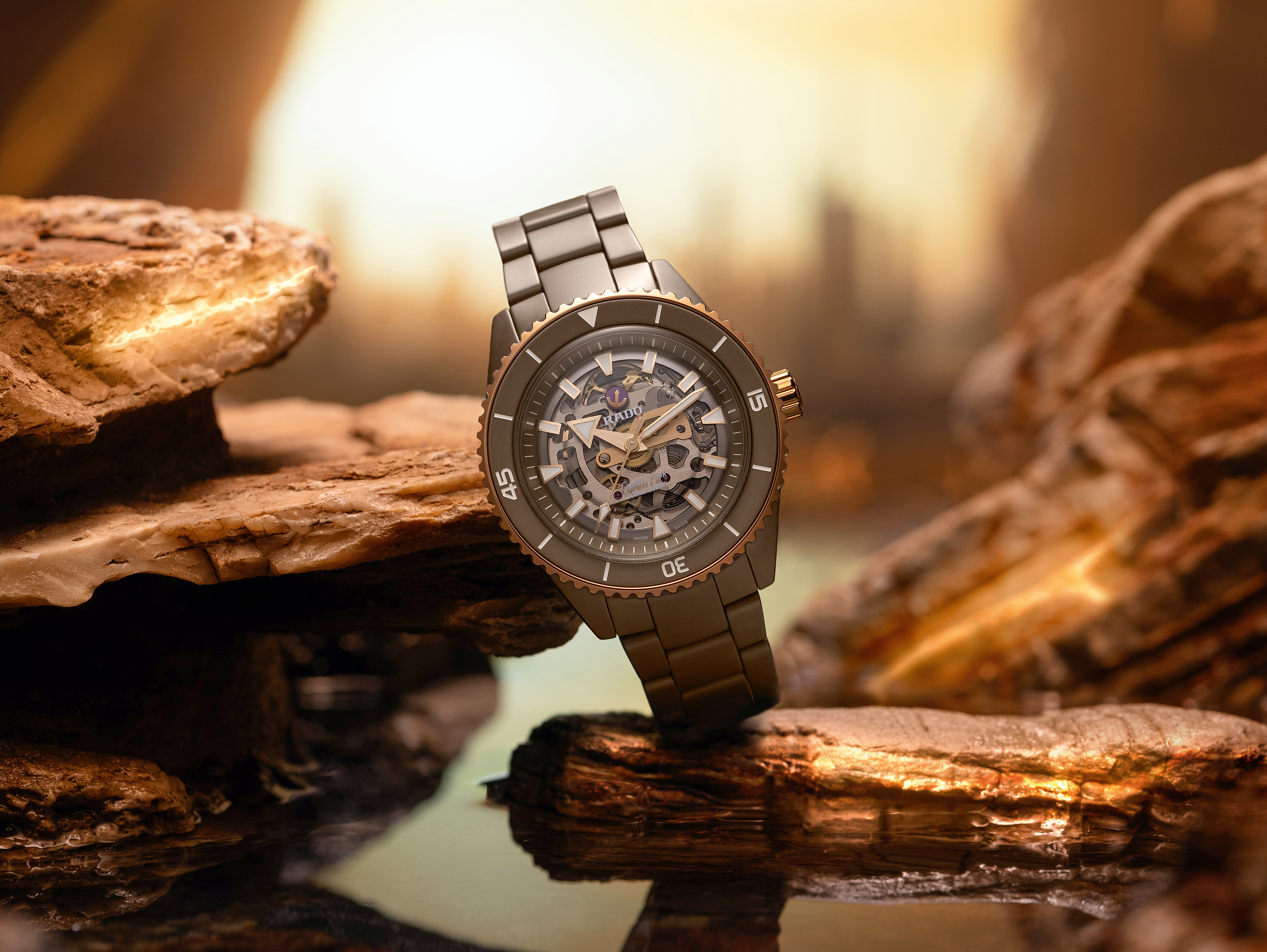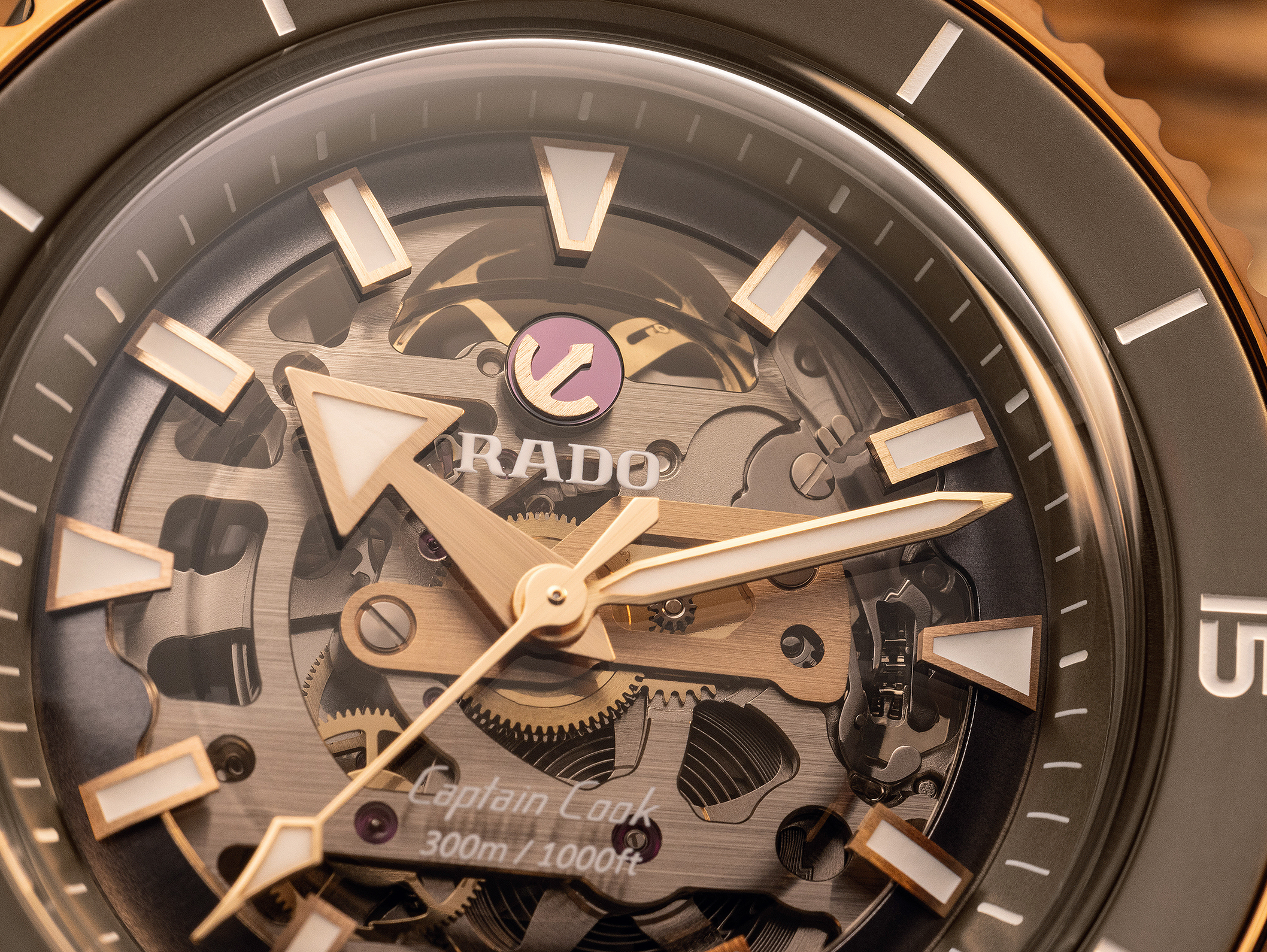 The Captain Cook High-Tech Ceramic Skeleton showcases its innovative R808 movement, a marvel of contrasts, know-how and clever geometry, that allows a distinct view of the various parts. It’s equipped with an anti-magnetic and highly reliable Nivachron™ hairspring that has been fully tested in five positions and provides up to 80 hours of power reserve. The superb matt olive-green high-tech ceramic monobloc case is topped by a rose-gold-colour rotatable bezel with a matt olive-green ceramic insert to match the case and lugs, for visual harmony. The dial is clear and spartan, with generous geometric indices and hour/minute/second hands in rose-gold tones, treated with white Super-LumiNova® for best readability in low-light conditions. Thanks to a matching olive green high-tech ceramic triple-row bracelet with a titanium three-fold clasp, the new Captain Cook remains loyal with you through the most rugged and demanding of your explorations.