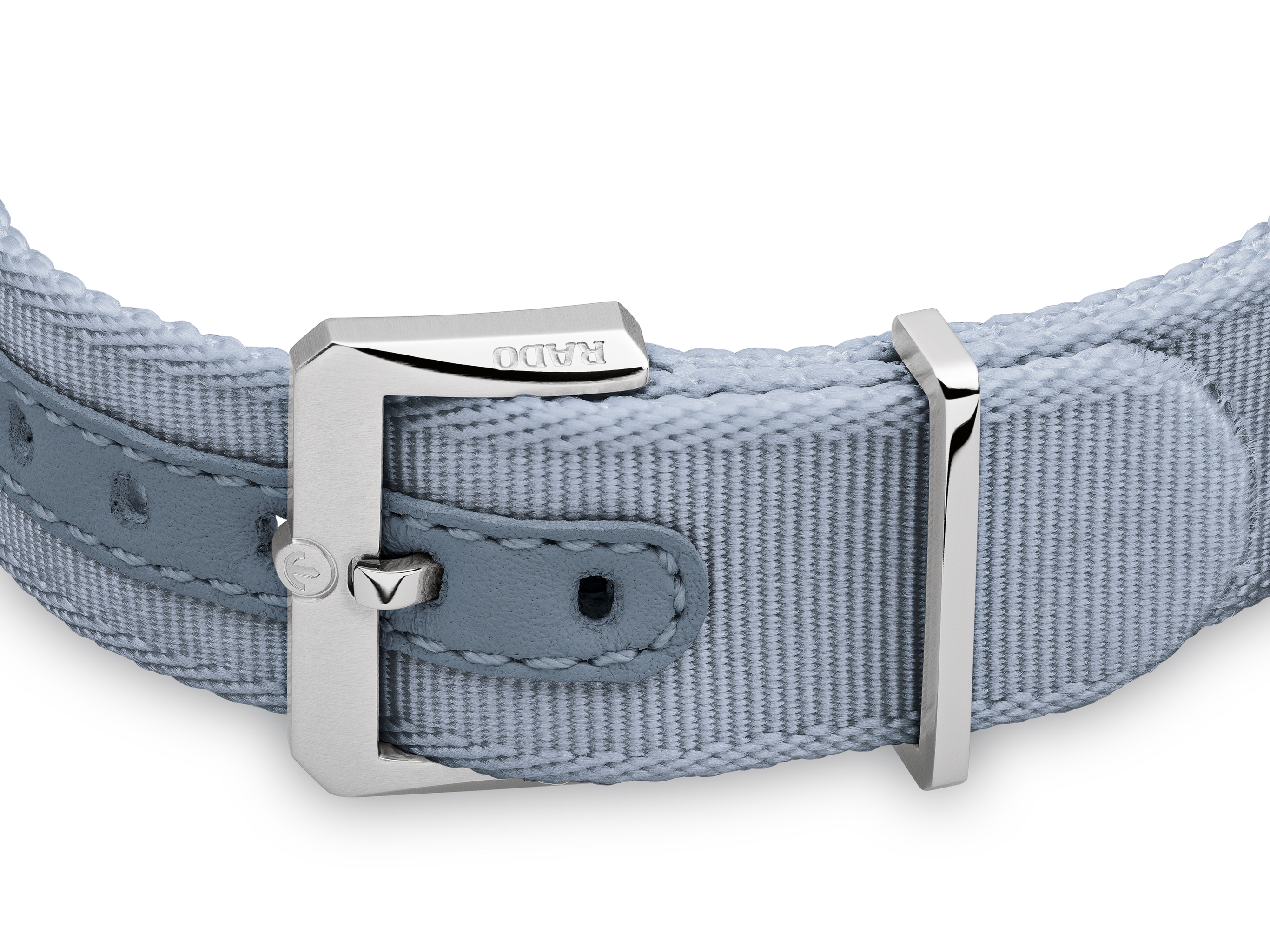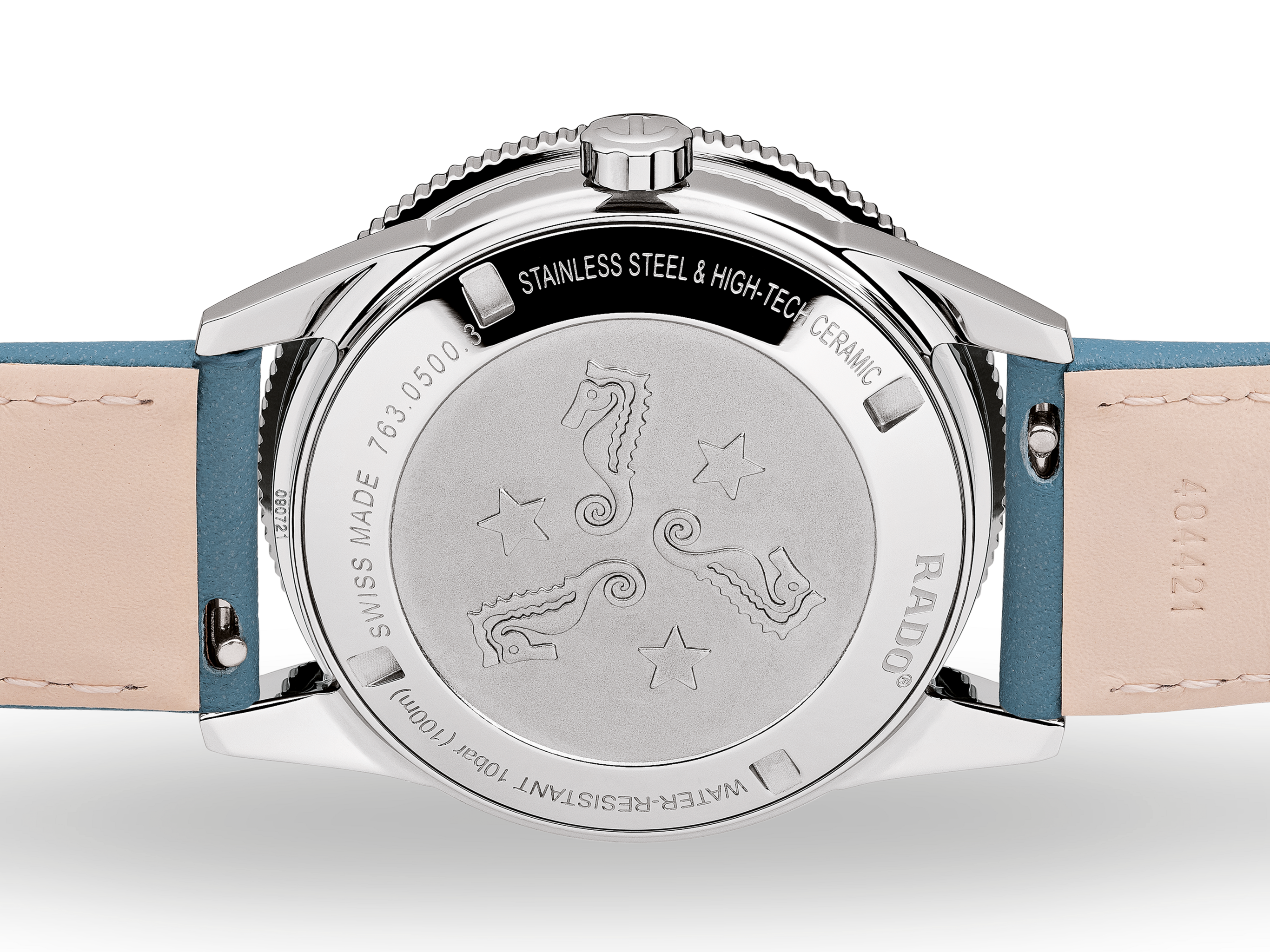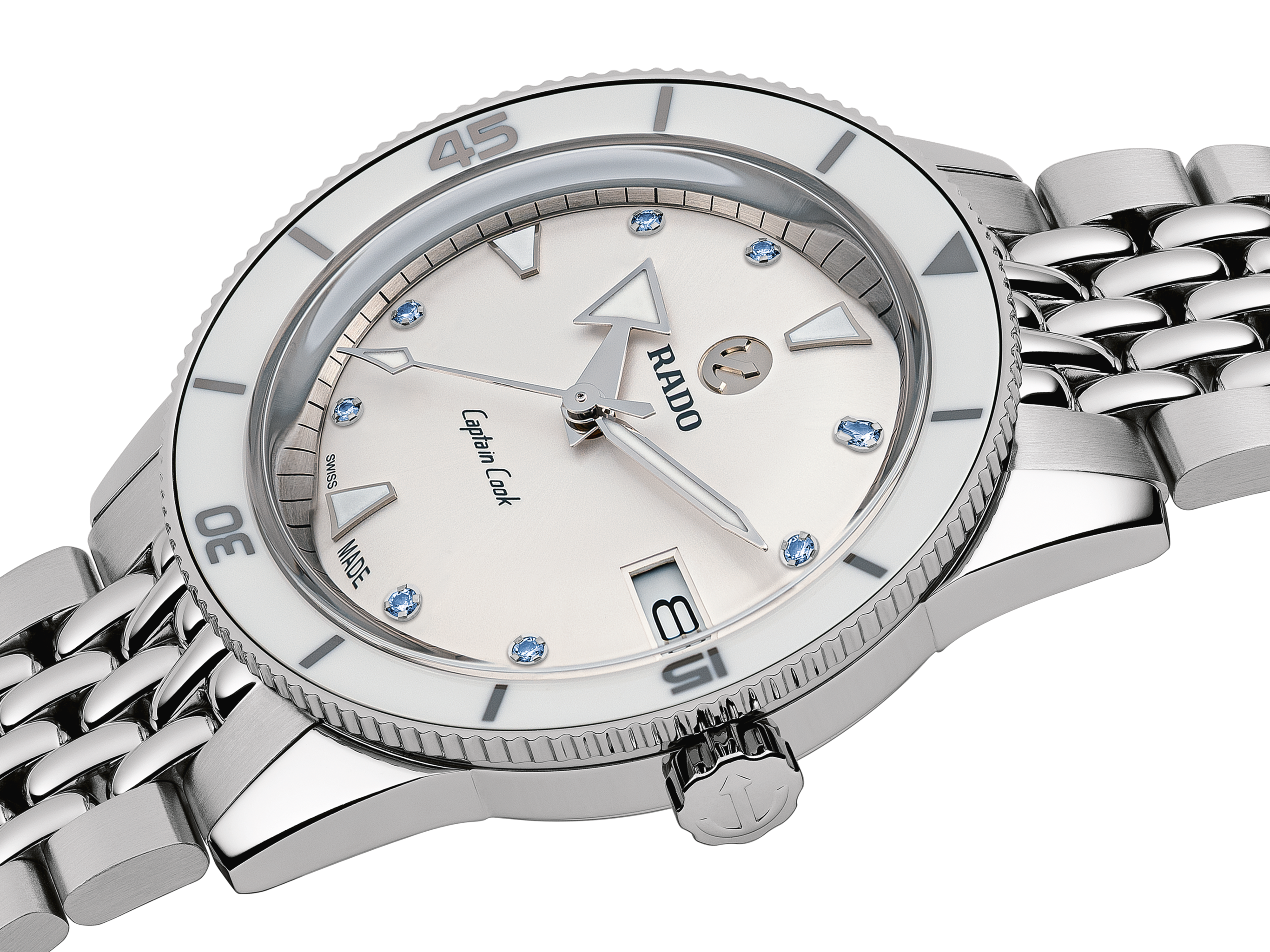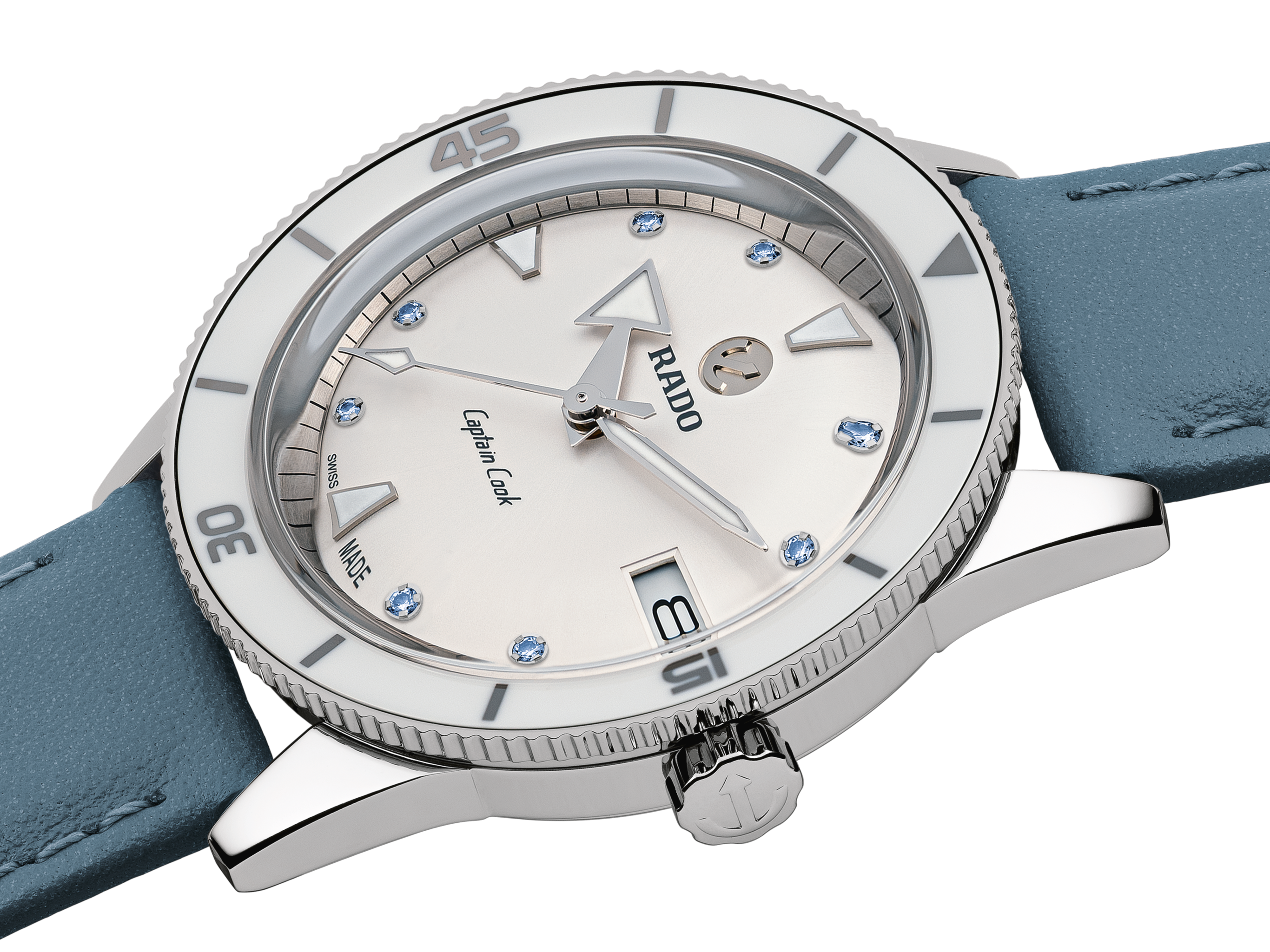 全新Rado瑞士雷達表庫克船長自動機械腕錶是對標誌性Rado瑞士雷達表時計的當代詮釋。雪白色錶盤上鑲有八顆冰藍色藍寶石時標,錶盤周圍為白色高科技陶瓷鑲嵌錶圈。腕錶配備三款錶帶——米粒狀精鋼錶鏈、淺藍色Nato錶帶或帶有藍色縫線的藍色皮革錶帶——藉助Rado瑞士雷達表輕鬆扣合系統(Easy Clip)系統,可以輕鬆快速地更換錶帶。