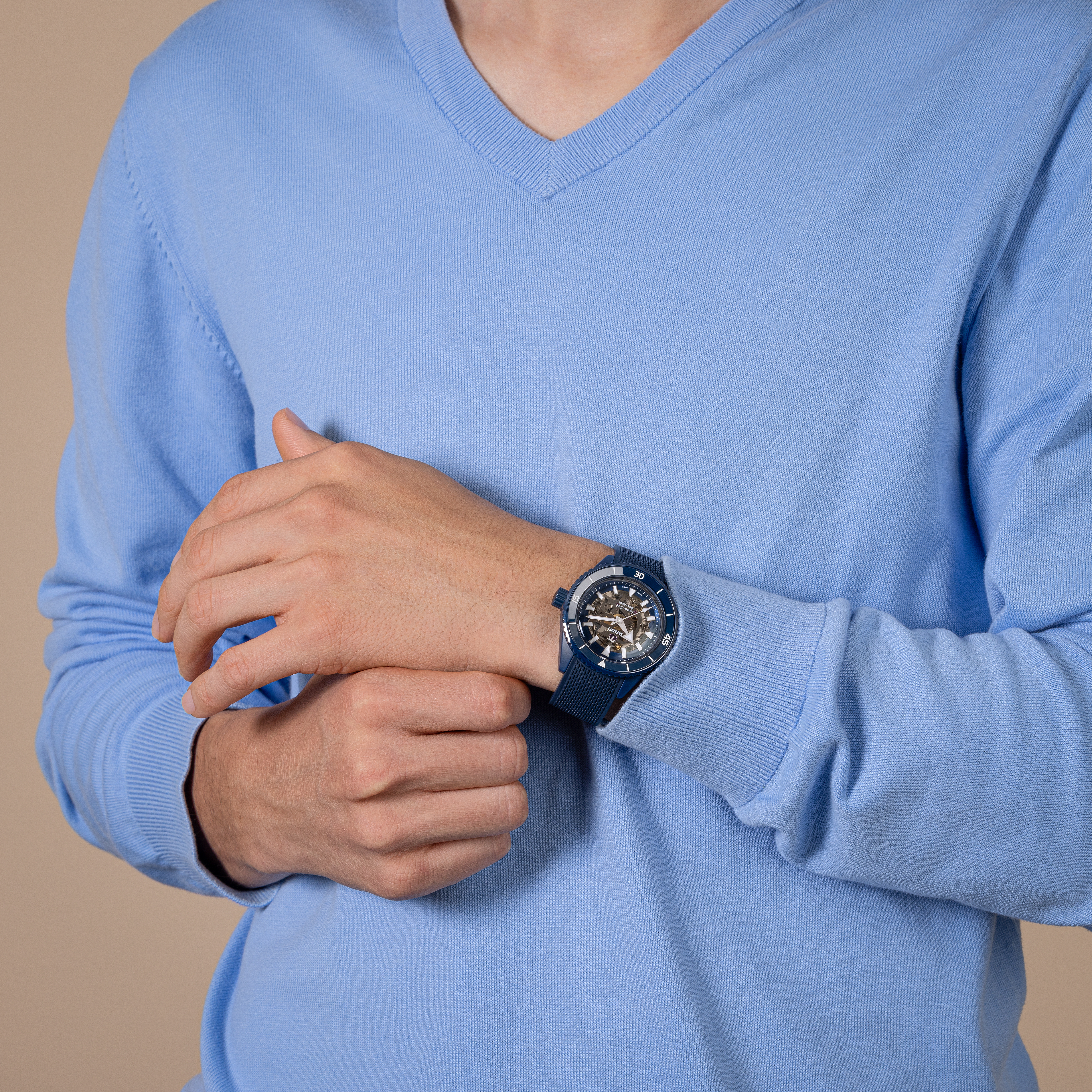 Captain Cook庫克船長高科技陶瓷鏤空腕錶搭載創新型R808機芯,對比鮮明的設計、頂尖製錶技藝,以及巧妙的幾何形狀令人嘆為觀止。愛錶人士可以清楚鑑賞各個零件的運轉。腕錶搭載高度可靠的防磁NivachronTM游絲,且在五個方位進行了全面測試,並提供長達80小時的動力儲存。精美的霧面海軍藍高科技陶瓷整體式構造錶殼,搭配拋光海軍藍高科技陶瓷可旋轉錶圈,內嵌海軍藍陶瓷襯片,與錶殼和錶耳和諧互搭,相得益彰。錶盤清晰簡潔,配有寬大的幾何設計時標和銠色時/分/秒針,並覆有白色Super-LumiNova®夜光塗層,確保在低光源條件下依然能夠清晰讀時。新款Captain Cook庫克船長腕錶搭配海軍藍橡膠錶帶和高科技陶瓷錶扣蓋,展現出活力動感的一面。