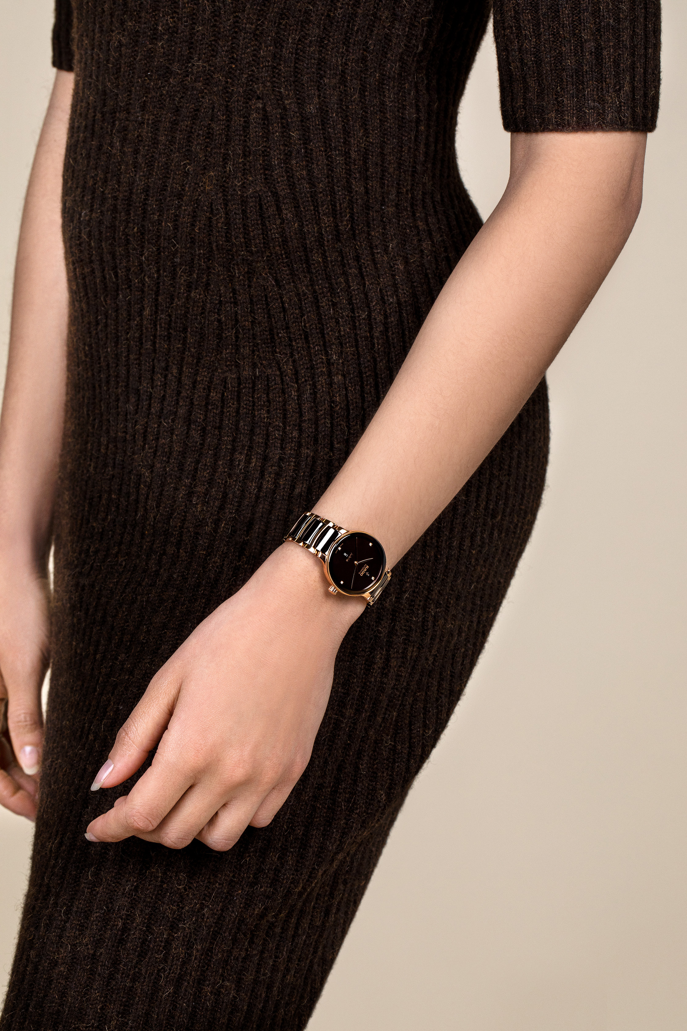 經典Centrix晶萃系列鑲鑽自動機械腕錶不僅在技術上進行調整,亦在美學上予以重新設計。修改後的錶款,擁有一個圓形的無邊框藍寶石水晶玻璃錶鏡,以及一個與弧形水晶邊緣渾然天成的弧形錶殼。調整後的錶耳和搭配棕色高科技陶瓷中央鏈節的拋光玫瑰金PVD塗層精鋼錶鏈,令這款經典時計的整體外觀更臻完美。棕色漆面錶盤鑲嵌著4顆鑽石,印有「jubilé」標誌,與玫瑰金色指針完美搭配。由於搭載Nivachron™防磁游絲,使這款R582型三針機芯在3至5個位置上遠超標準測試要求,實現更高的可靠性和精確度。這款腕錶防水深度可達50公尺,並提供48小時的動力儲存。
