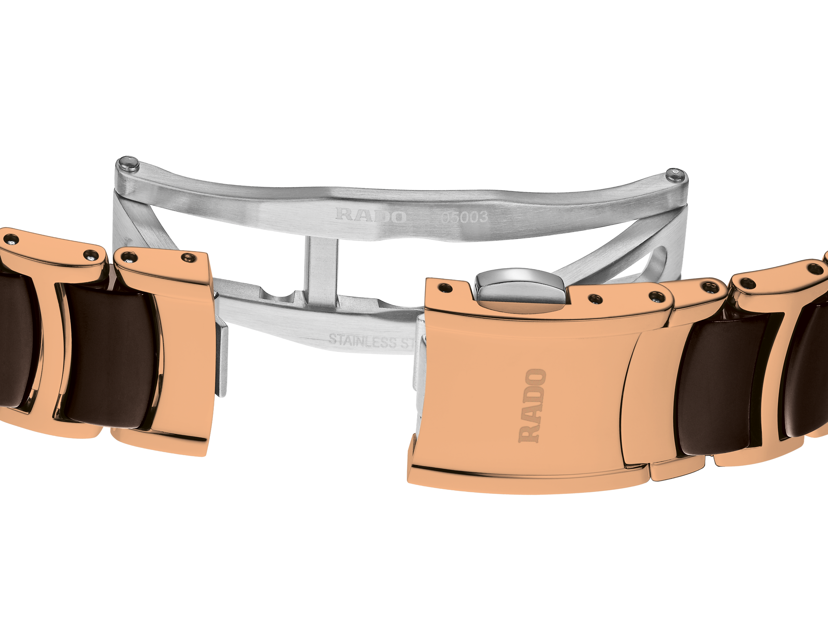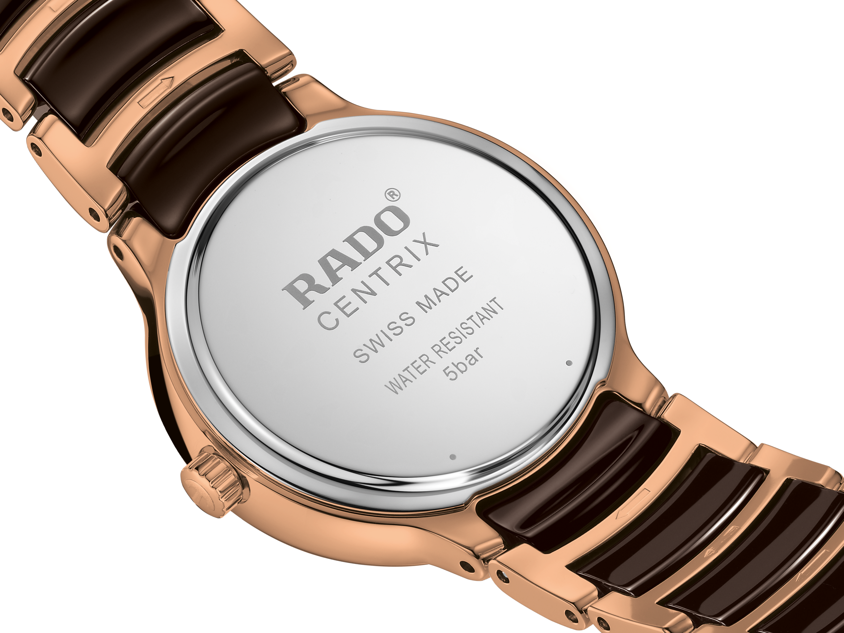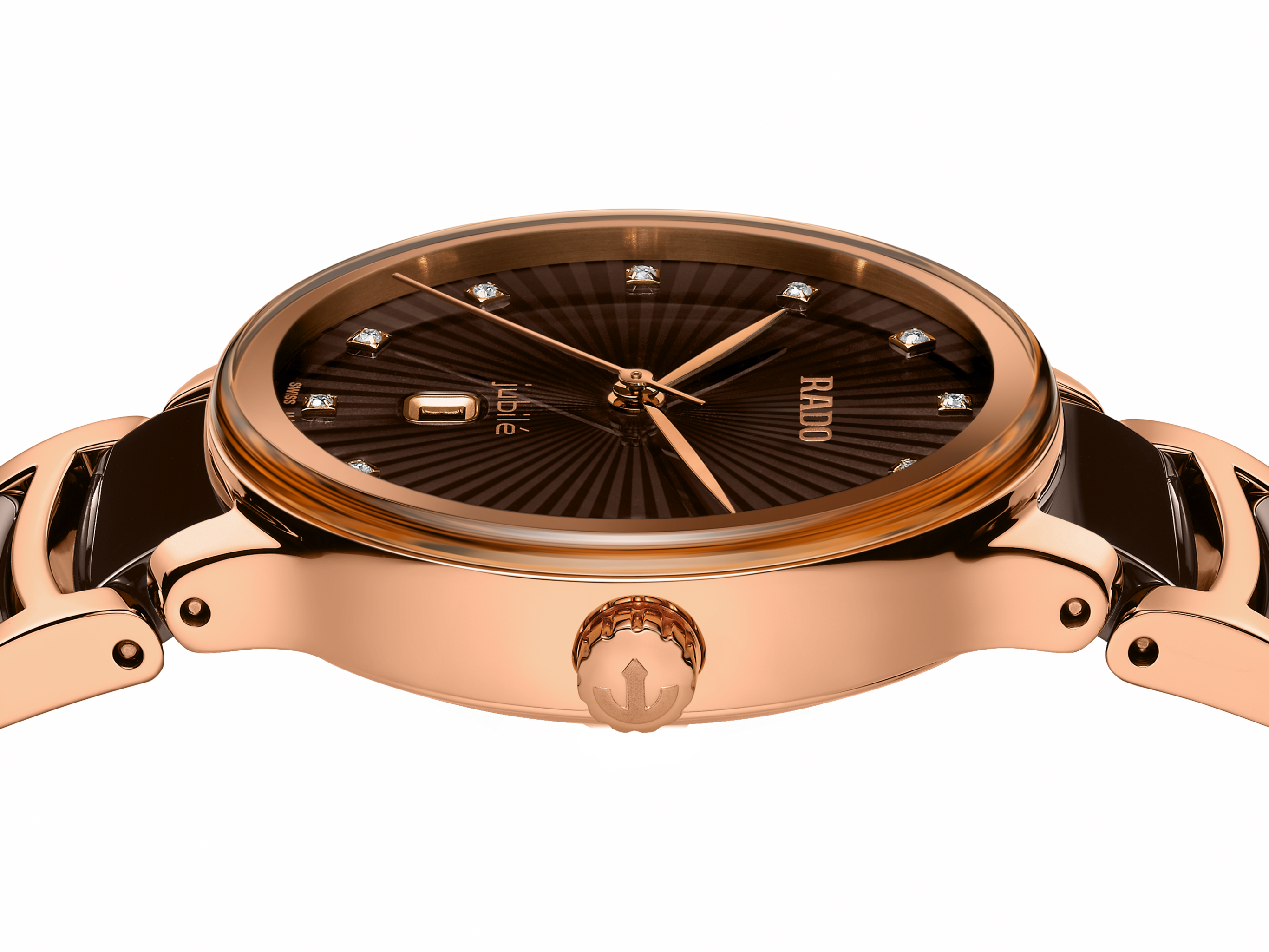 經典Centrix晶萃系列鑲鑽石英腕錶不僅在技術上進行調整,亦在美學上予以重新設計。改款後的錶款,擁有一個圓形的無邊框藍寶石水晶玻璃錶鏡,以及一個與弧形水晶邊緣渾然天成的弧形錶殼。全新改款的錶耳和搭配棕色高科技陶瓷中央鏈節的拋光玫瑰金色PVD塗層精鋼錶鏈,令這款經典時計的整體外觀更臻完美。錶盤透過壓印成型並以漆面處理,為鑲有12顆鑽石的棕色刻面錶盤創造出華麗效果。搭載PreciDrive和HeavyDrive技術的R079型石英機芯,讓腕錶具有更加優異的精準度和抗震性。腕錶防水深度達50公尺。