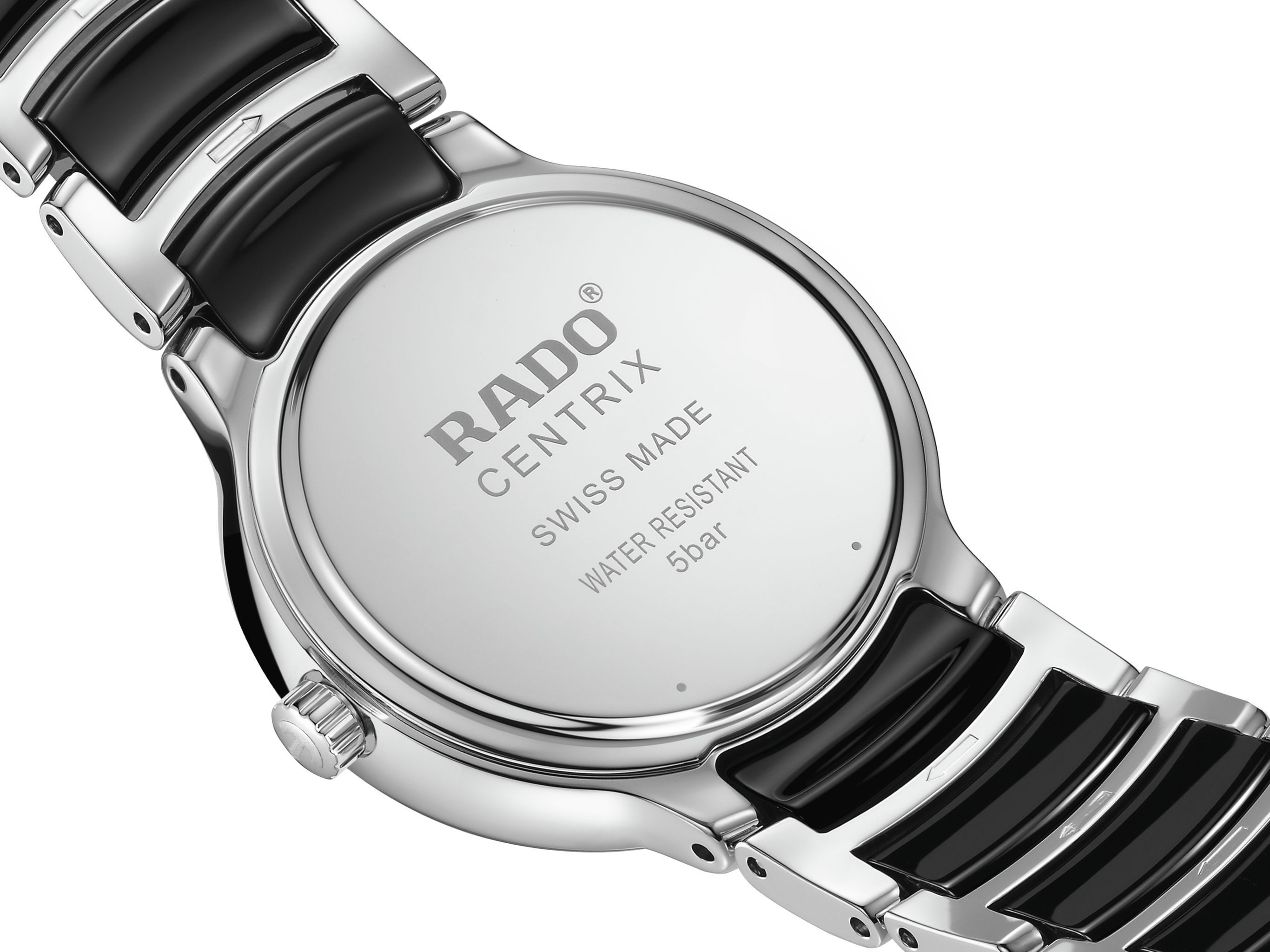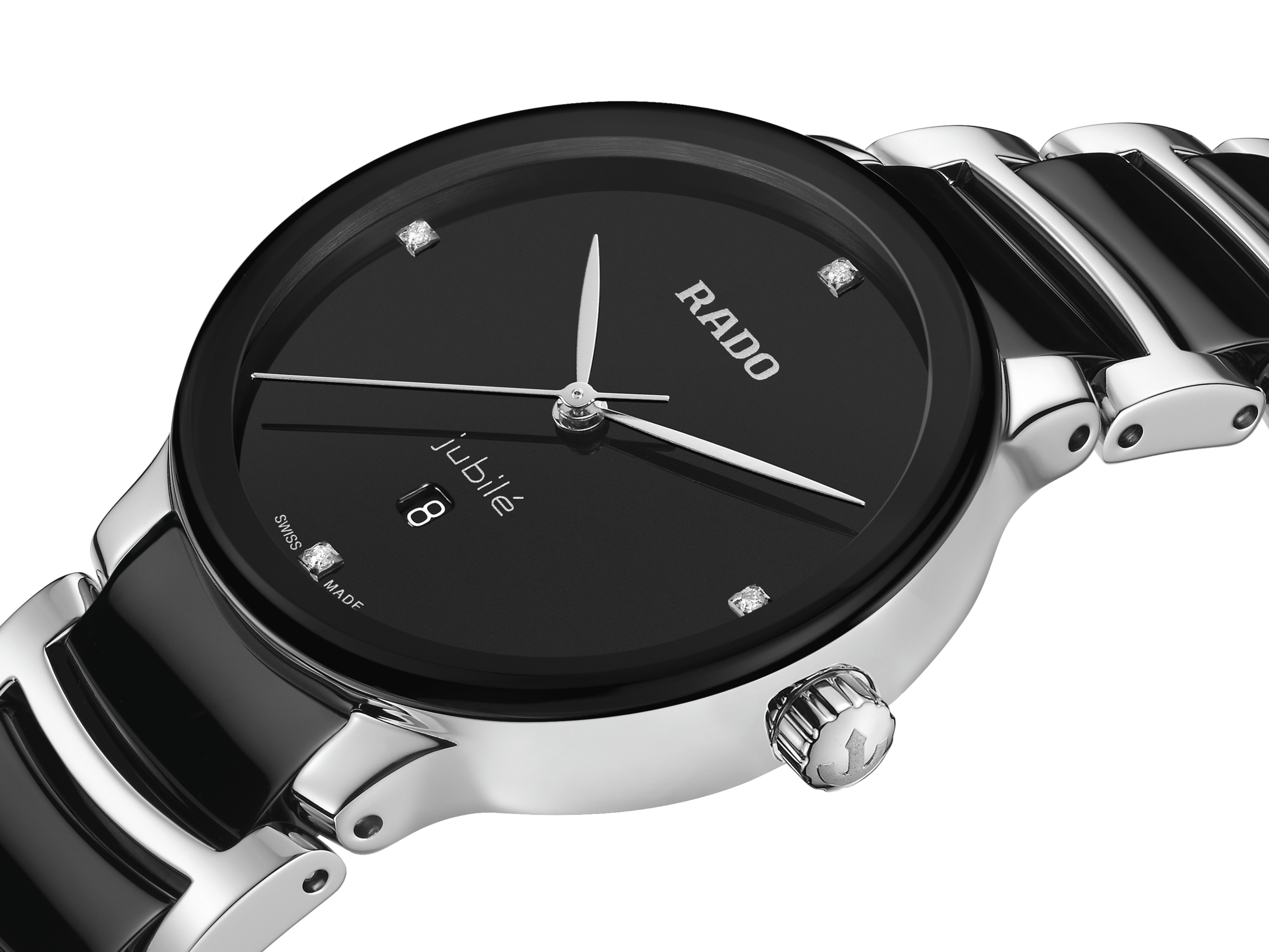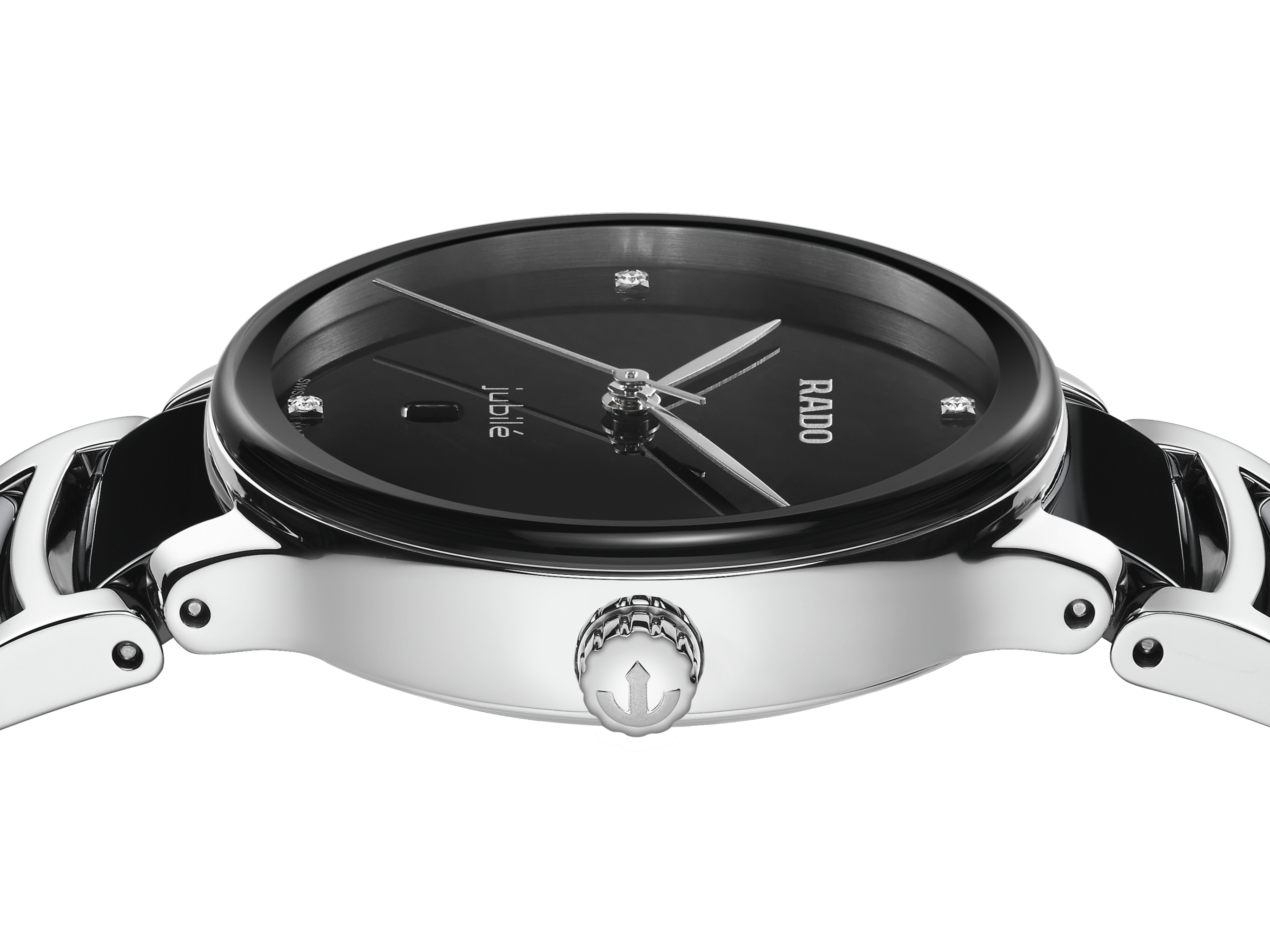 經典Centrix晶萃系列鑲鑽石英腕錶不僅在技術上進行調整,亦在美學上予以重新設計。改款後的錶款,擁有一個圓形的無邊框藍寶石水晶玻璃錶鏡,以及一個與弧形水晶邊緣渾然天成的弧形錶殼。全新改款的錶耳和搭配黑色高科技陶瓷中央鏈節的拋光精鋼錶鏈,令這款經典時計的整體外觀更臻完美。黑色漆面錶盤鑲嵌著4顆鑽石,印有「jubilé」標誌,與銠色指針完美搭配。搭載PreciDrive和HeavyDrive技術的R079型石英機芯,讓腕錶具有更加優異的精準度和抗震性。腕錶防水深度達50公尺。