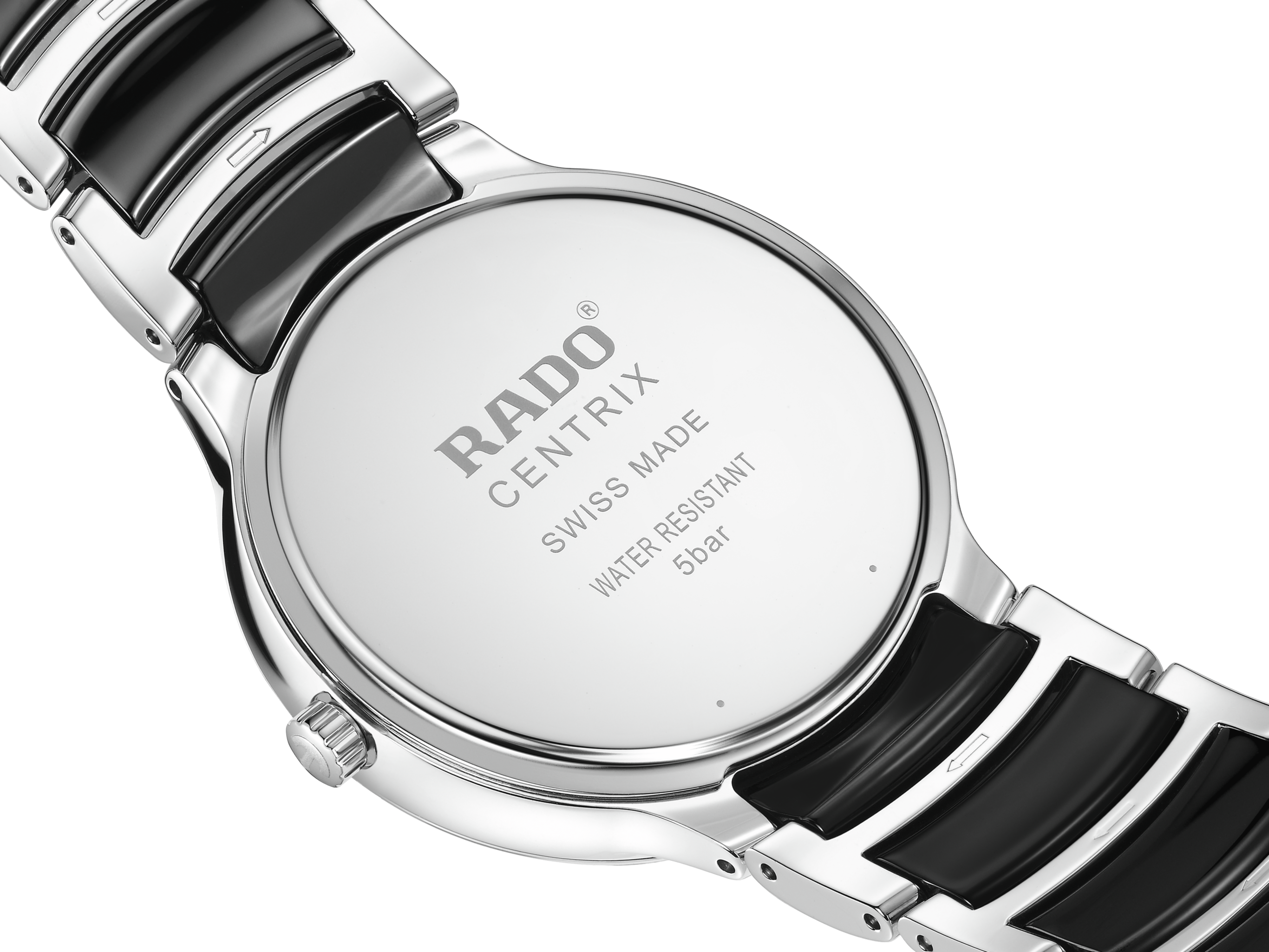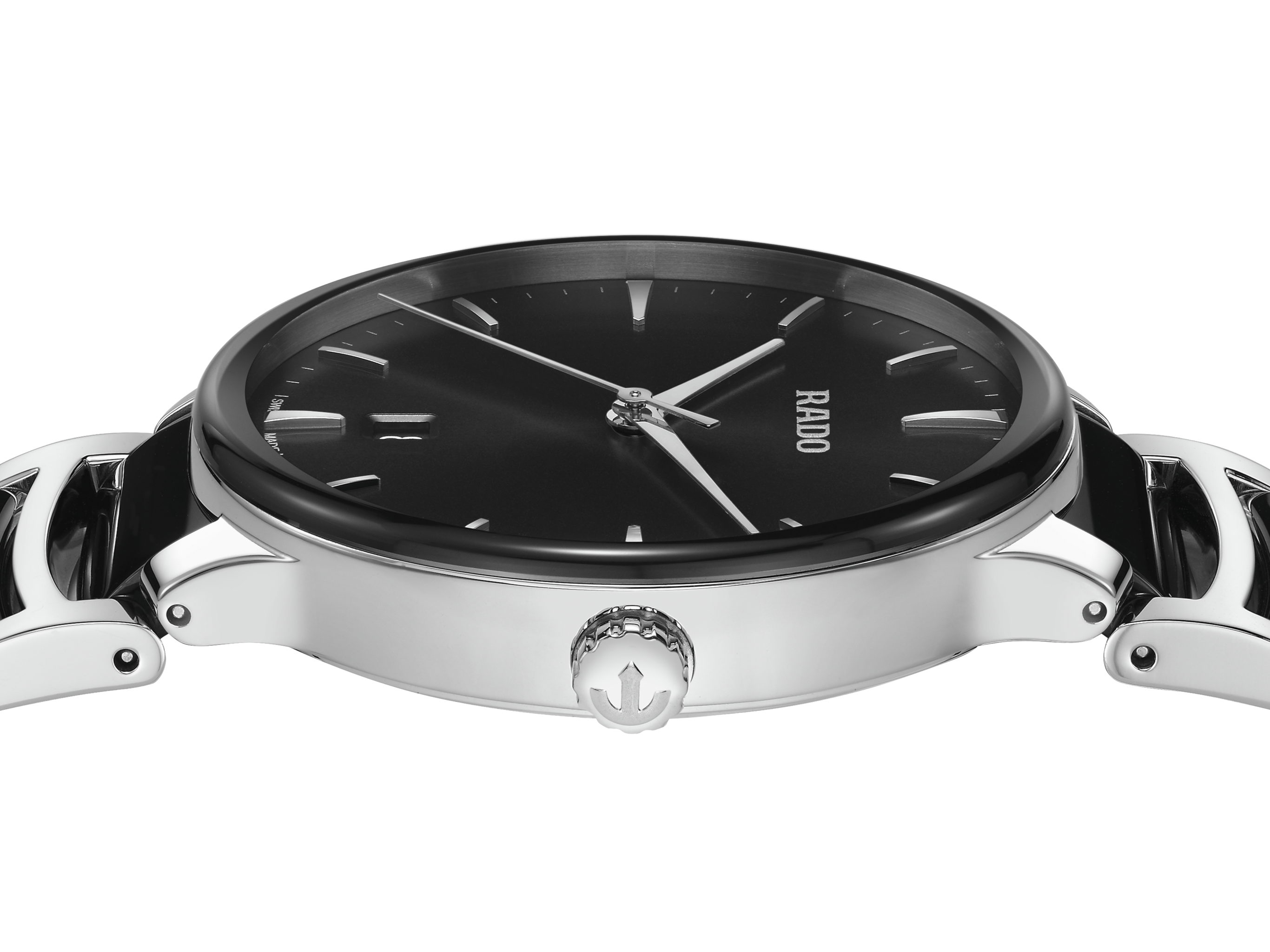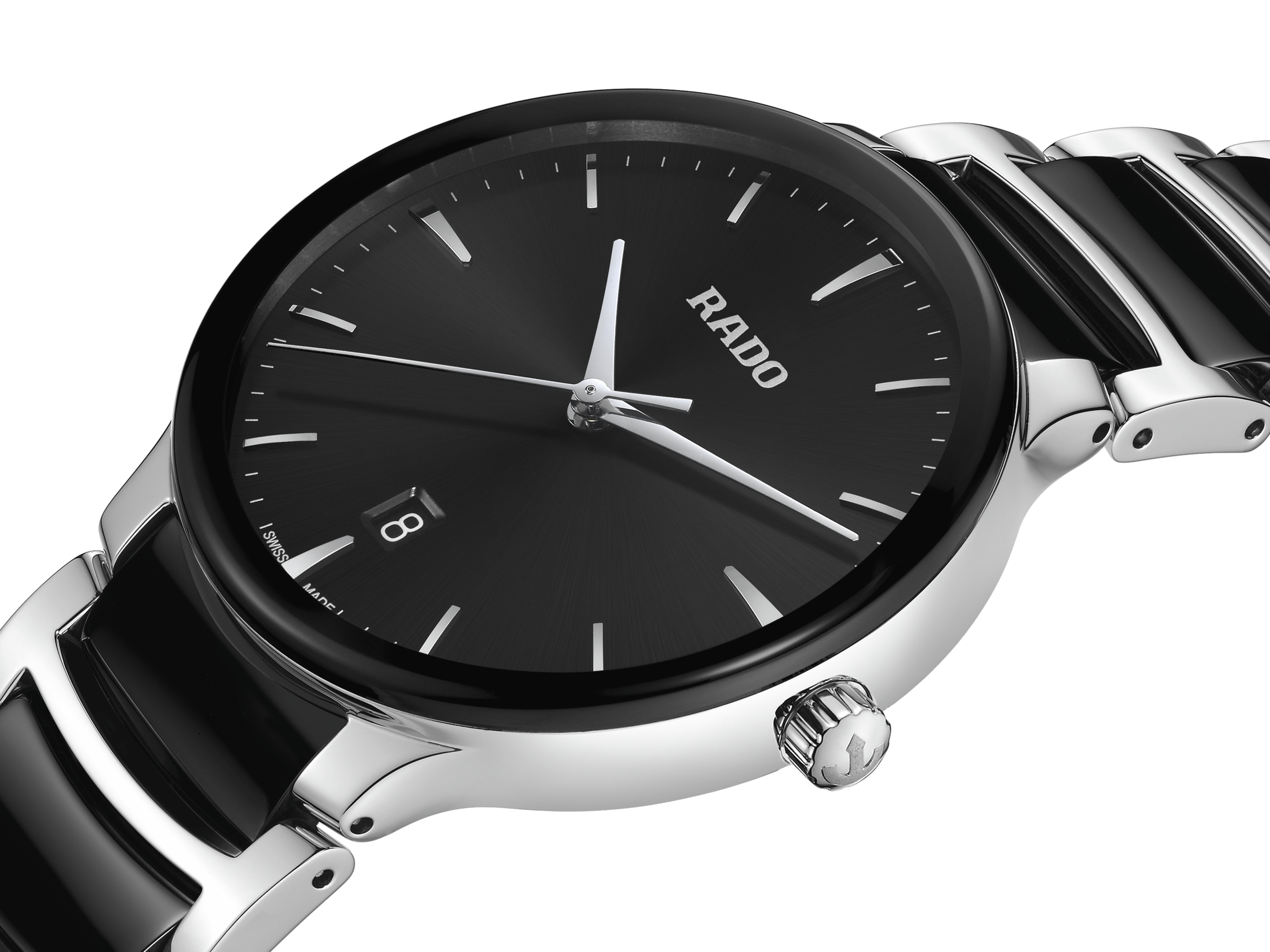 經典Centrix晶萃系列石英腕錶不僅在技術上進行調整,亦在美學上予以重新設計。改款後的錶款,擁有一個圓形的無邊框藍寶石水晶玻璃錶鏡,以及一個與弧形水晶邊緣渾然天成的弧形錶殼。全新改款後的錶耳和搭配黑色高科技陶瓷中央鏈節的拋光精鋼錶鏈,令這款經典時計的整體外觀更臻完美。黑色太陽紋錶盤搭配鍍銠時標,與銠色指針相得益彰。搭載PreciDrive和HeavyDrive技術的R073型石英機芯,讓腕錶具有更加優異的精準度和抗震性。腕錶防水深度達50公尺。