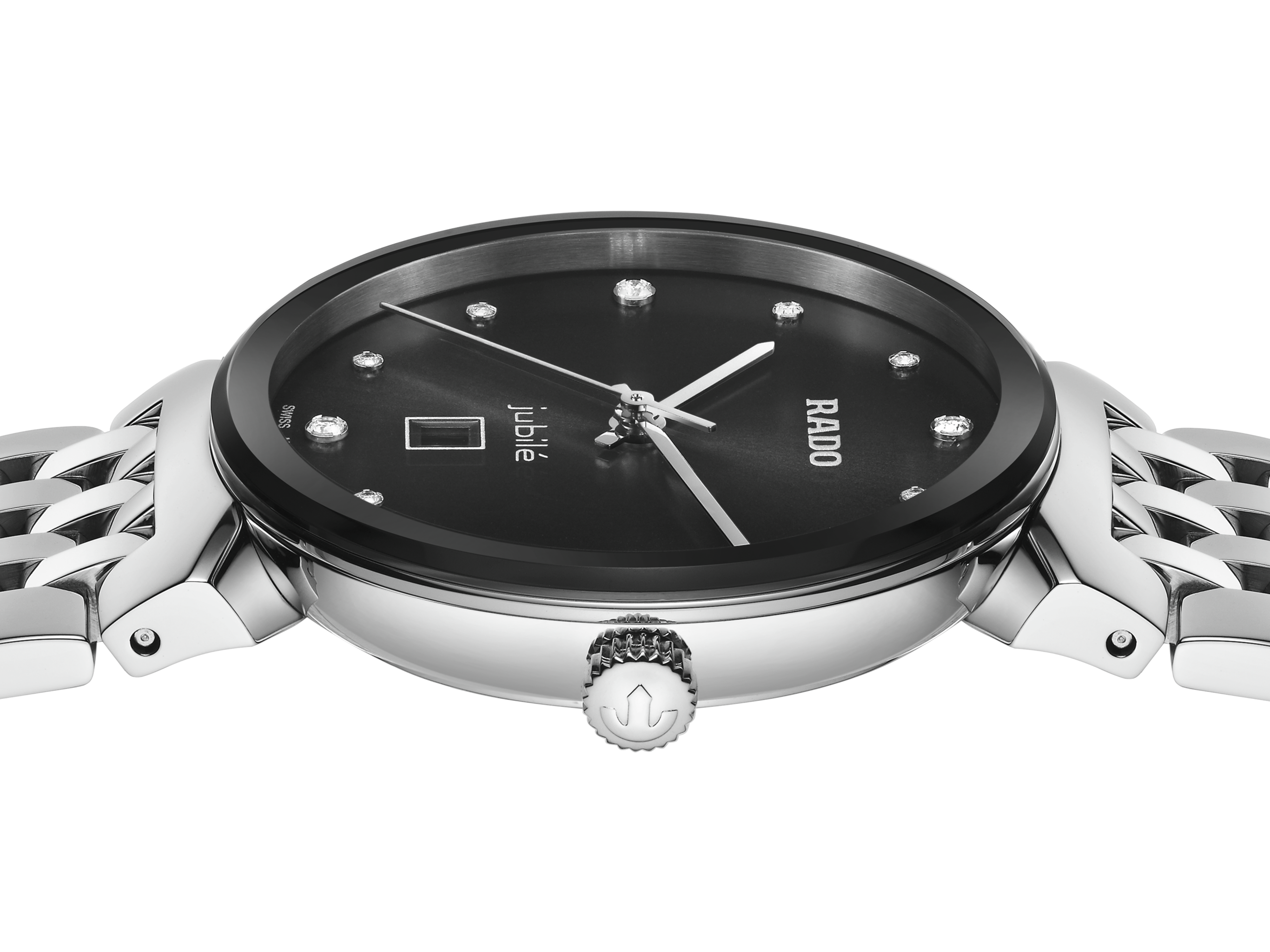 Rado瑞士雷達表Florence佛羅倫斯經典系列的和諧設計,令人想起腕錶命名城市的典雅圓頂和鐘塔。這款30毫米腕錶擁有無邊框弧形斜面藍寶石水晶玻璃錶鏡。錶殼、錶圈、錶冠和錶鏈均採用拋光精鋼製成。黑色太陽紋錶盤鑲嵌著12顆鑽石,印有「jubilé」標誌,與銠色指針完美搭配。搭載三針R079型石英機芯,讓腕錶具有更加優異的精度和抗震性。腕錶防水性能達50公尺。此外,另有大尺寸可供挑選,是理想的情侶款腕錶。
