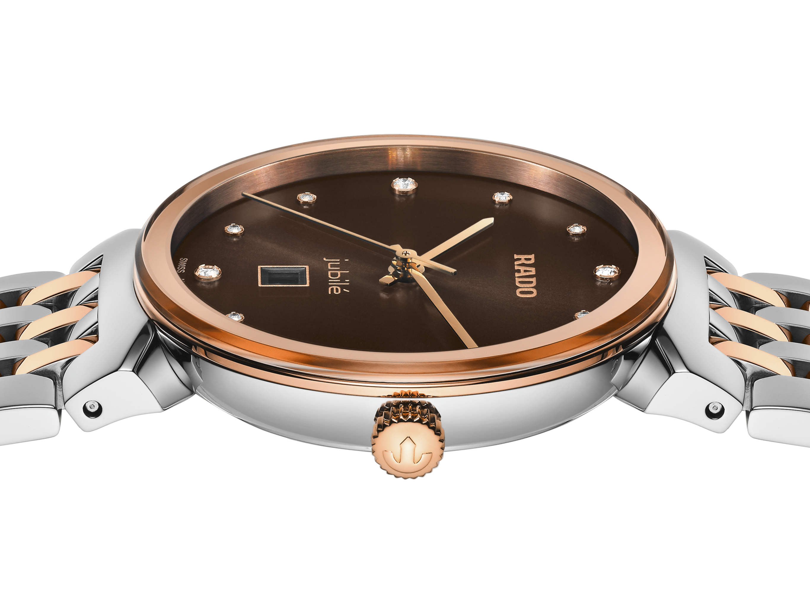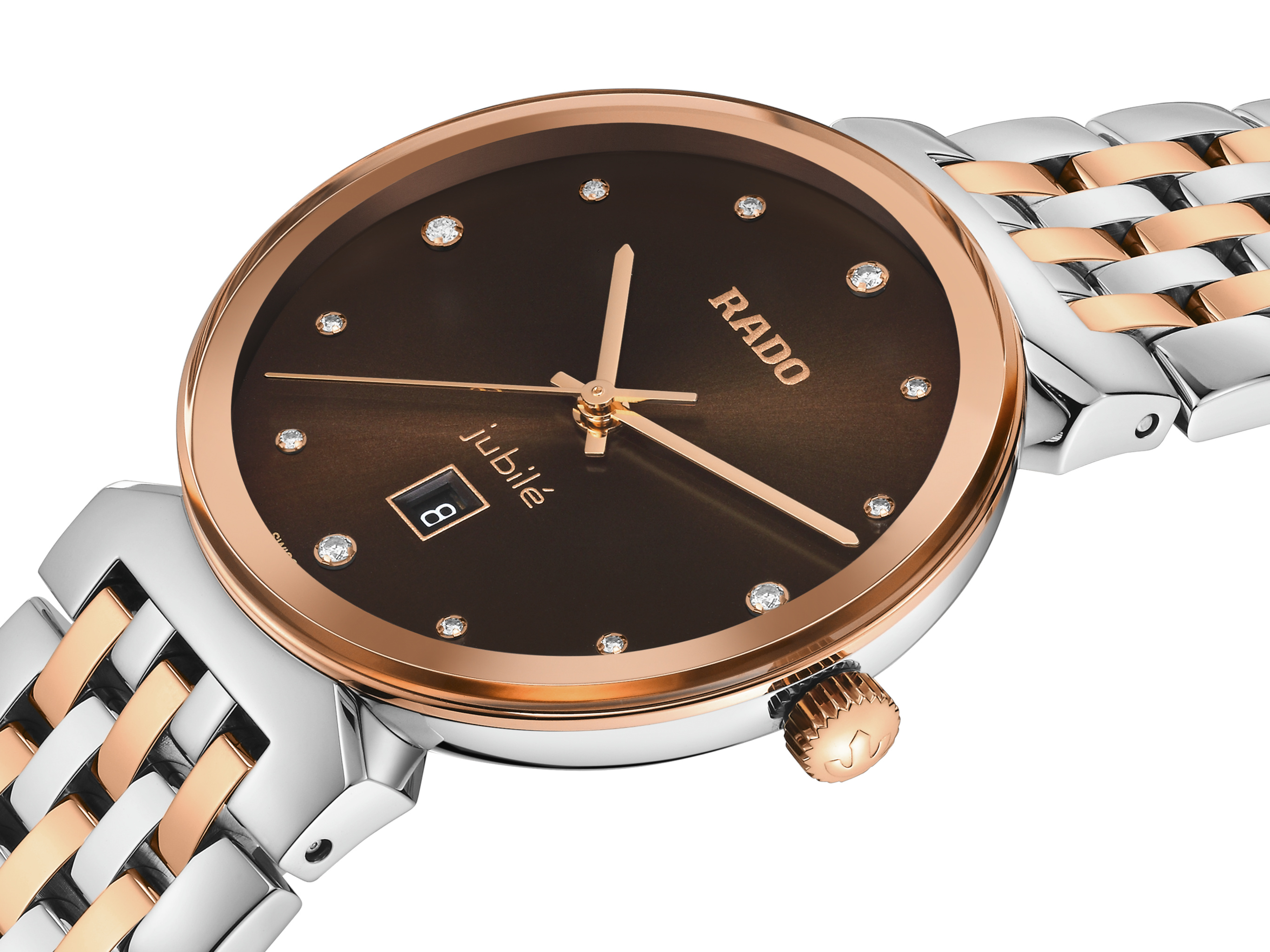 Rado瑞士雷達表Florence佛羅倫斯經典系列的和諧設計,令人想起腕錶命名城市的典雅圓頂和鐘塔。這款30毫米腕錶擁有無邊框弧形斜面藍寶石水晶玻璃錶鏡。採用拋光精鋼製成的錶鏈,搭配玫瑰金色中央鏈節,令這款經典時計的整體外觀更臻完美。棕色太陽紋錶盤鑲嵌著12顆鑽石,印有「jubilé」標誌,與玫瑰金色指針完美搭配。搭載三針R079型石英機芯,讓腕錶具有更加優異的精度和抗震性。腕錶防水性能達50公尺。此外,另有大尺寸可供挑選,是理想的情侶款腕錶。