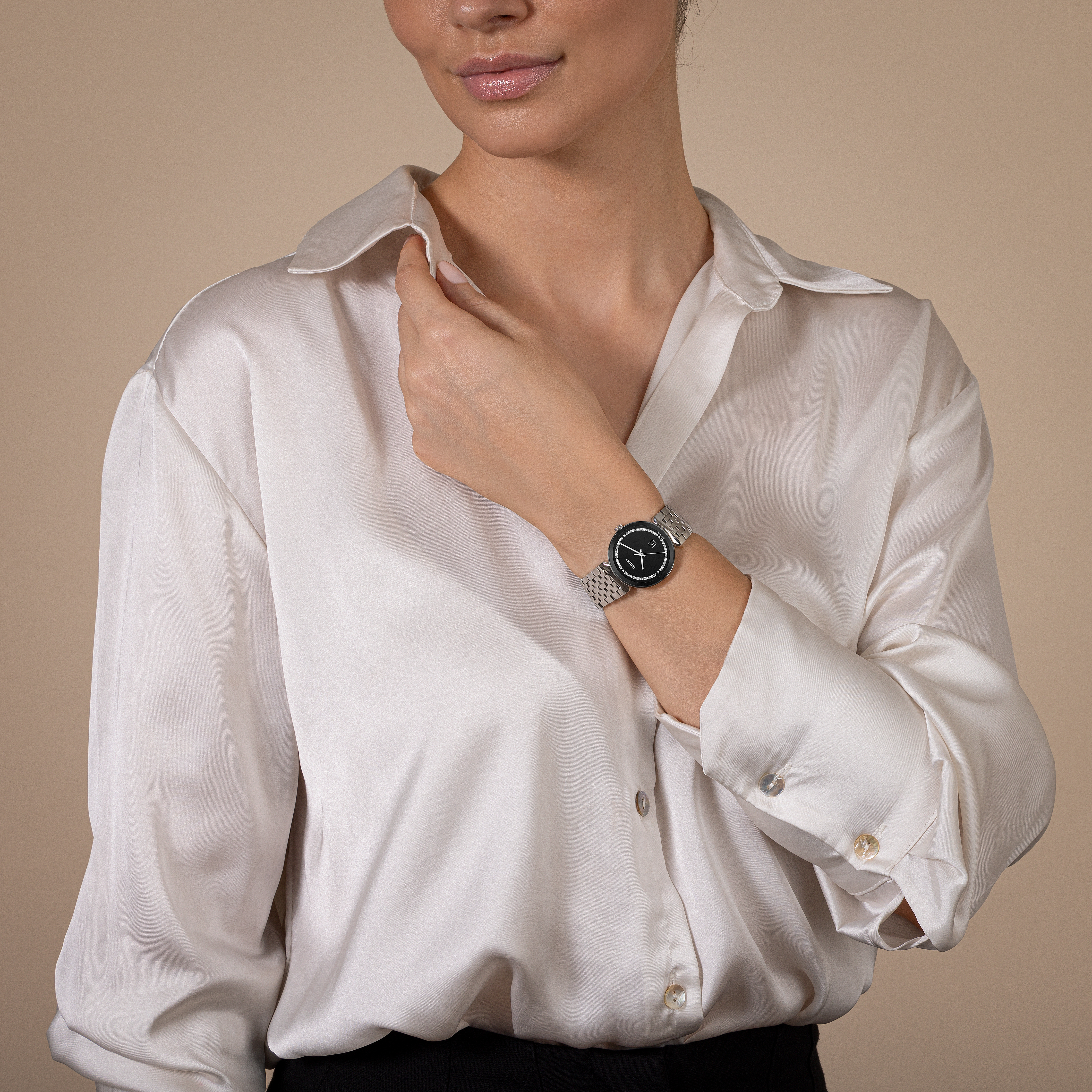 The harmonious design of the Rado Florence calls to mind the elegant domes and towers of the city from which the collection takes its name. Powered by a reliable three-hand Quartz Rado calibre R079 movement, this watch ensures greater accuracy and resistance to shocks. The 30 mm watch has an edge-to-edge-bevelled, curved sapphire crystal. The watch boasts a polished stainless steel case, crown, bezel and case back. The bracelet made of polished stainless steel completes the overall appearance of this classic timepiece. The black dial with rhodium glitter decoration, emphasised with the silver coloured printed “Rado” logo, matches perfectly with the rhodium coloured hands. The watch is water resistant down to 50 m and is also available in L size, which makes it an ideal couples’ watch.