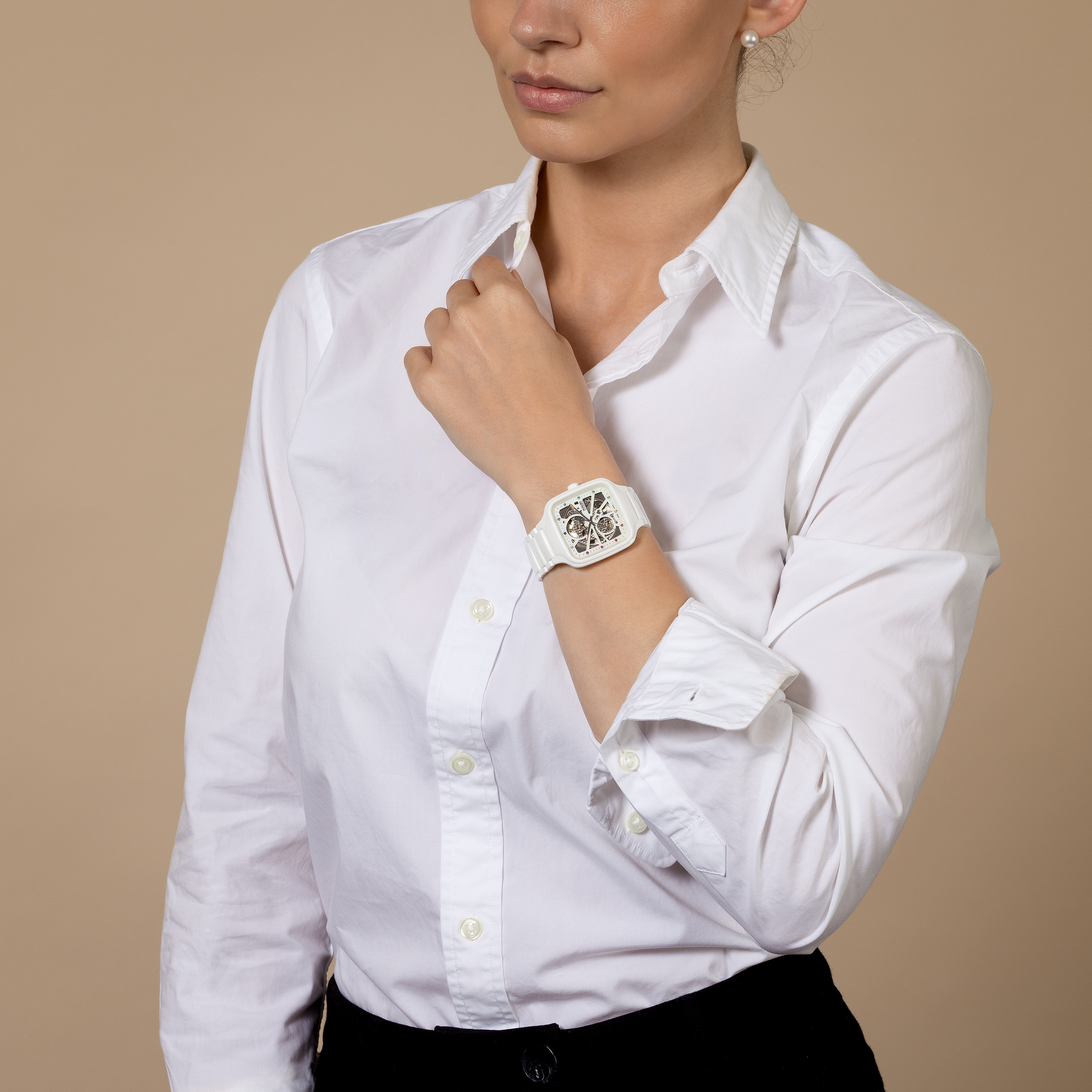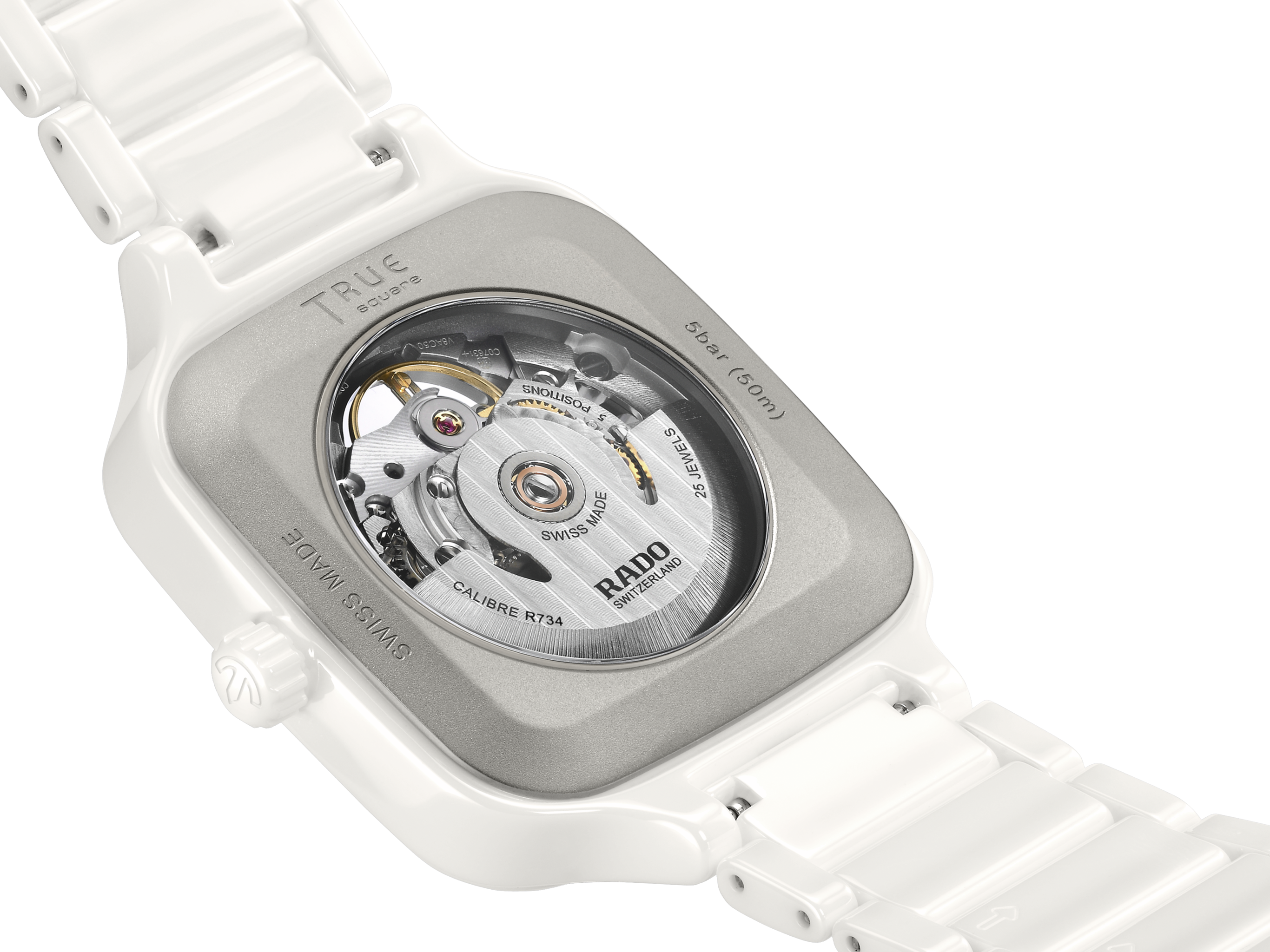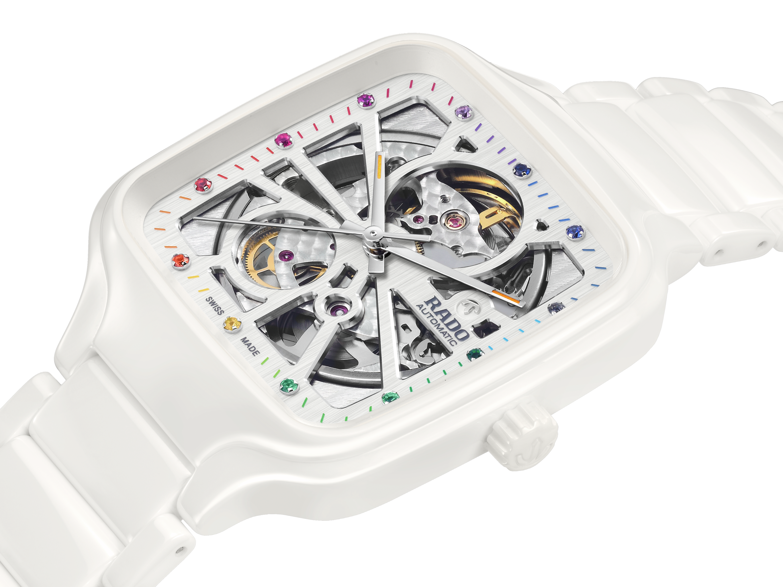 戴上Rado瑞士雷達表True Square真我方形系列鏤空自動腕錶,感受藝術與精準的融合之美。這款超卓非凡的腕錶採用令人目眩神迷的開芯設計,佩戴者能夠巧妙地欣賞Rado瑞士雷達表R734型自動機芯的精妙細節。機芯動力儲存長達80小時。拋光白色高科技陶瓷的38毫米錶殼與錶冠,散發著時尚現代的迷人魅力。選用雙面防反光平面藍寶石水晶錶鏡,令腕錶擁有出色的清晰度。白色錶盤飾有銠色倒角。12顆彩色寶石更增添一抹色彩與奢華氣息。寶石與錶盤形成鮮明對比,散發眩目色彩,效果尤其令人印象深刻。銠色指針搭配橙色Super-LumiNova®夜光塗層,除了確保清晰讀時,更讓腕錶多了幾分優雅。拋光白色高科技陶瓷錶鏈舒適耐用,令腕錶更臻完美。