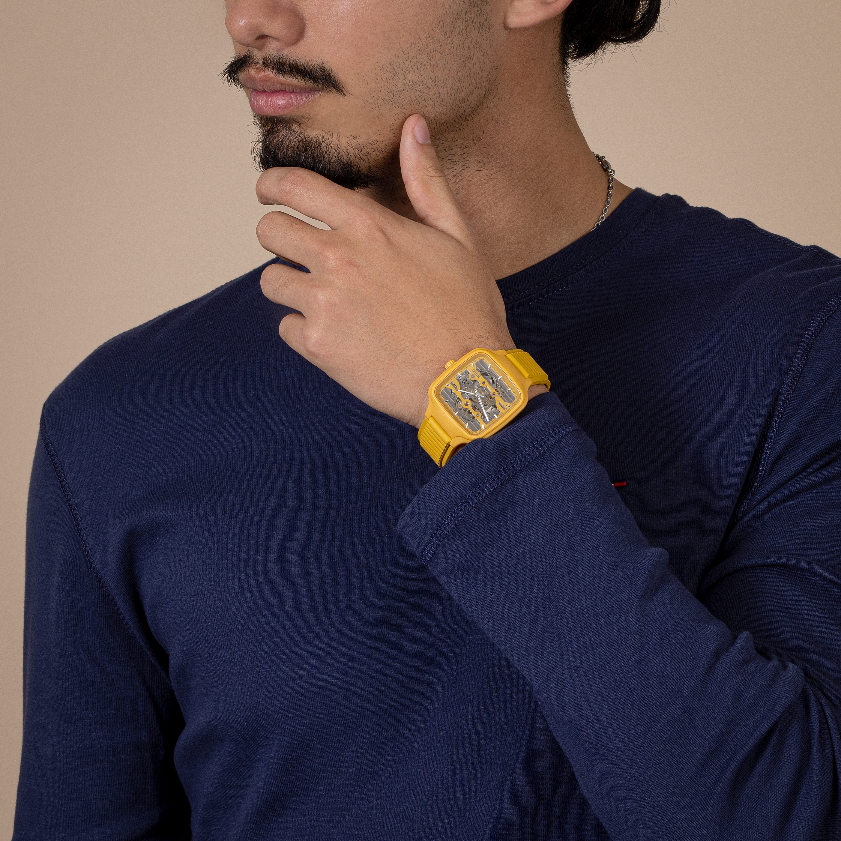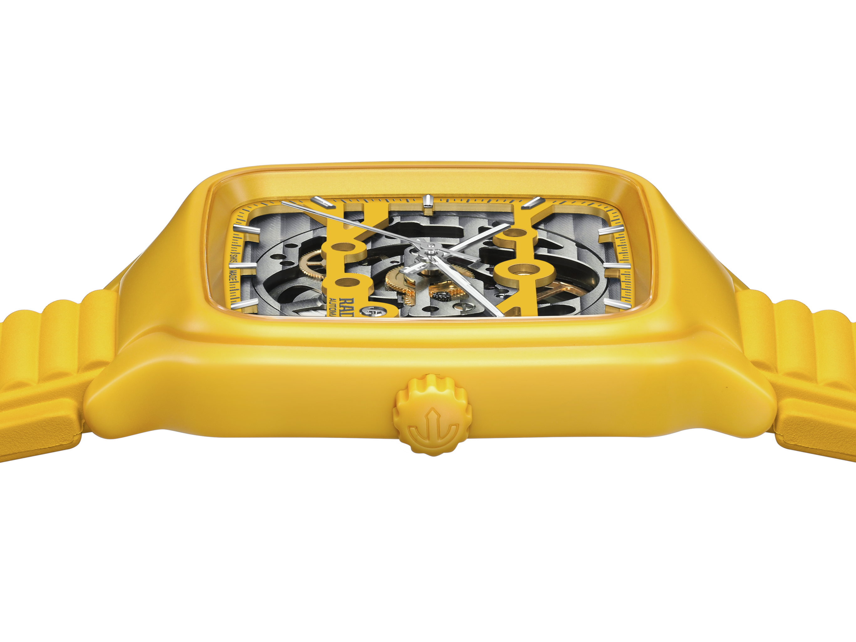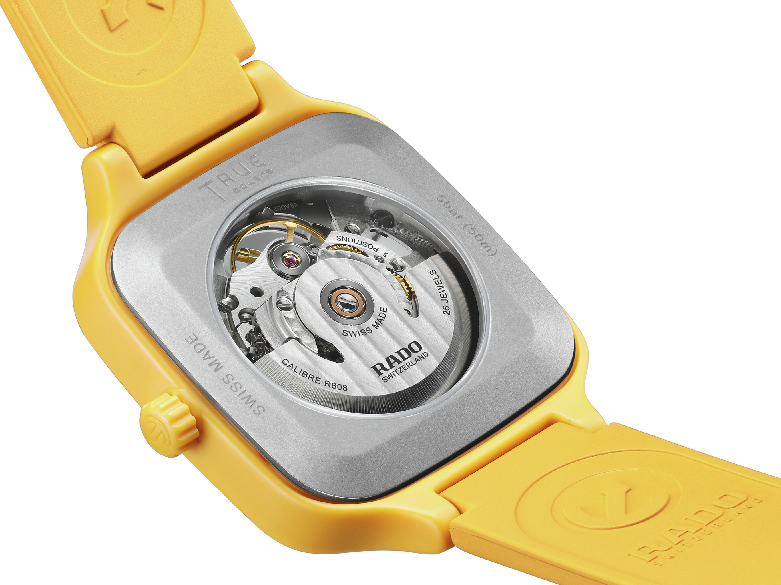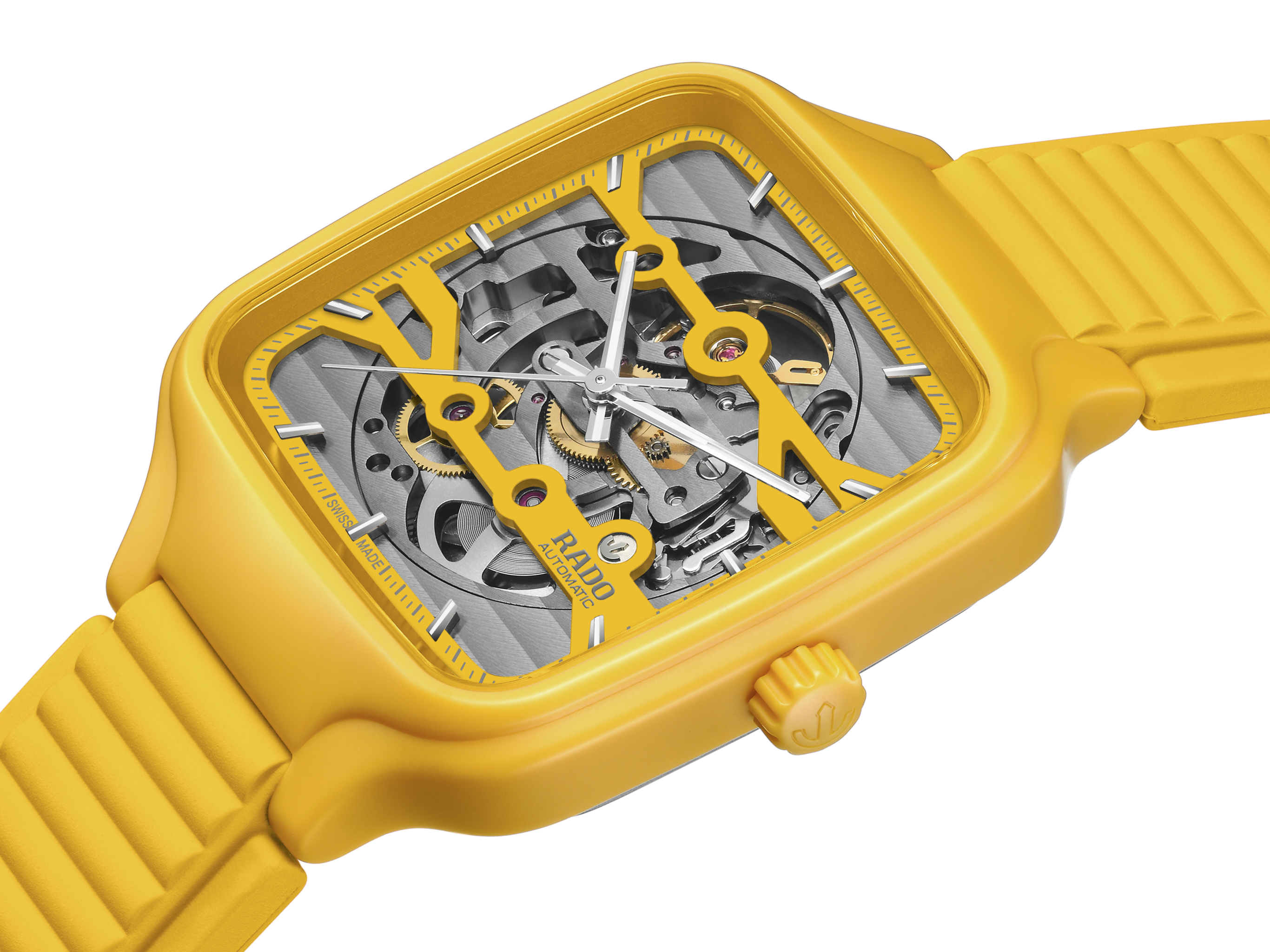 戴上True Square真我系列鏤空腕錶,感受藝術與精準的融合之美。R808型鏤空機芯和雙層錶盤引人注目,與機芯融為一體。這款技術先進的機芯擁有出色的精度,高度可靠的NivachronTM游絲可增強對磁場的抵抗力,動力儲存長達80小時。鏤空錶盤配有精緻的時標和銠色時/分/秒針,並覆有白色Super-LumiNova®夜光塗層,確保在低光源條件下依然能夠清晰讀時。True Square真我系列鏤空腕錶擁有38毫米整體式構造拋光黃色高科技陶瓷錶殼,搭配黃色橡膠錶帶,充分展現Rado瑞士雷達表的迷人設計特色。