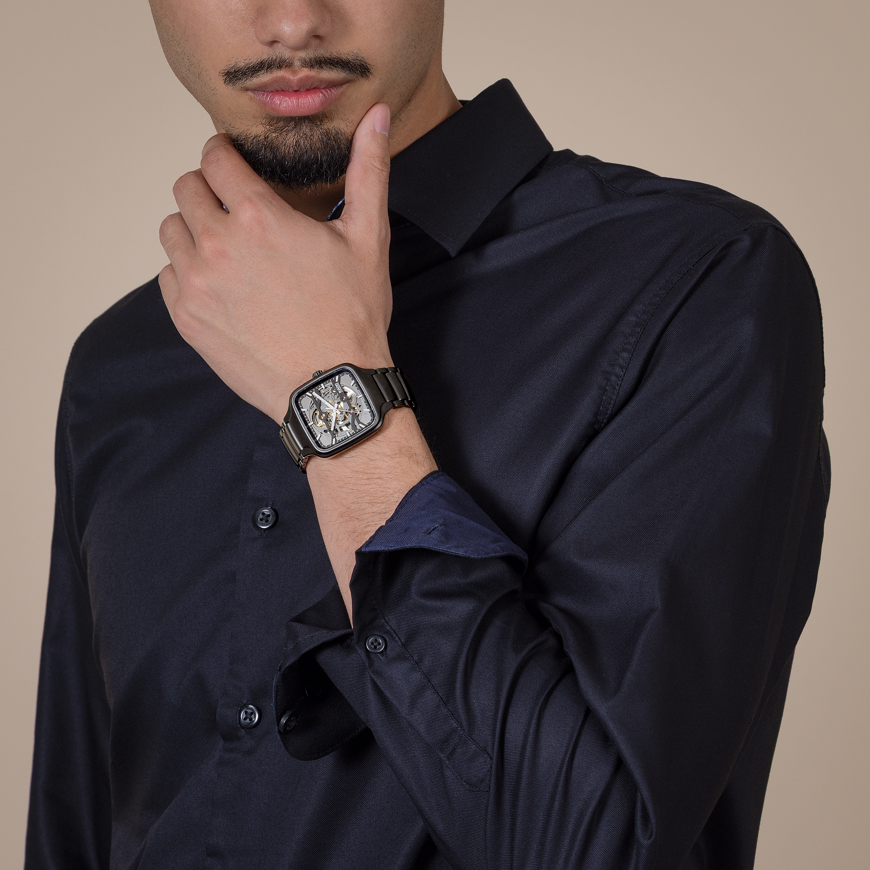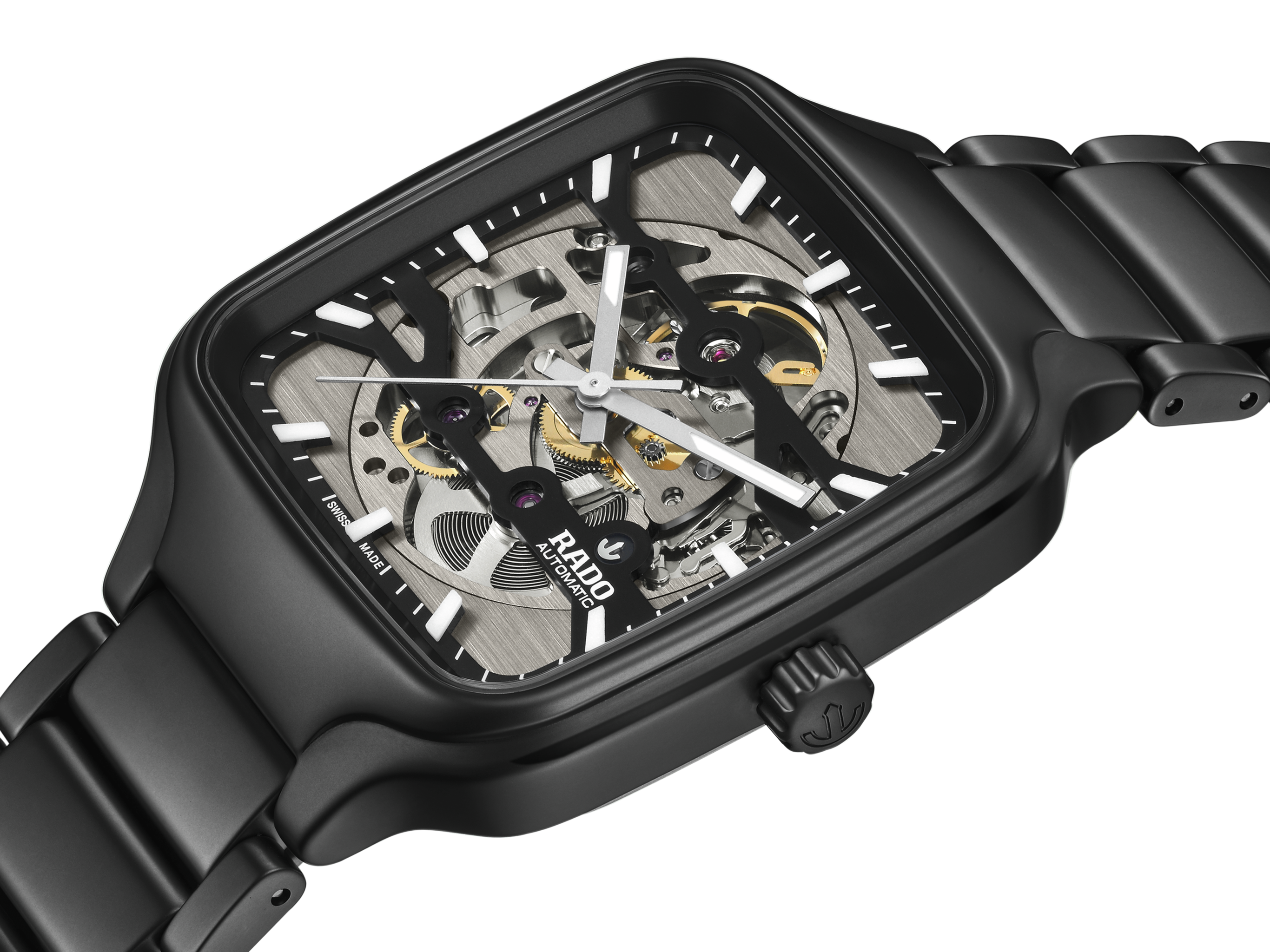 Rado瑞士雷達表True Square真我方形系列鏤空錶款完美融合尖端高科技材質與精湛工藝。 38毫米啞光黑色高科技陶瓷整體式構造錶殼內,搭載R808鏤空機芯,擁有25顆寶石,並提供80小時動力儲存。機芯經五個方位測試,配備Nivachron™防磁游絲,錶盤側面採用水平拉絲裝飾,充分展現瑞士製錶精準技術的巔峰成就。 平面藍寶石水晶錶鏡覆蓋錶盤,層次結構堪稱工藝美學的交響曲。黑色噴砂鏤空頂板懸浮於底板之上。頂板上,白色Super-LumiNova®刻度與精緻印製的白色分鐘刻度排列有序,與深色背景形成鮮明對比,清晰可讀。底板採用細膩的水平拉絲裝飾,與機芯設計渾然天成。 4點鐘位置的標誌性旋轉銠色可擺動錨型標誌,為這一動感多層次錶盤畫龍點睛。 啞光黑色高科技陶瓷錶鏈與錶殼相得益彰,無縫融入鈦金屬三折式錶扣,呈現高科技陶瓷無可比擬的佩戴舒適性。
