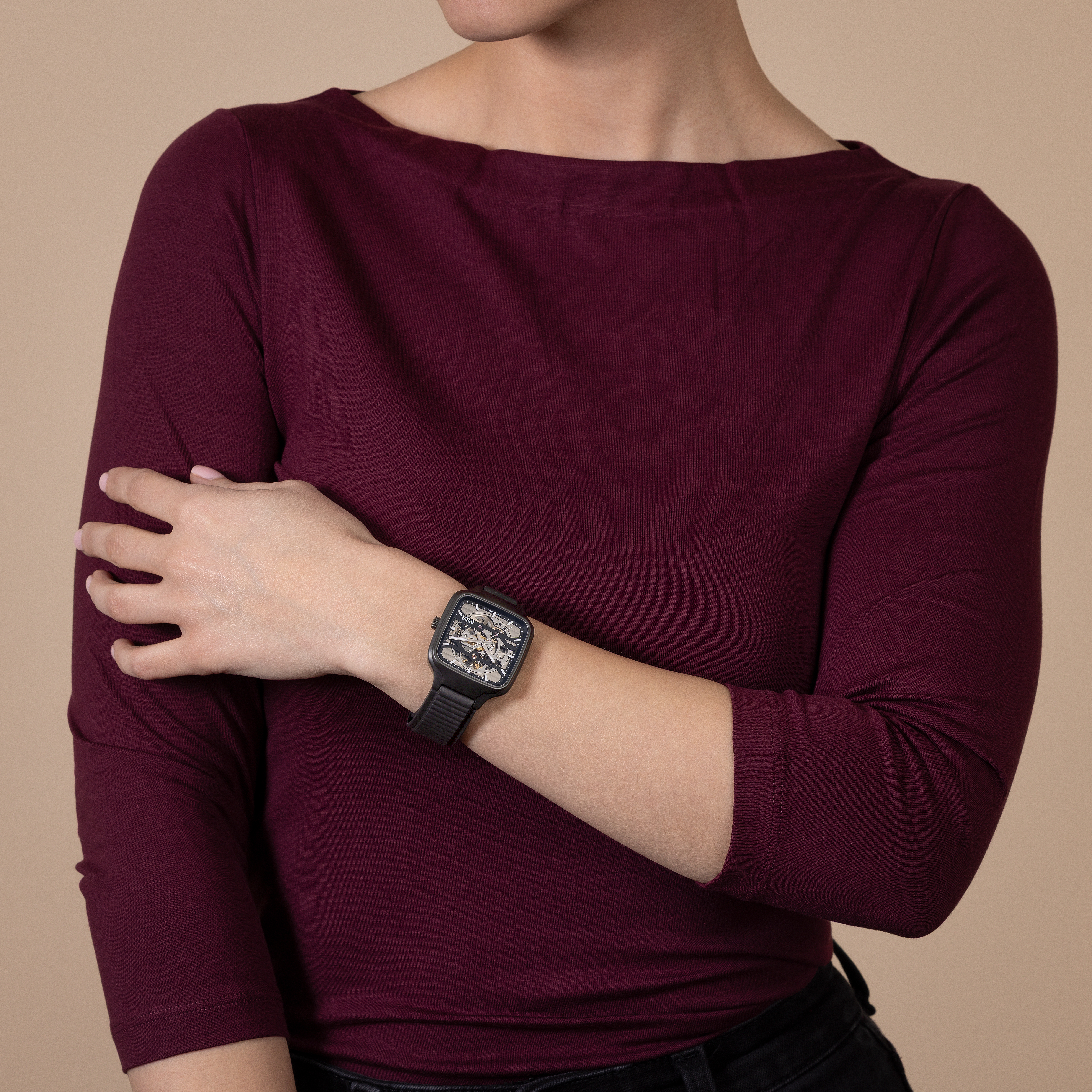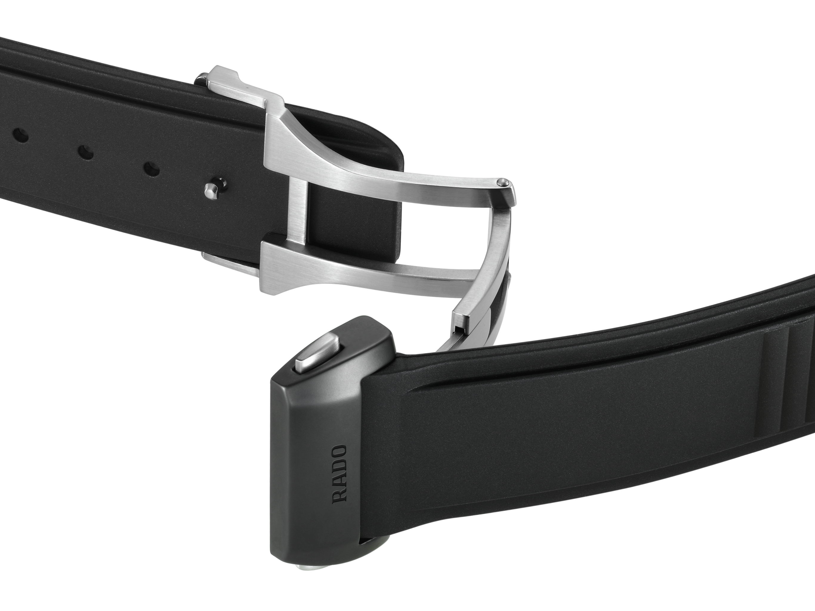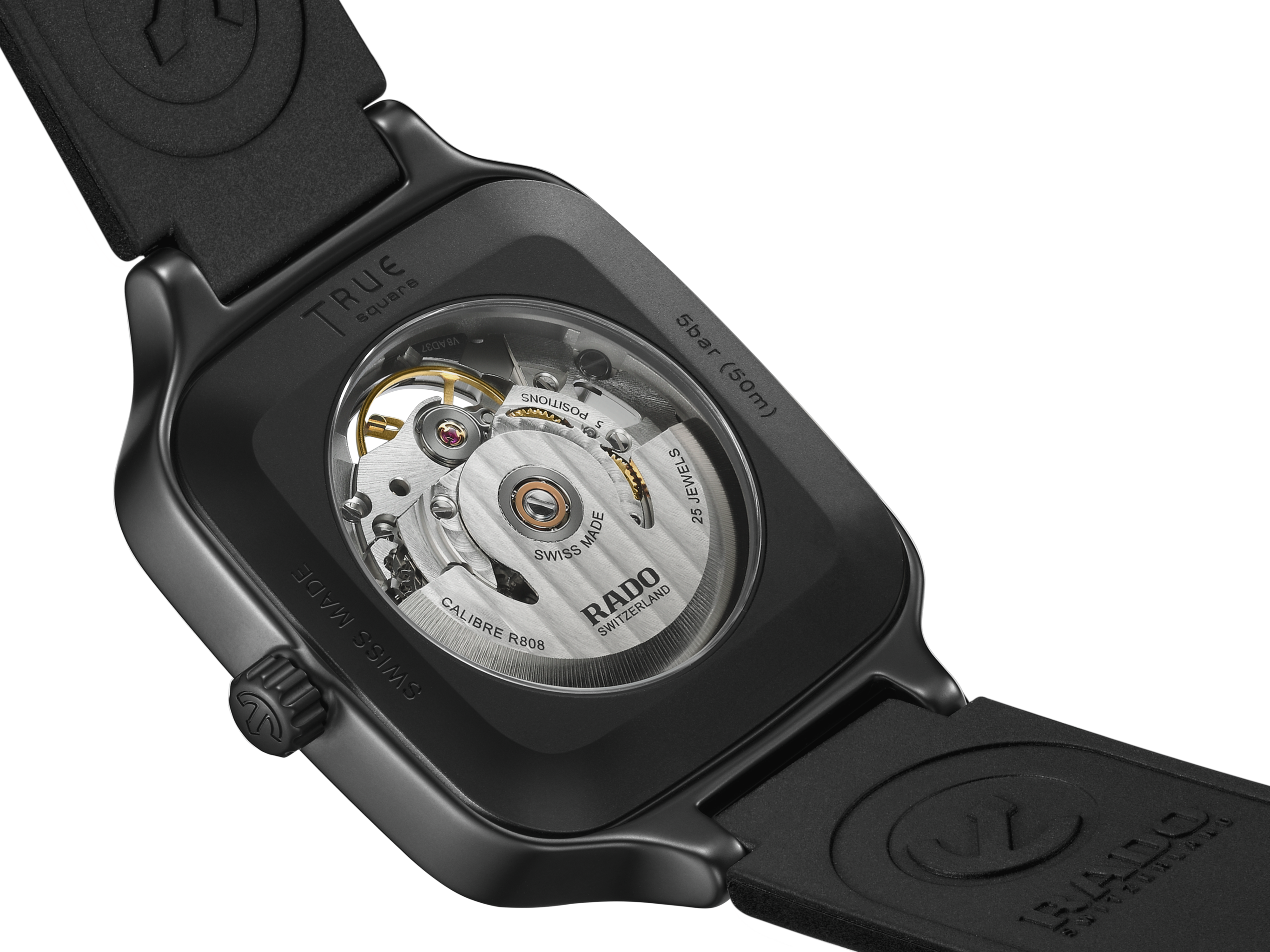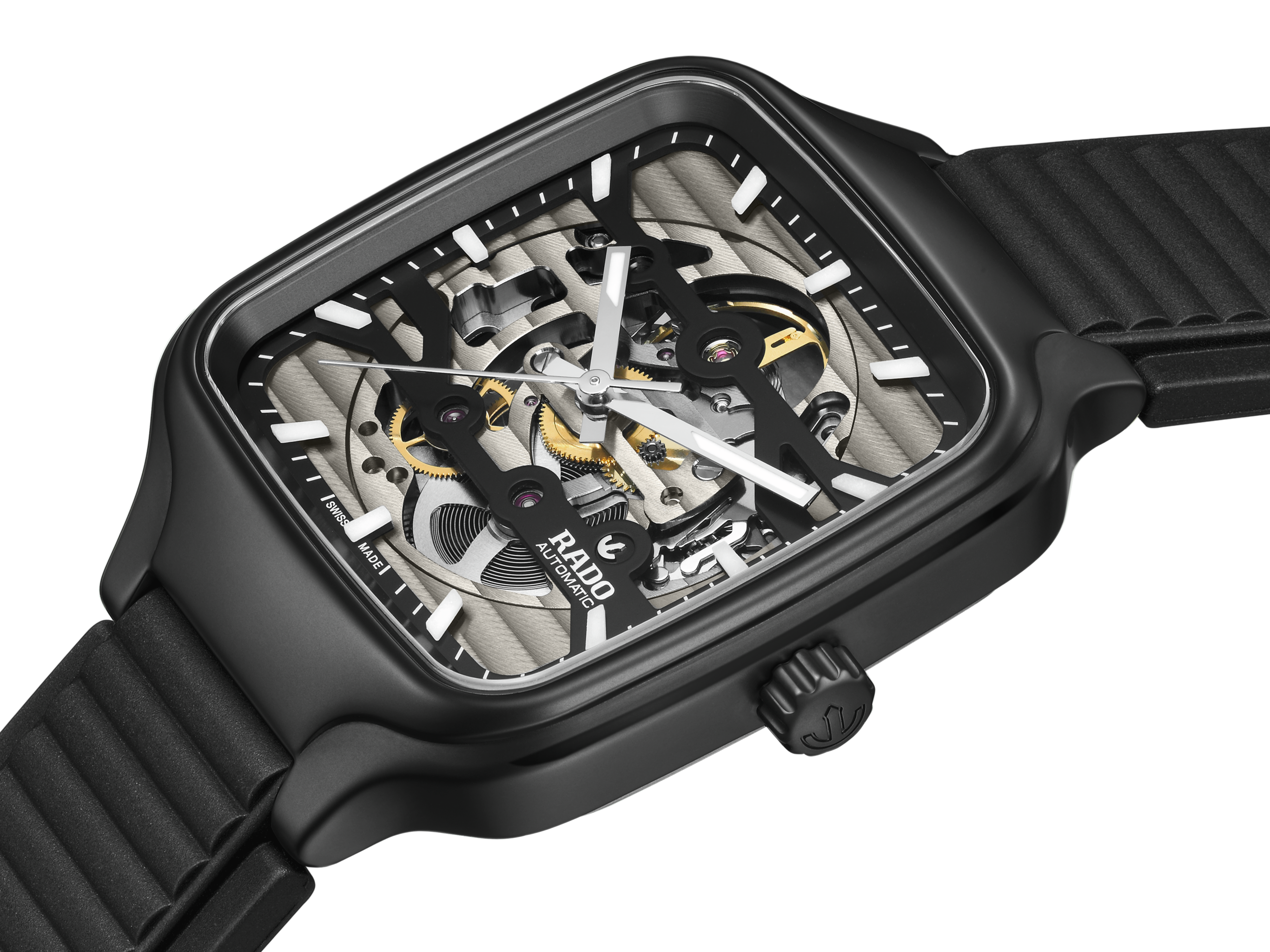 Rado瑞士雷達表True Square真我方形系列鏤空錶款完美融合尖端高科技材質與精湛工藝。 38毫米啞光黑色高科技陶瓷整體式構造錶殼內,搭載R808鏤空機芯,擁有25顆寶石,並提供80小時動力儲存。機芯經五個方位測試,配備Nivachron™防磁游絲,錶盤側面採用水平日內瓦條紋裝飾,充分展現瑞士製錶精準技術的巔峰成就。 平面藍寶石水晶錶鏡覆蓋錶盤,層次結構堪稱工藝美學的交響曲。黑色噴砂鏤空頂板懸浮於底板之上。頂板上,白色Super-LumiNova®刻度與精緻印製的白色分鐘刻度排列有序,與深色背景形成鮮明對比,清晰可讀。底板採用細膩的水平日內瓦條紋裝飾,與機芯設計渾然天成。4點鐘位置的標誌性旋轉銠色可擺動錨型標誌,為這一動感多層次錶盤畫龍點睛。 黑色橡膠錶帶與錶殼相得益彰,無縫融入精鋼可伸縮摺疊錶扣,搭配啞光高科技陶瓷扣面。