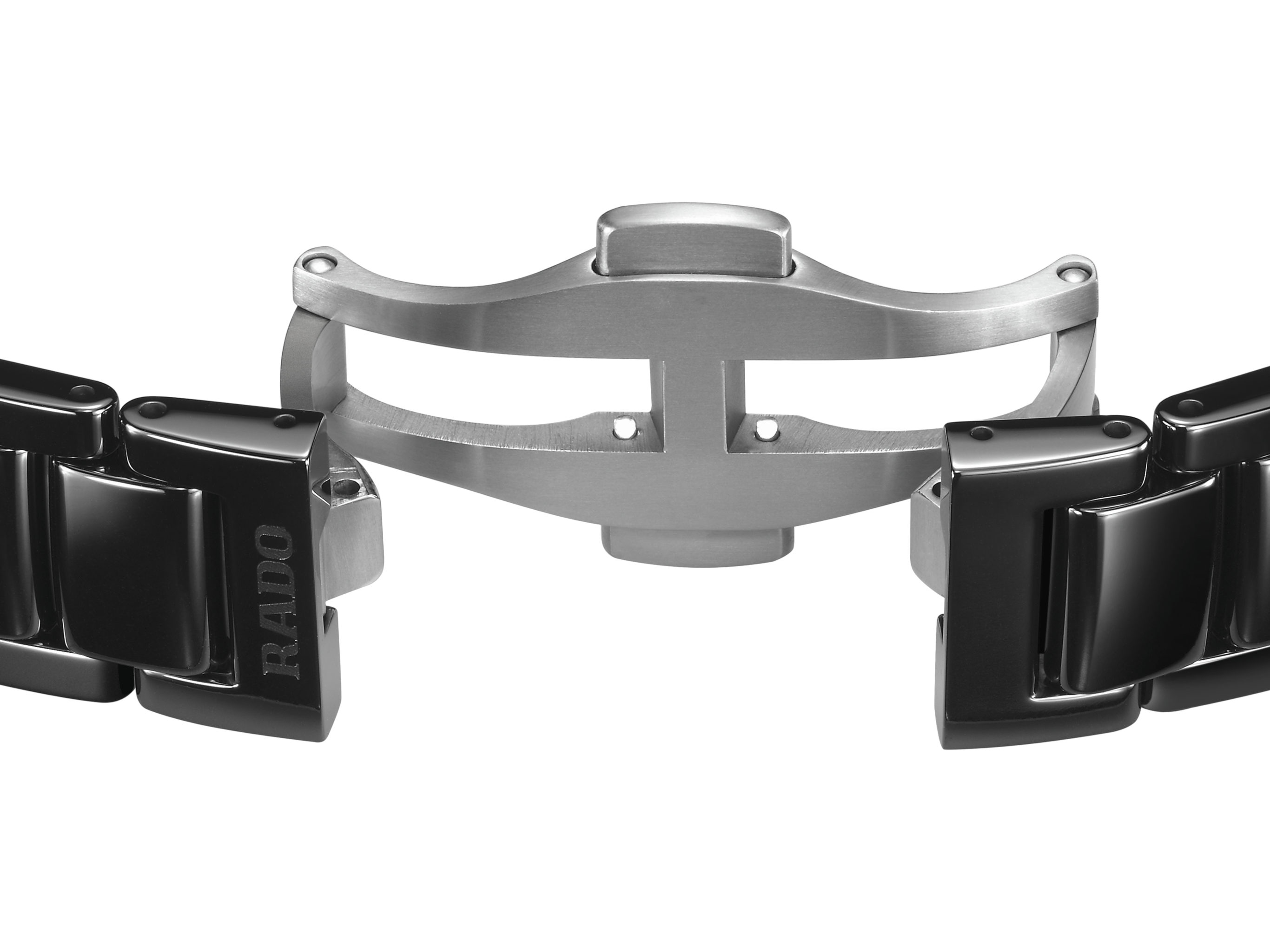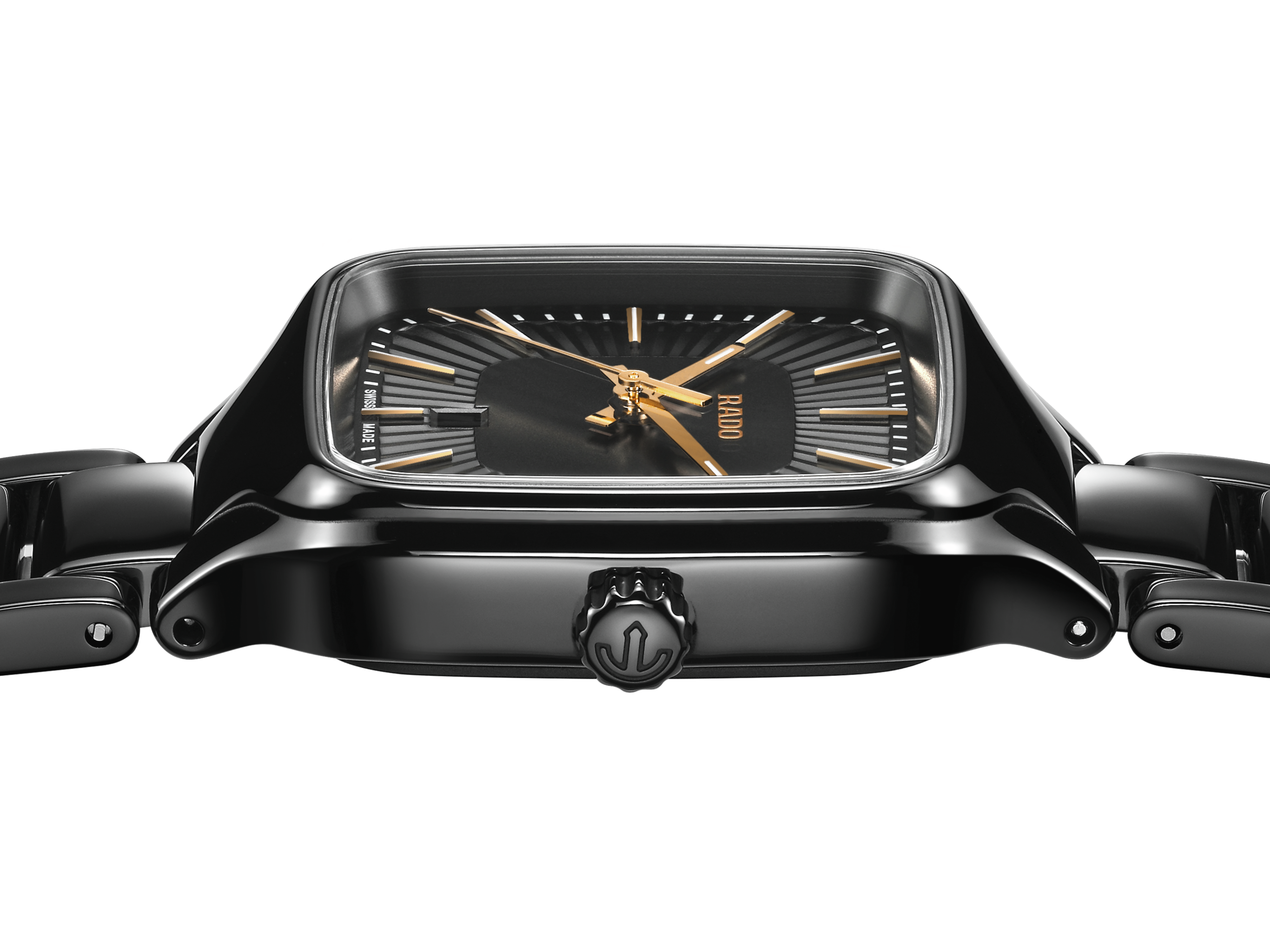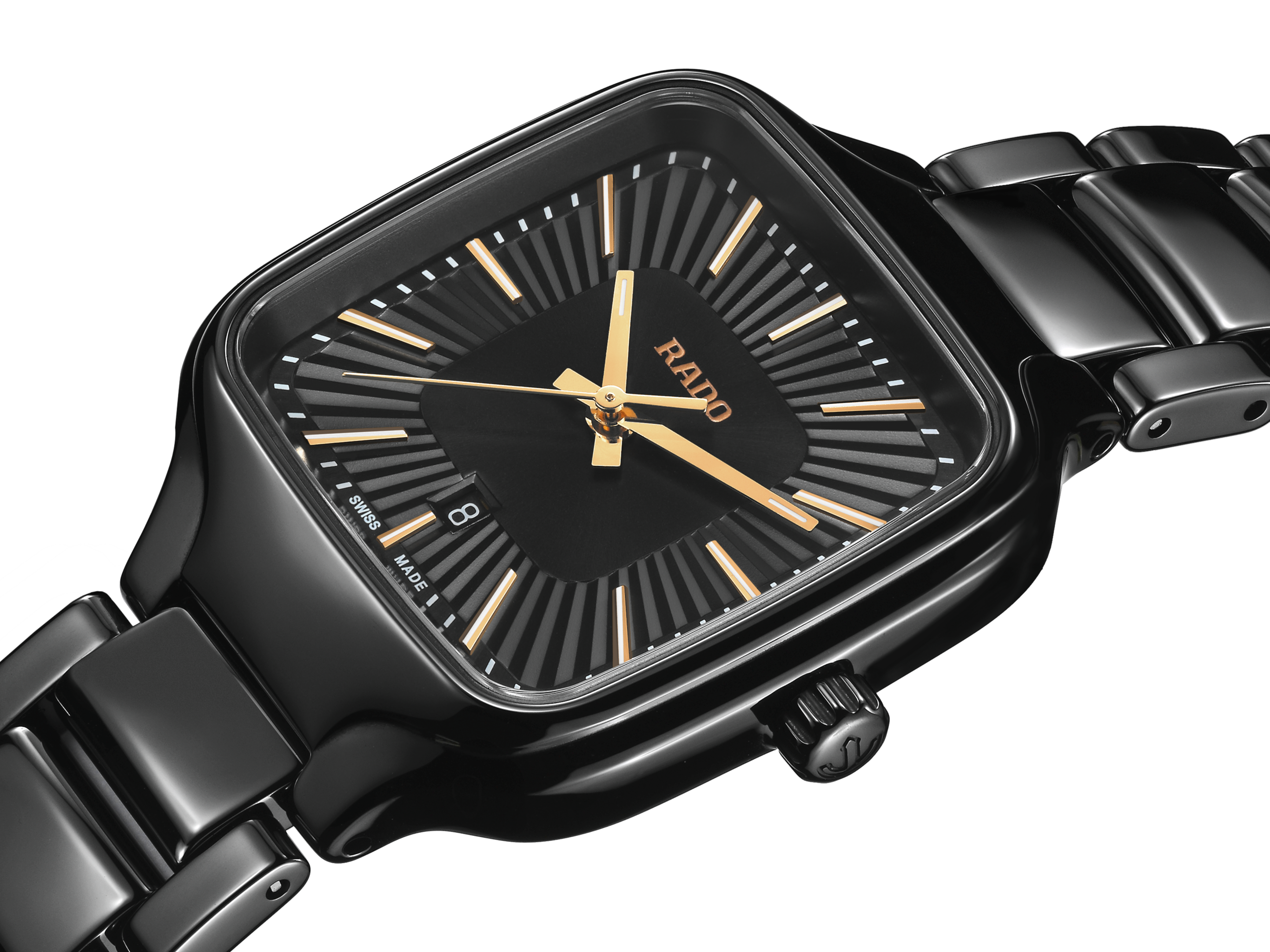 True Square真我方形系列腕錶直徑29毫米,搭載拋光黑色高科技陶瓷錶殼和錶冠,以及平面藍寶石水晶錶鏡。得益於Rado R079石英機芯,腕錶走時精準可靠。玫瑰金色指針和覆有白色Super-LumiNova®夜光塗層的時標,完美搭配帶有黑色放射狀壓印設計細節的錶盤。腕錶防水性能達5巴。黑色拋光高科技陶瓷錶鏈,搭配三折式鈦金屬錶扣,確保True Square真我方形系列腕錶佩戴舒適。