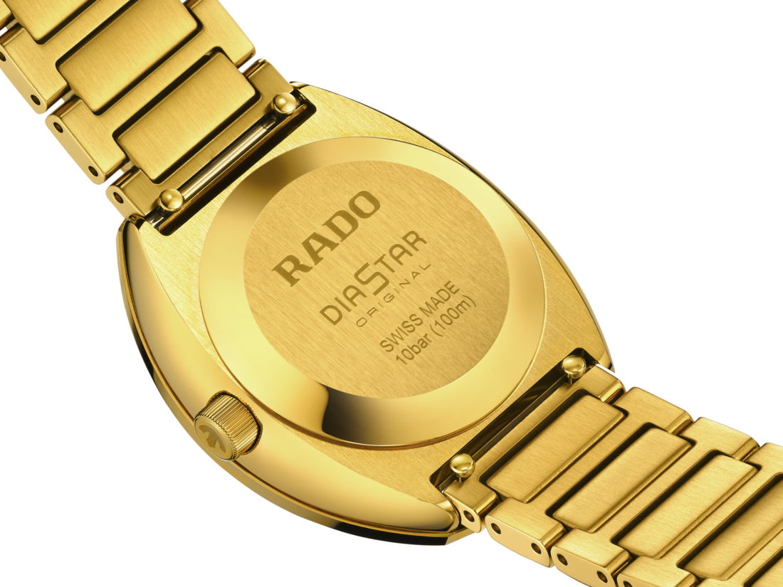 Ein legendäres Symbol für Schweizer Handwerkskunst und bahnbrechende Innovation: Die Rado DiaStar wurde für alle entworfen, die das Aussergewöhnliche schätzen. Das 30 mm grosse Gehäuse wird von einer Lünette aus poliertem gelbgoldfarbenen Ceramos™ mit PVD-Beschichtung gekrönt. Es geht nahtlos in ein Mittelgehäuse aus poliertem gelbgoldfarbenen PVD-Edelstahl über und ist bis zu 10 bar (100 Meter) wasserdicht. Das Zifferblatt zeigt ein gelbes, harmonisches Muster auf einer Diamantpulverstruktur in Kombination mit 11 kubischen Zirkonia-Steinen in einer gelben Fassung, die ein elegantes Lichtspiel werfen. Der charakteristische, goldfarbene bewegliche Anker und das präzise bei 6 Uhr gesetzte Datumsfenster setzen stilvolle Akzente. Gelbgoldfarbene Zeiger mit weissem Super-LumiNova® sorgen für eine jederzeit perfekte Ablesbarkeit. Das raffinierte Zifferblatt wird durch ein vertikal facettiertes Saphirglas mit Antireflexionsbeschichtung auf der Innenseite geschützt. Herzstück der Uhr ist das Automatikwerk Kaliber R586. Das in fünf Lagen fein justierte Uhrwerk ist mit einer Nivachron™ Spiralfeder ausgestattet und bietet eine hohe Ganggenauigkeit sowie eine Gangreserve von 48 Stunden. Das Design dieses legendären Zeitmessers wird durch ein Edelstahlarmband abgerundet, das polierte Glieder mit satinierten Mittelgliedern aus gelbgoldfarbenen PVD-Edelstahl kombiniert. Für sicheren Halt sorgt eine Dreifach-Faltschliesse aus poliertem Edelstahl.