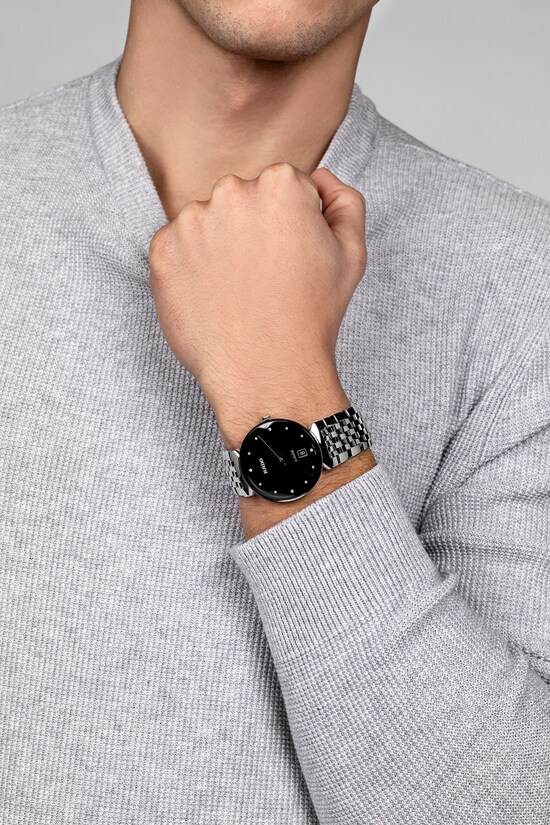 Das harmonische Design der Rado Florence Classic ruft einem die eleganten Kuppeln und Türme der Stadt in Erinnerung, der die Kollektion ihren Namen zu verdanken hat. Die 38 mm grosse Uhr verfügt über ein gewölbtes Saphirglas mit facettierten Rändern. Gehäuse, Lünette, Krone und Armband sind aus poliertem Edelstahl gefertigt. Das schwarze Zifferblatt mit Sonnenschliff und 12 Diamanten wird durch das per Druck aufgetragene Jubilé-Logo noch besser zur Geltung gebracht und ist perfekt auf die rhodiumfarbenen Zeiger abgestimmt. Dank ihres R073 Quarzwerks mit drei Zeigern zeichnet sich die Uhr durch eine grössere Genauigkeit und Stossfestigkeit aus. Die Uhr ist bis zu einer Tiefe von 50 m wasserdicht und auch in Grösse S erhältlich – damit ist sie die perfekte Paar-Uhr.
