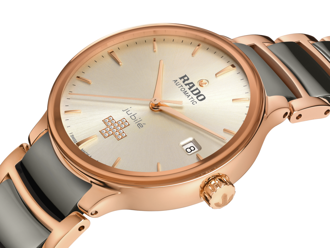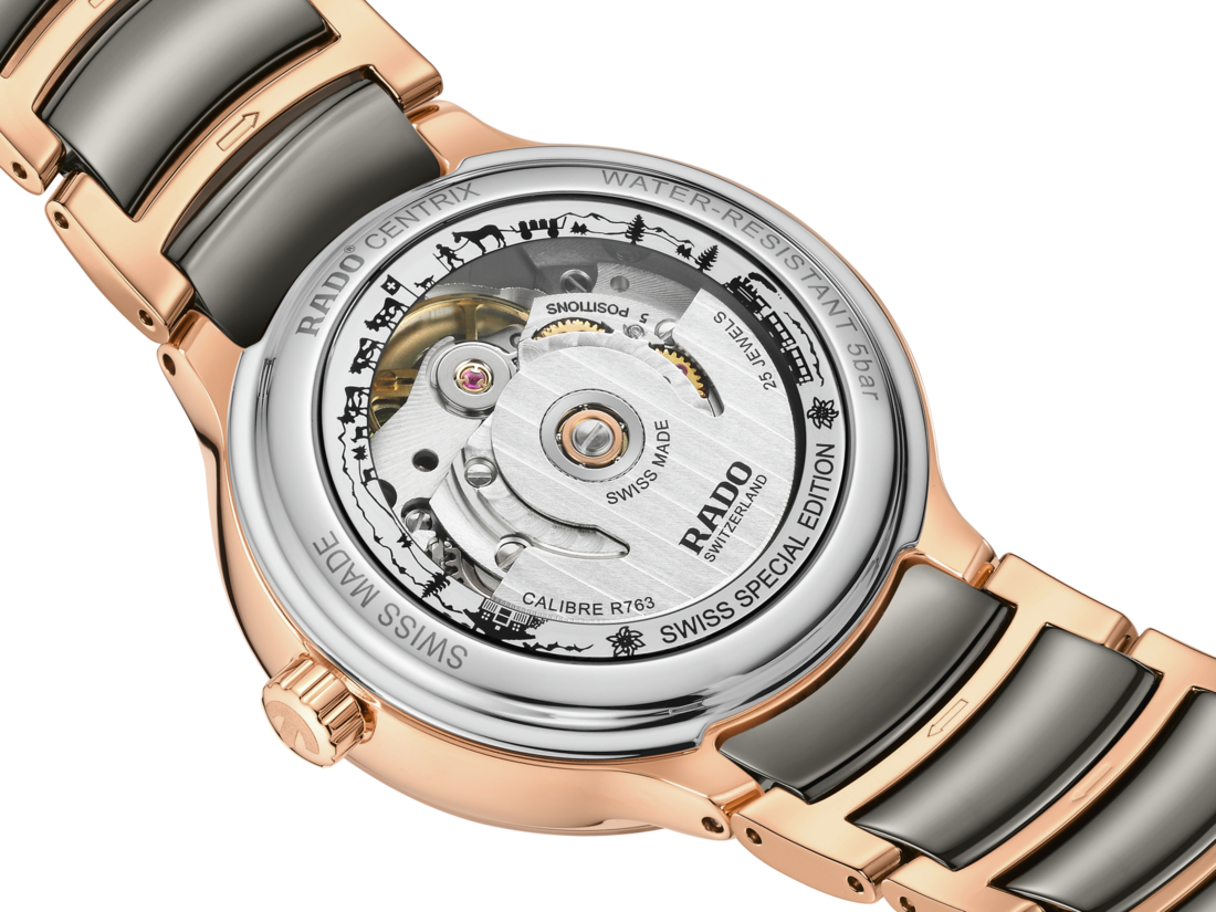 Erleben Sie mit der Centrix Swiss Edition die harmonische Verbindung von künstlerischem Ausdruck und raffiniertem Design. Das aus Edelstahl gefertigte und mit einer roségoldfarbenen PVD-Beschichtung versehene 35-mm-Gehäuse wird von einem gewölbten Saphirglas mit beidseitiger Antireflexionsbeschichtung gekrönt, das eine einwandfreie Ablesbarkeit gewährleistet. Im Herzen der Uhr schlägt ein fein justiertes, in fünf Lagen reguliertes und mit einer Nivachron™ Spiralfeder ausgestattetes Automatikwerk vom Kaliber R763, das eine aussergewöhnliche Ganggenauigkeit und eine beeindruckende Gangreserve von 80 Stunden bietet. Das champagnerfarbene Sonnenschliff-Zifferblatt mit roségoldfarbenen Indizes und einem Datumsfenster bei 3 Uhr strahlt zeitlose Eleganz aus. Bei 6 Uhr unterstreicht ein mit 20 Top-Wesselton-Diamanten im Brillantschliff besetztes Schweizerkreuz die exklusive Verfügbarkeit der Uhr in der Schweiz. Abgerundet wird die Optik dieses ikonischen Zeitmessers durch elegant überarbeitete Bandanstösse am Gehäuse und ein Armband aus poliertem roségoldfarbenen Edelstahl mit PVD-Beschichtung und Mittelgliedern aus Plasma Hightech-Keramik, das mit einer Dreifachschliesse aus Edelstahl am Handgelenk gesichert wird.