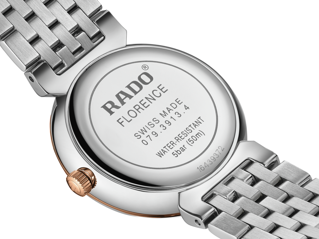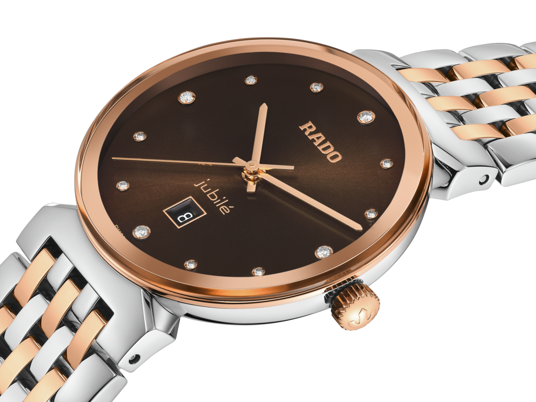 Das harmonische Design der Rado Florence Classic ruft einem die eleganten Kuppeln und Türme der Stadt in Erinnerung, der die Kollektion ihren Namen zu verdanken hat. Die 30 mm grosse Uhr verfügt über ein gewölbtes Saphirglas mit facettierten Rändern. Abgerundet wird die Gesamtoptik dieses klassischen Zeitmessers durch ein Armband aus poliertem Edelstahl mit roségoldfarbenen Mittelgliedern. Das braune Zifferblatt mit Sonnenschliff und 12 Diamanten wird durch das per Druck aufgetragene Jubilé-Logo noch besser zur Geltung gebracht und ist perfekt auf die roségoldfarbenen Zeiger abgestimmt. Dank ihres R079 Quarzwerks mit drei Zeigern zeichnet sich die Uhr durch eine grössere Genauigkeit und Stossfestigkeit aus. Die Uhr ist bis zu einer Tiefe von 50 m wasserdicht und auch in Grösse L erhältlich – damit ist sie die perfekte Paar-Uhr.