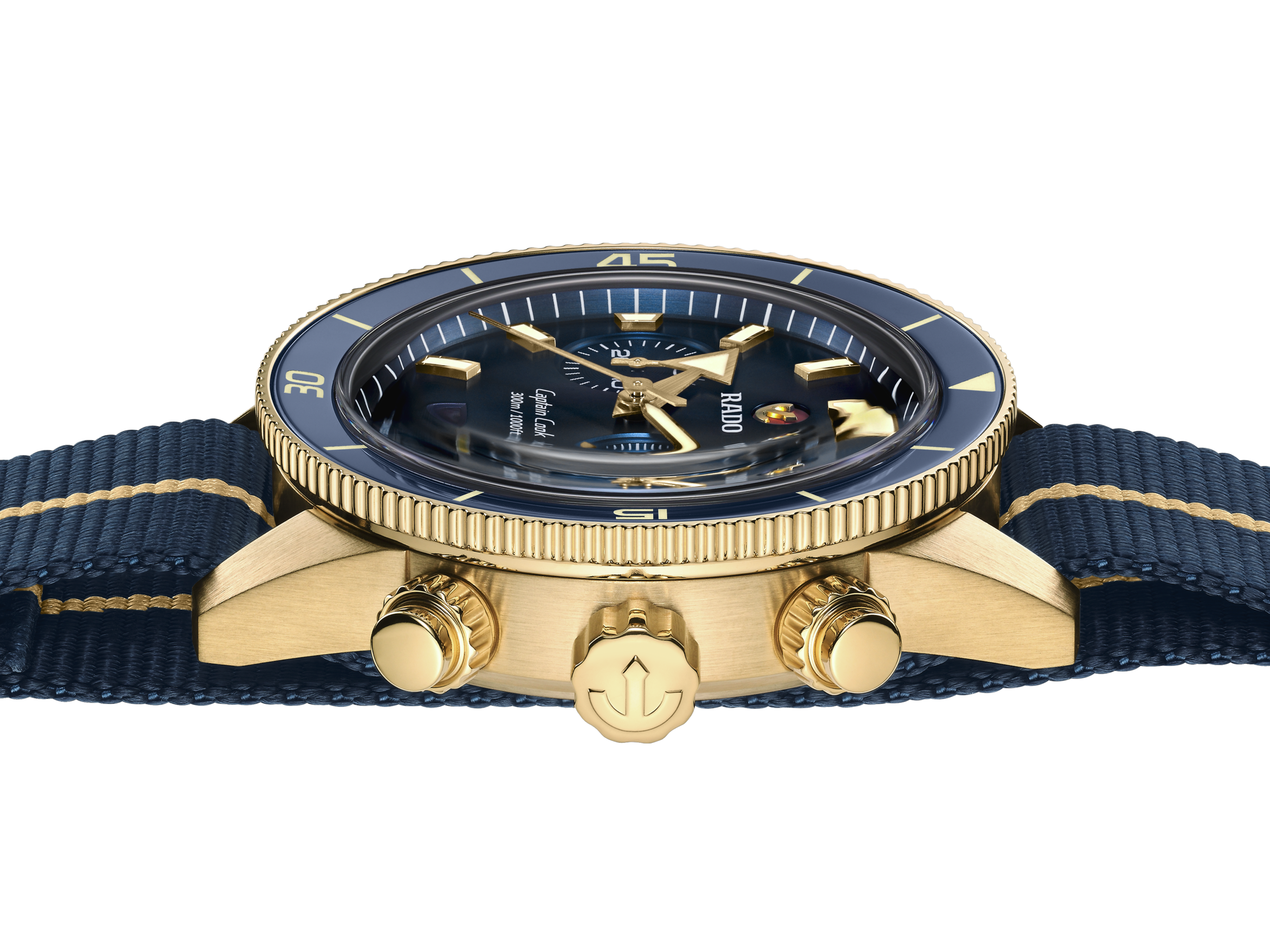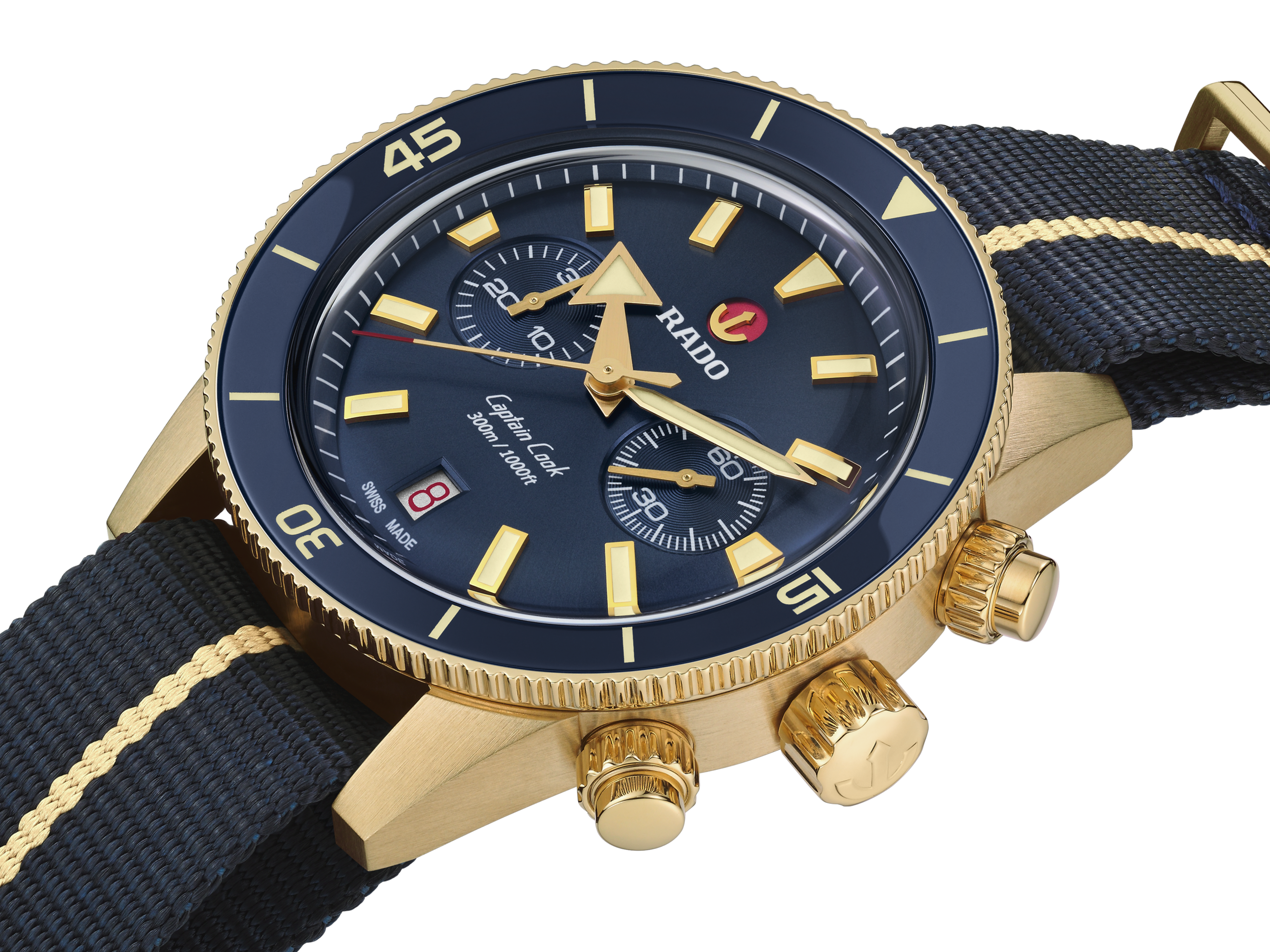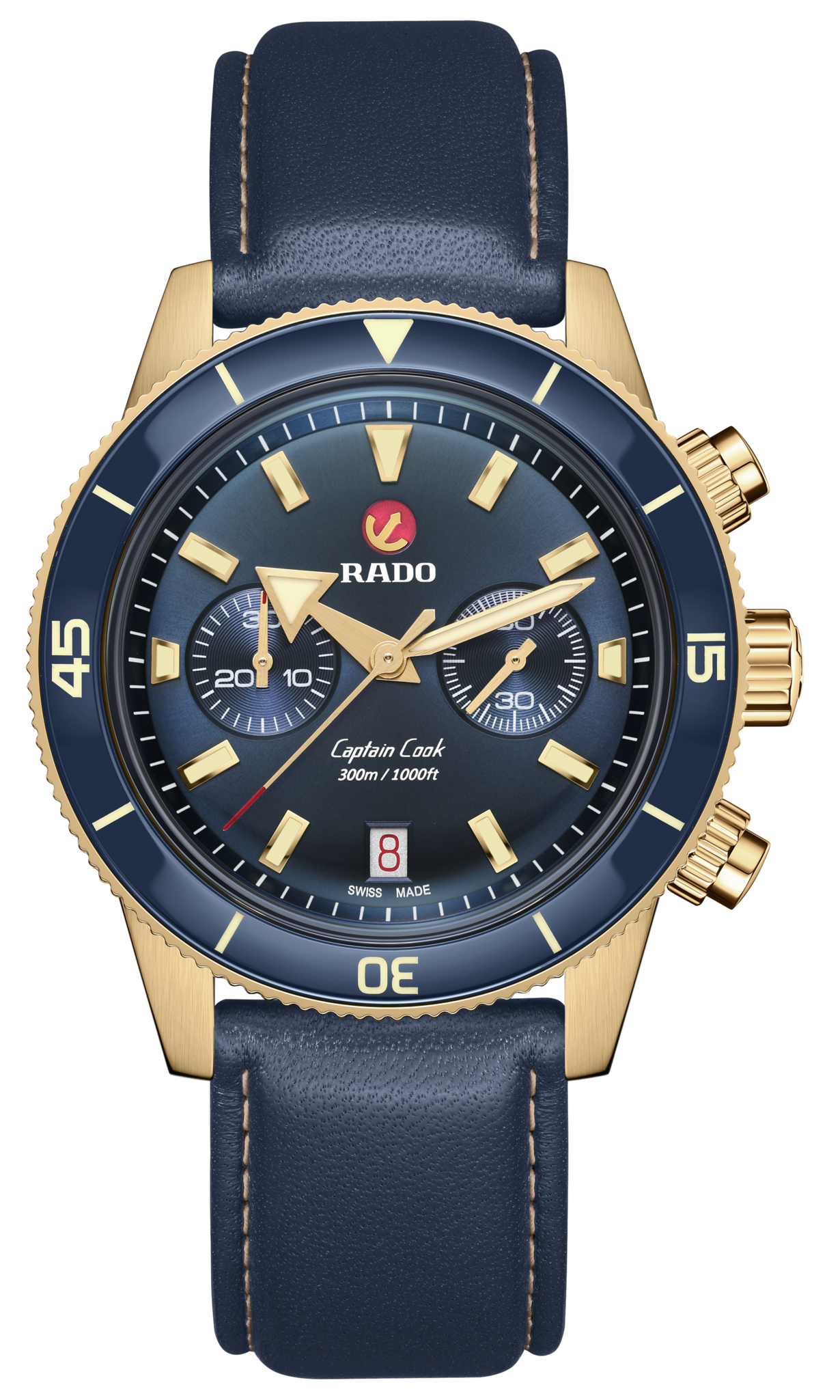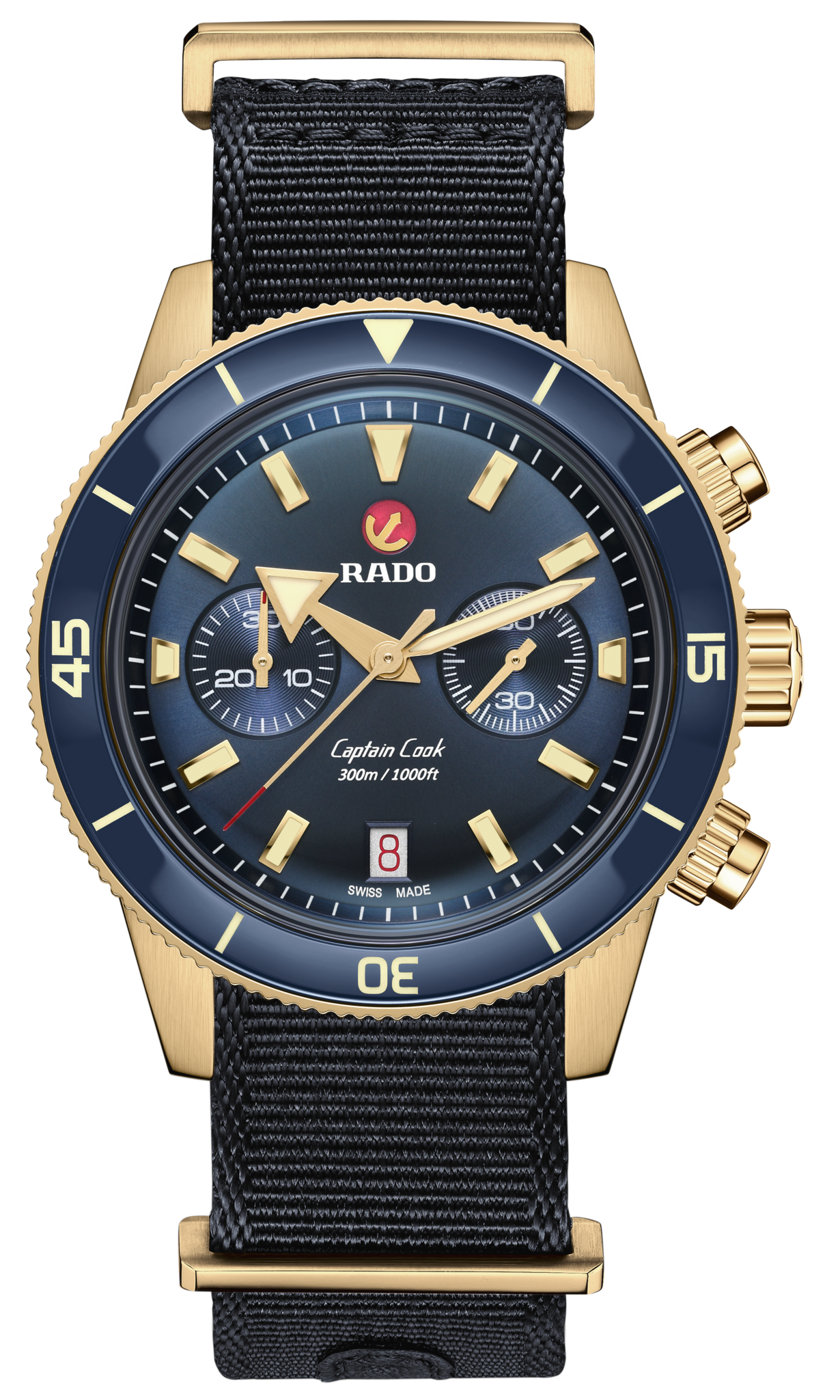 The Captain Cook Chronograph wears a characteristic box-shaped, scratch-resistant sapphire crystal with anti-reflective treatment on both faces. The thin, stylish 43 mm brushed bronze case features a polished blue high-tech ceramic inlay on the bezel, complementing the sunray blue dial. The numbers, markers and triangles are treated with Super-LumiNova®. Inside, the new, thinner R801 automatic movement, with 37 jewels, five hands and 59 hours of power reserve thanks to an antimagnetic Nivachron™ hairspring, exceeds standard test requirements from 3 to 5 positions for higher accuracy. The model comes with a fabric strap with a gold-coloured stripe down the centre, as well as a blue leather strap and an additional fabric strap in deep blue.