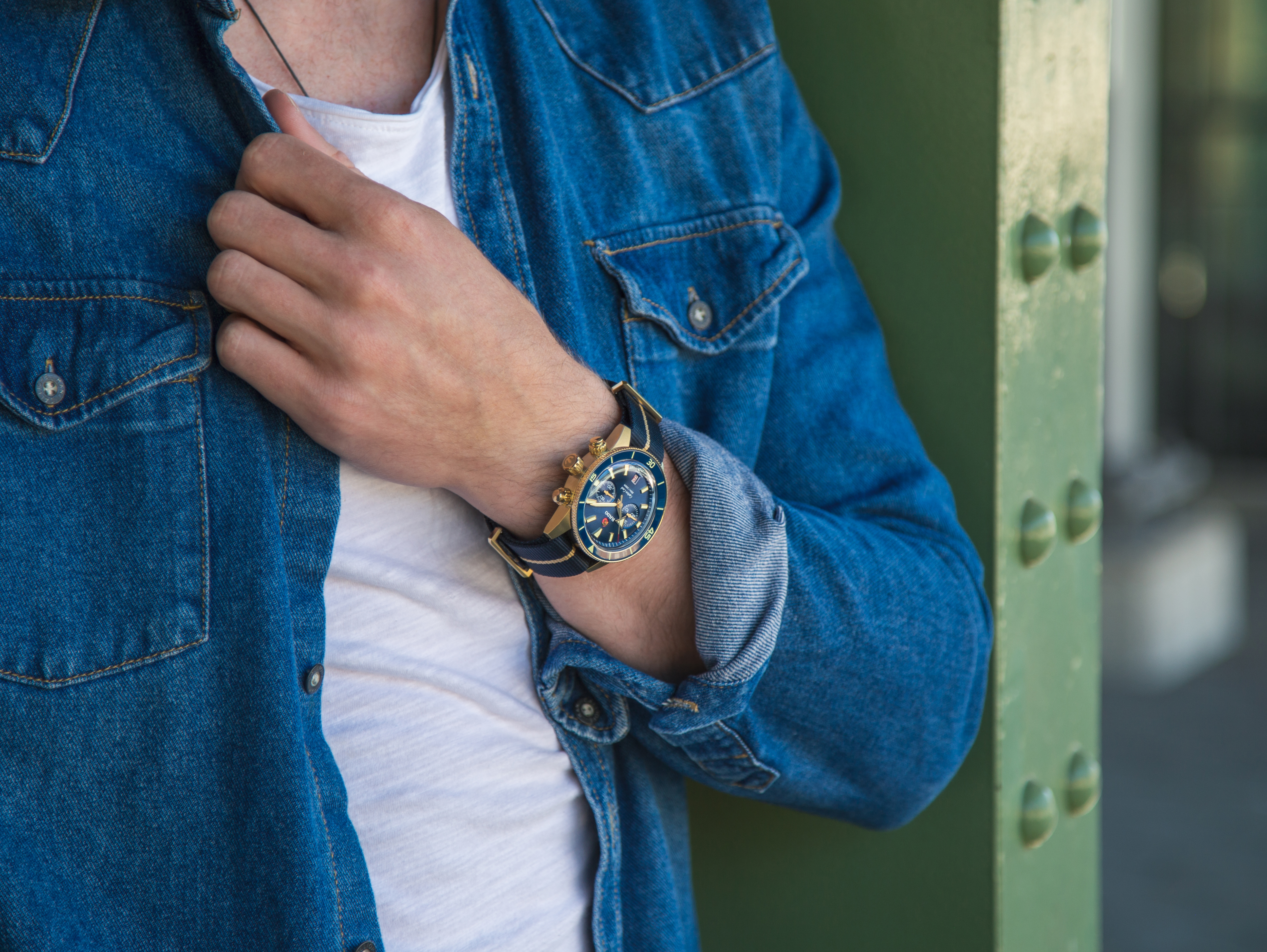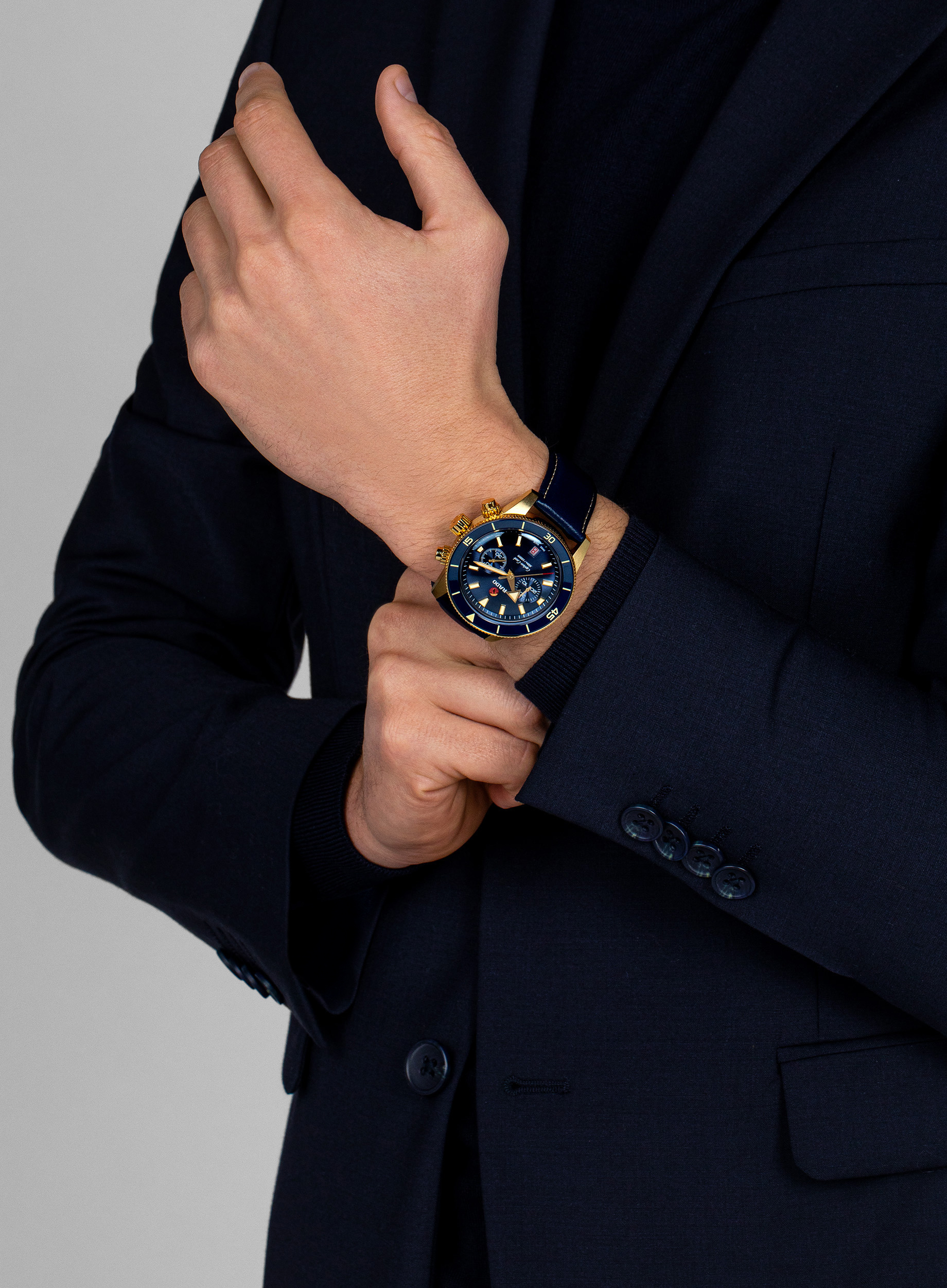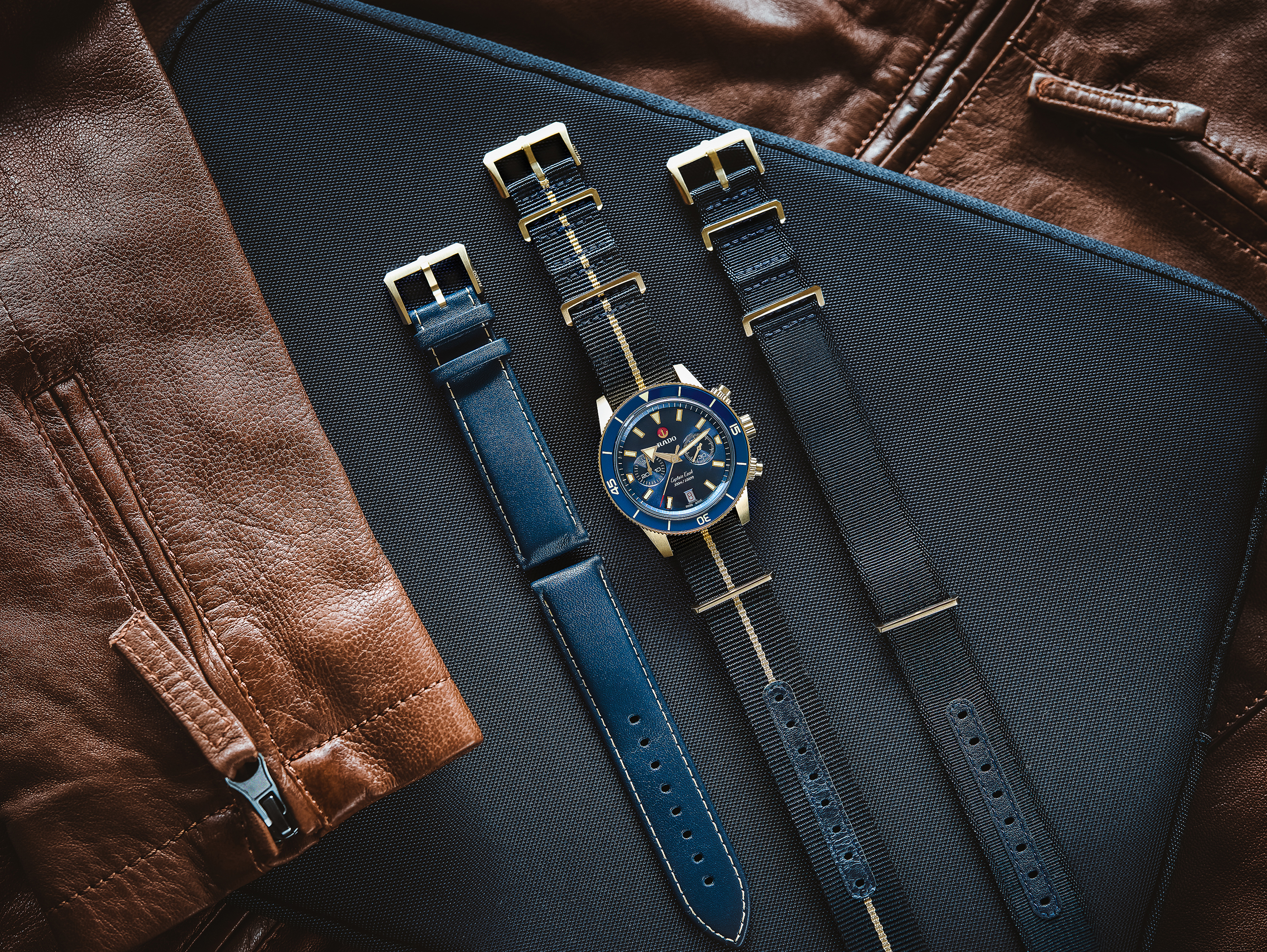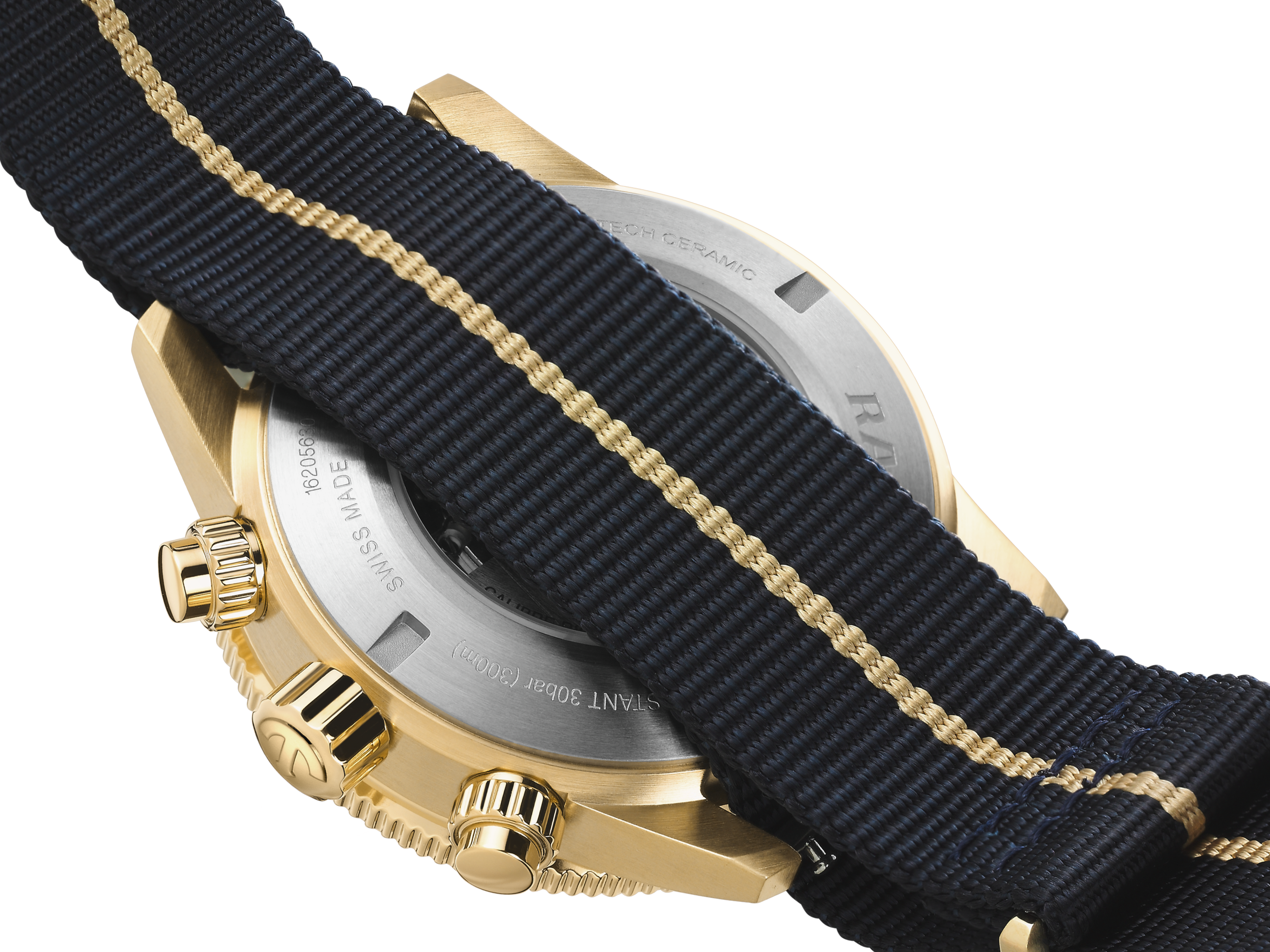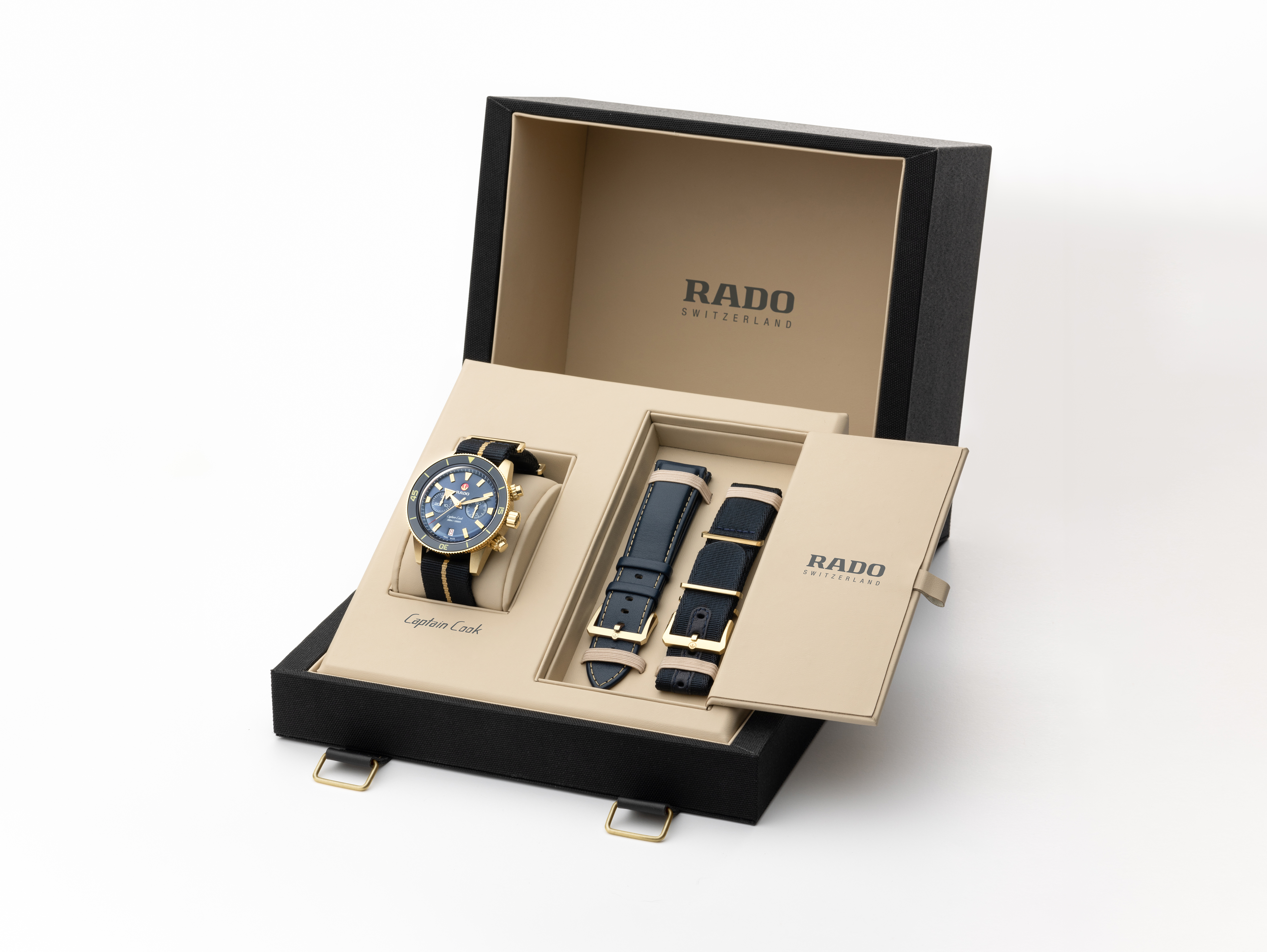 The Captain Cook Chronograph wears a characteristic box-shaped, scratch-resistant sapphire crystal with anti-reflective treatment on both faces. The thin, stylish 43 mm brushed bronze case features a polished blue high-tech ceramic inlay on the bezel, complementing the sunray blue dial. The numbers, markers and triangles are treated with Super-LumiNova®. Inside, the new, thinner R801 automatic movement, with 37 jewels, five hands and 59 hours of power reserve thanks to an antimagnetic Nivachron™ hairspring, exceeds standard test requirements from 3 to 5 positions for higher accuracy. The model comes with a fabric strap with a gold-coloured stripe down the centre, as well as a blue leather strap and an additional fabric strap in deep blue.