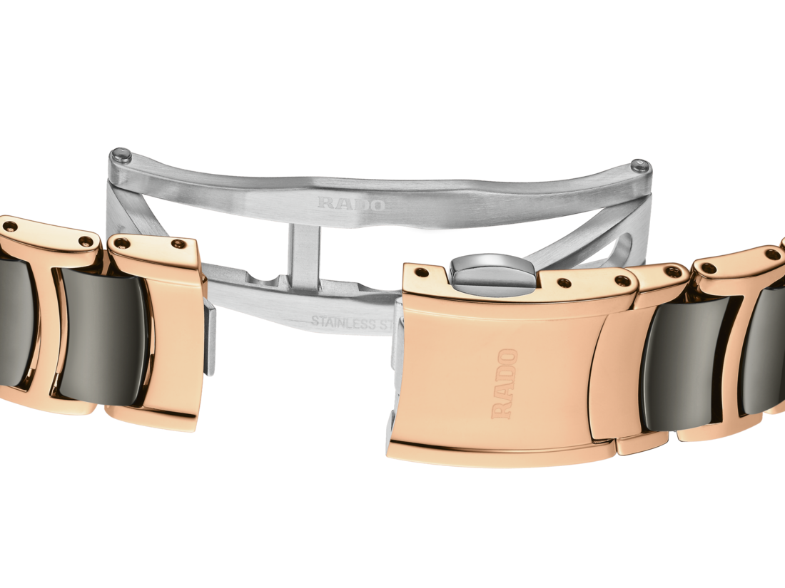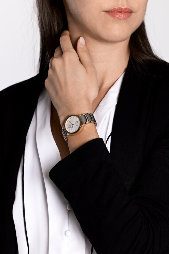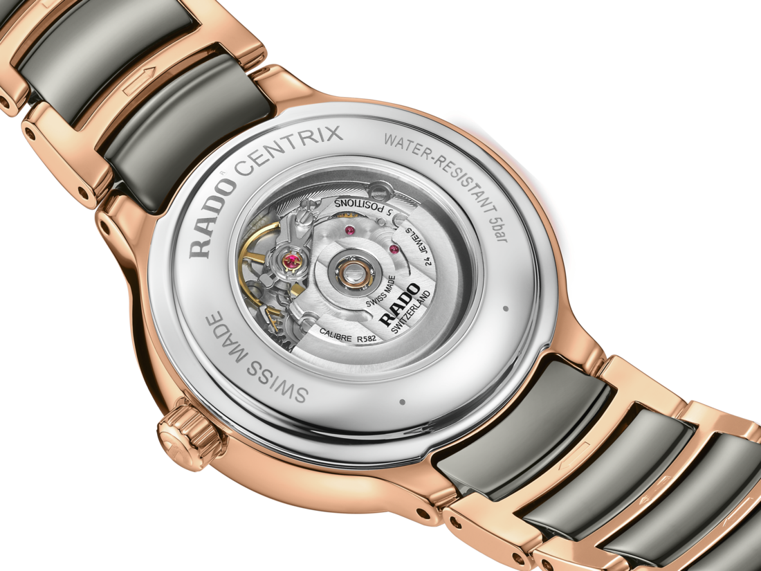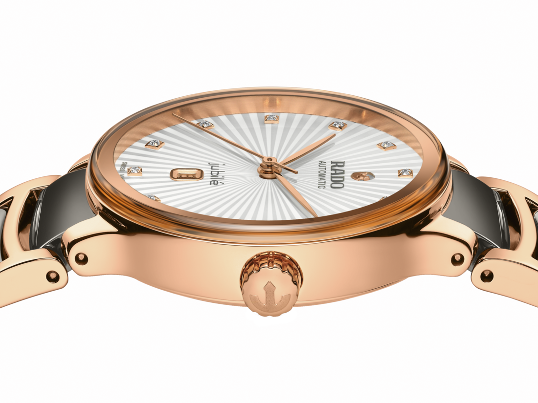 The classic Centrix Automatic Diamonds watch has been reworked not only technically, but also aesthetically. The modified model has a rounded sapphire crystal that extends all the way to the edge and a curved case blending with the curved crystal edge. The overall appearance of this iconic timepiece is completed with adjusted case lugs and a bracelet made of polished rose-gold-coloured PVD-coated stainless steel with plasma high-tech ceramic middle links. The silver-white facetted dial has an opulent 3D effect created by stamping a shaped dial and then filling it with lacquer. Inside, the three-hand calibre R582 movement exceeds standard accuracy test requirements from 3 to 5 positions, thanks to its antimagnetic Nivachron™ hairspring for increased reliability and accuracy. The watch is water resistant down to 50 m and offers 48 hours of power reserve.