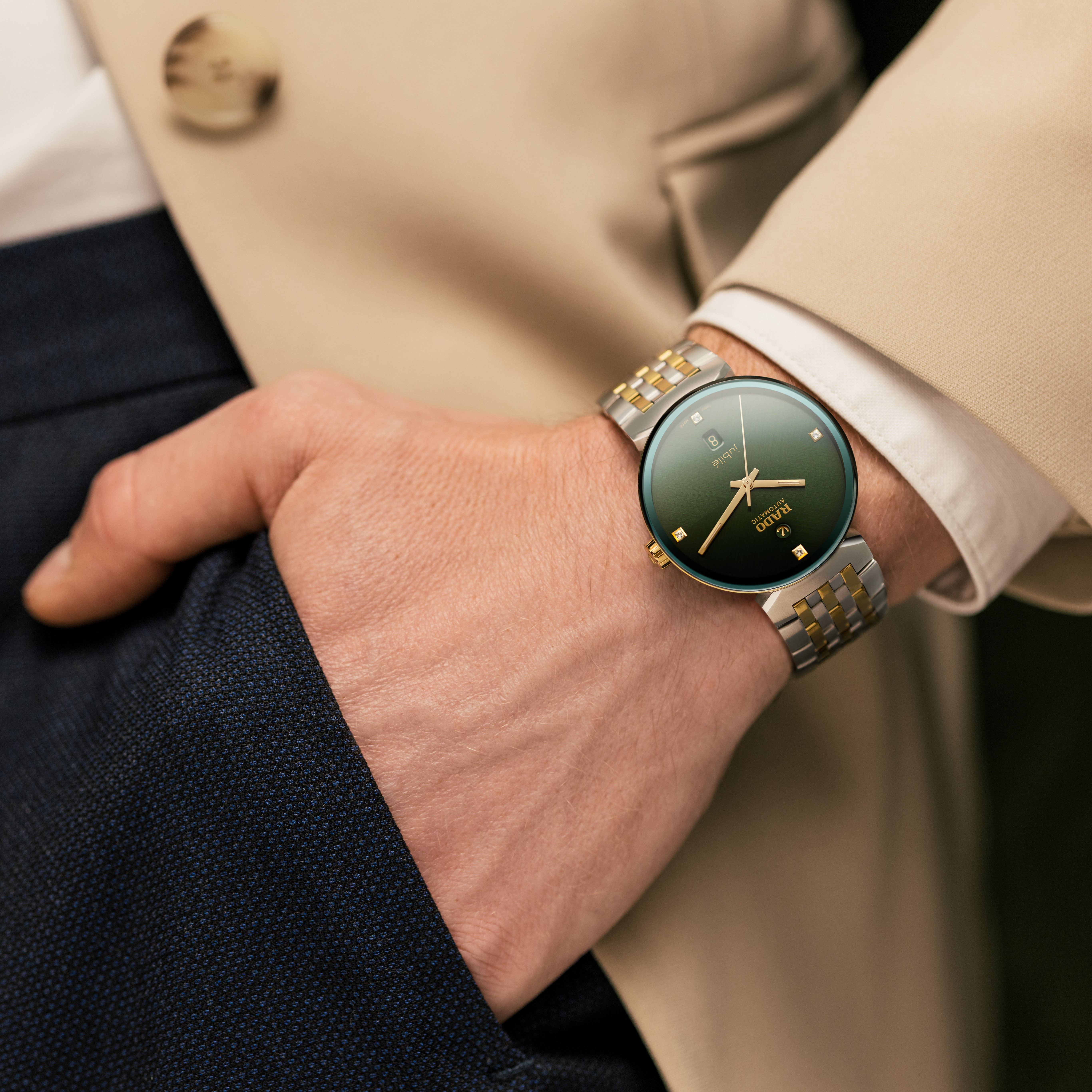Rado Florence blends timeless Renaissance artistry with Swiss precision to stunning effect. The slim profile and premium seven-link bracelet guarantee comfort, while the metallised, edge-to-edge sapphire crystal glass ensures the watch is durable. Yellow gold- coloured hands with white Super-LumiNova® highlights sweep across the green dial, with four diamonds at 3, 6, 9 and 12 o’clock and a fine, bi-directional brushed surface. The green metallisation and green background on the date display at 6 o’clock both match the colour of the dial. Thanks to the box-shaped sapphire crystal exhibition case back, the designers were able to retain the line’s iconic slim profile. The watch is powered by Rado calibre R763, an automatic 3-hand, 25-jewel movement with an 80-hour power reserve and an anti-magnetic NivachronTM hairspring for enhanced reliability and precision. This model’s refined aesthetic juxtaposes the sandblasted stainless steel case with the polished bezel and case back, echoed by the bracelet’s high-contrast sandblasted and polished links.