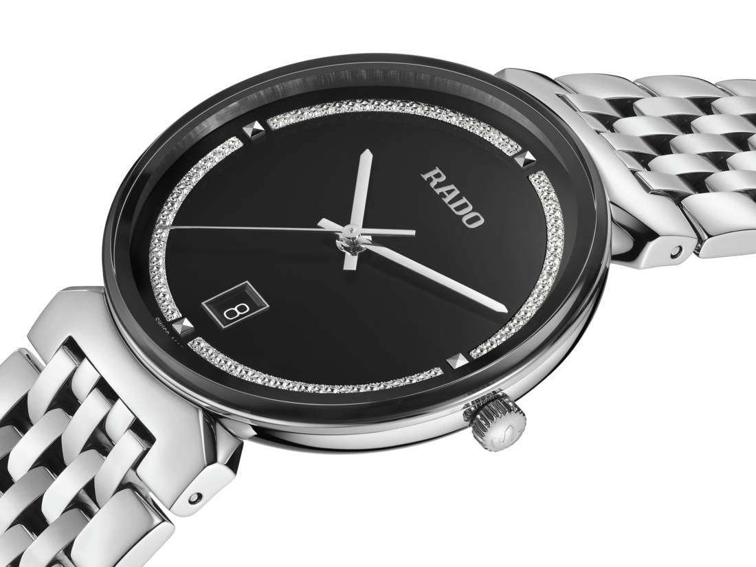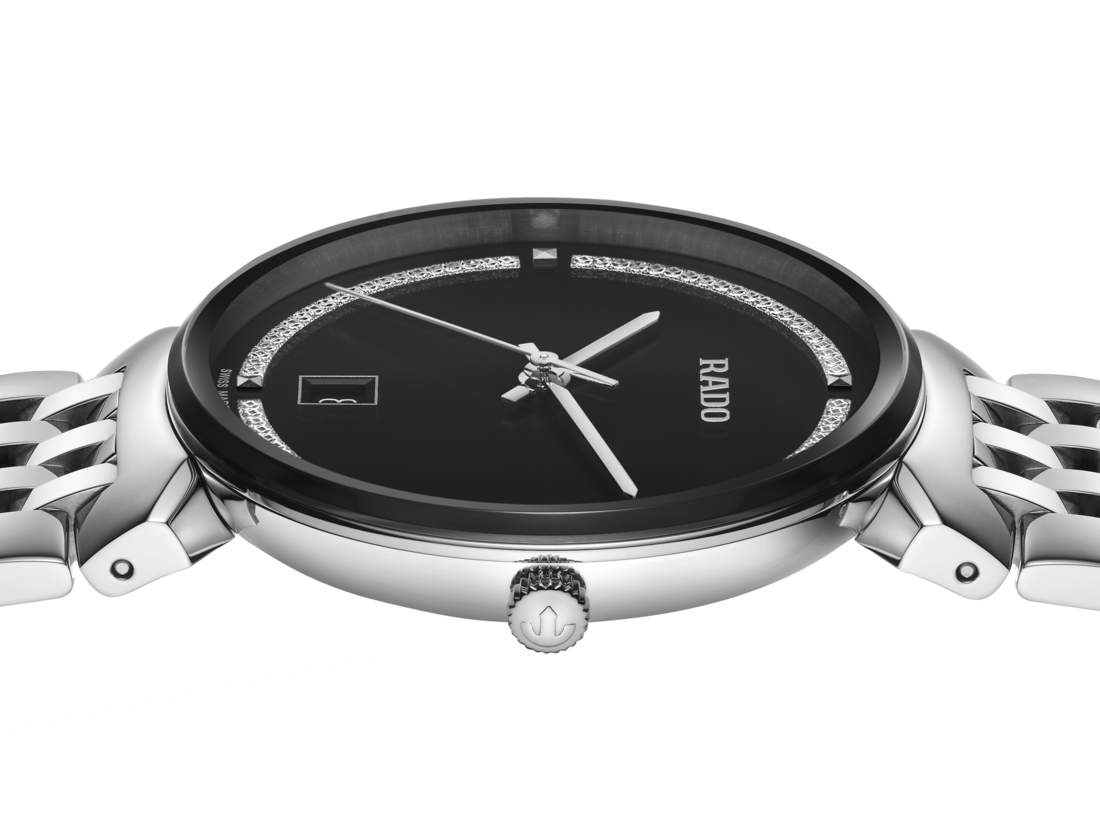 The harmonious design of the Rado Florence calls to mind the elegant domes and towers of the city from which the collection takes its name. Powered by a reliable three-hand Quartz Rado calibre R073 movement, this watch ensures greater accuracy and resistance to shocks. The 38 mm watch has an edge-to-edge-bevelled, curved sapphire crystal. The watch boasts a polished stainless steel case, crown, bezel and case back. The bracelet made of polished stainless steel completes the overall appearance of this classic timepiece. The black dial with rhodium glitter decoration, emphasised with the silver coloured printed “Rado” logo, matches perfectly with the rhodium coloured hands. The watch is water resistant down to 50 m and is also available in S size, which makes it an ideal couples’ watch.