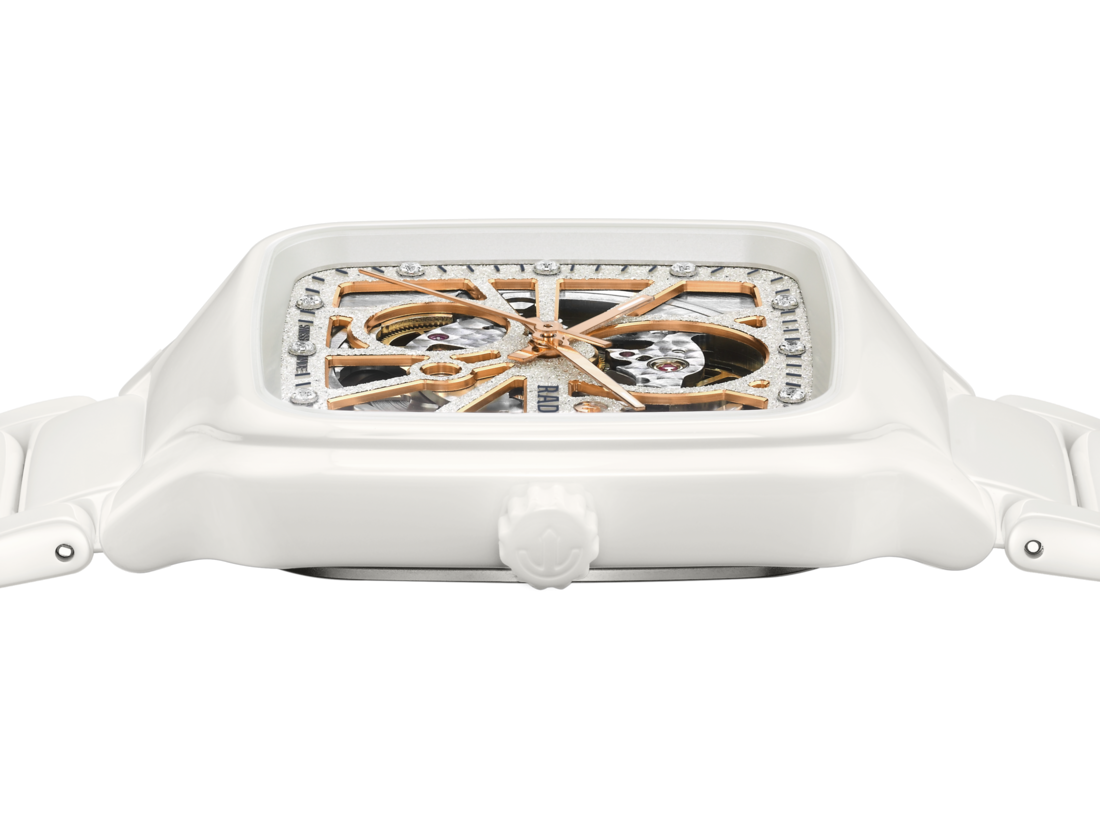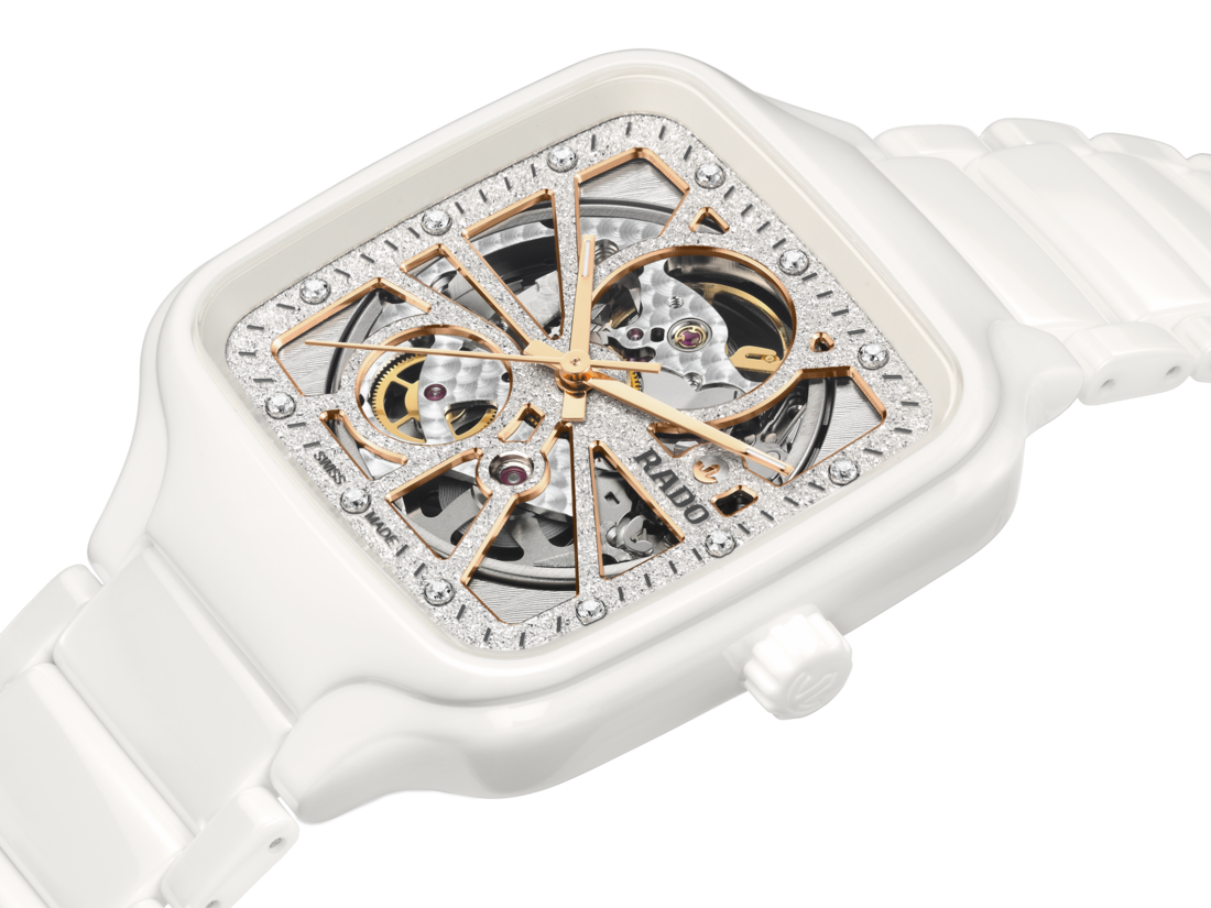 Top-class diamonds and a sparkling dial bring a fresh look to this dazzling True Square Open Heart. The iconic square case and bracelet in polished white high-tech ceramic frame an innovative new dial with a rhodium-coloured diamond powder-like finish. A unique electro-forming process produces the dial’s diamond-powder like glitter and permits the Rado logo, markings and minute tracks to be raised in sharp relief from the base of the dial, the end result of galvanic growth. The sparkling dial and 12 jubilé diamond indexes combine to create this model’s dazzling, elegant and luxurious look. A low-relief grey minute track surrounds rose gold-coloured hour and minute hands with Super-LumiNova® highlights and a rose gold-coloured second hand. The intriguing cut-away design invites a close-up look at the Rado calibre R734, a 25-jewel, 3-hand automatic movement with an anti-magnetic NivachronTM hairspring and a remarkable 80-hour power reserve.