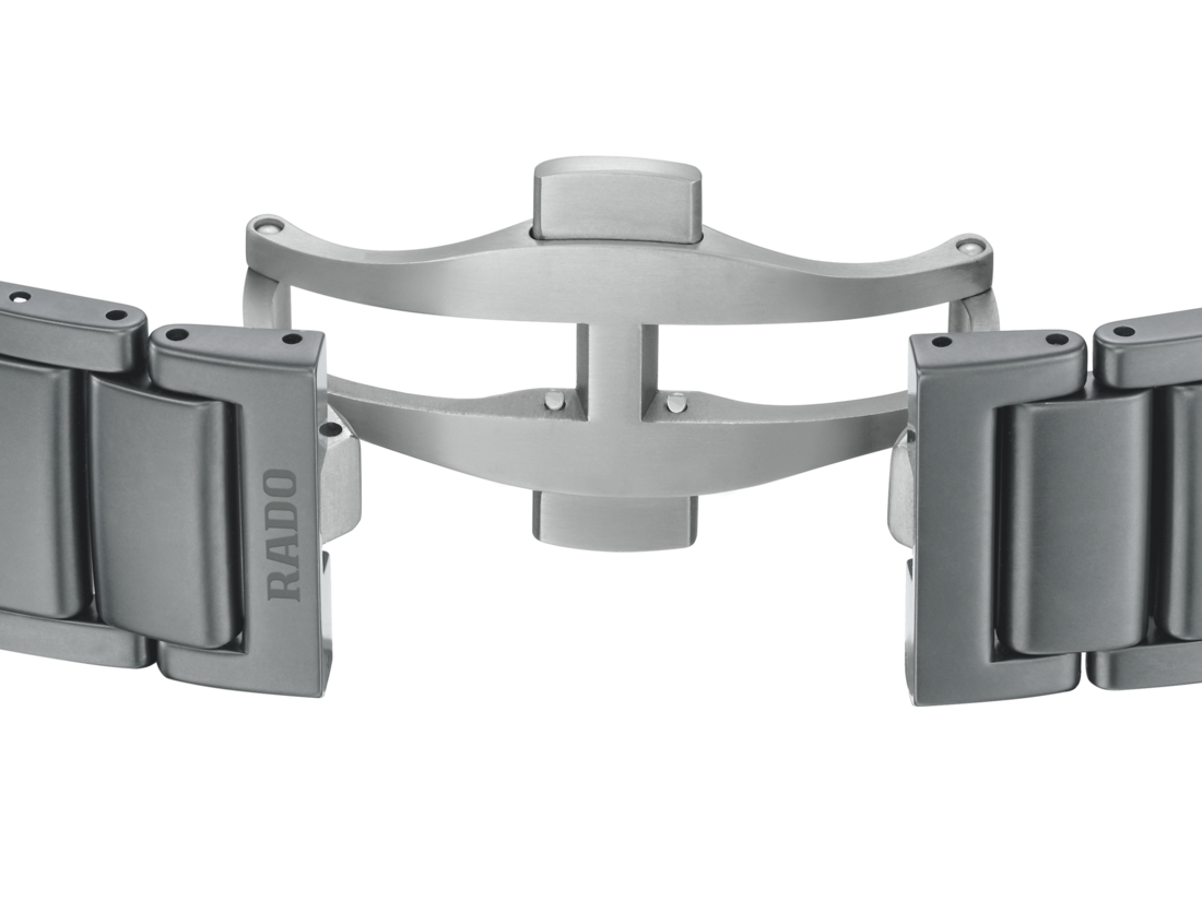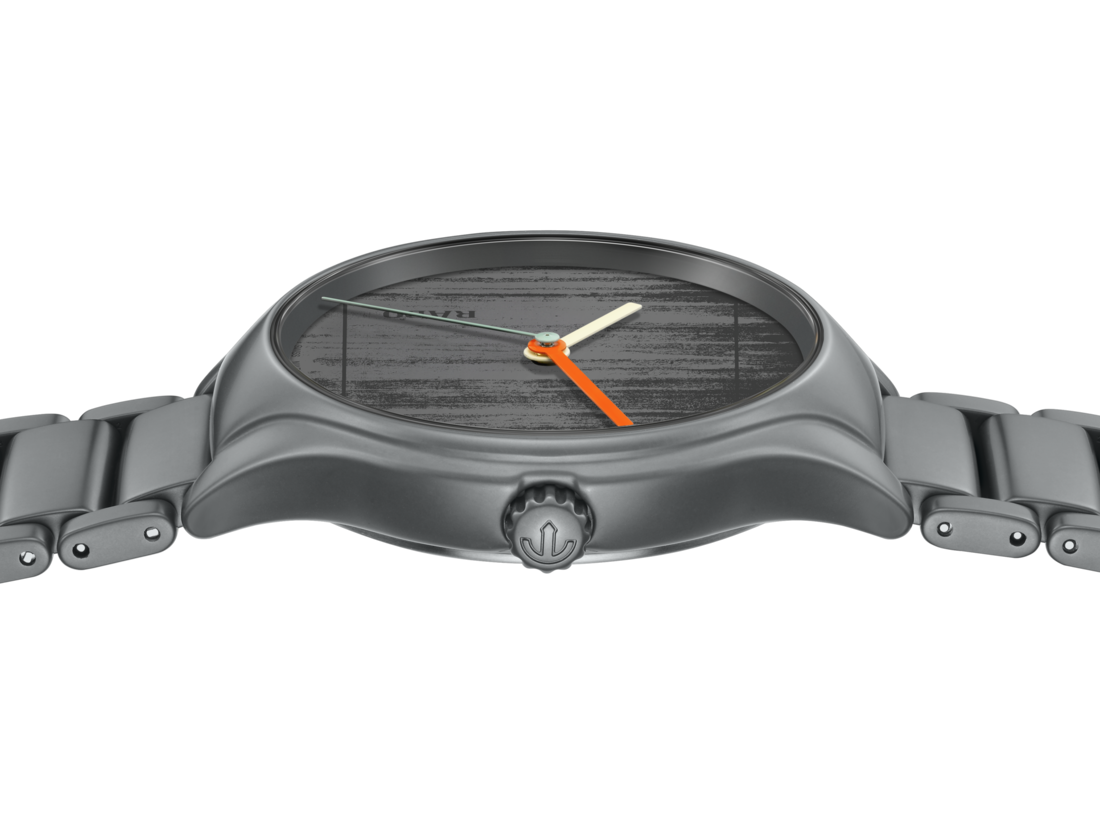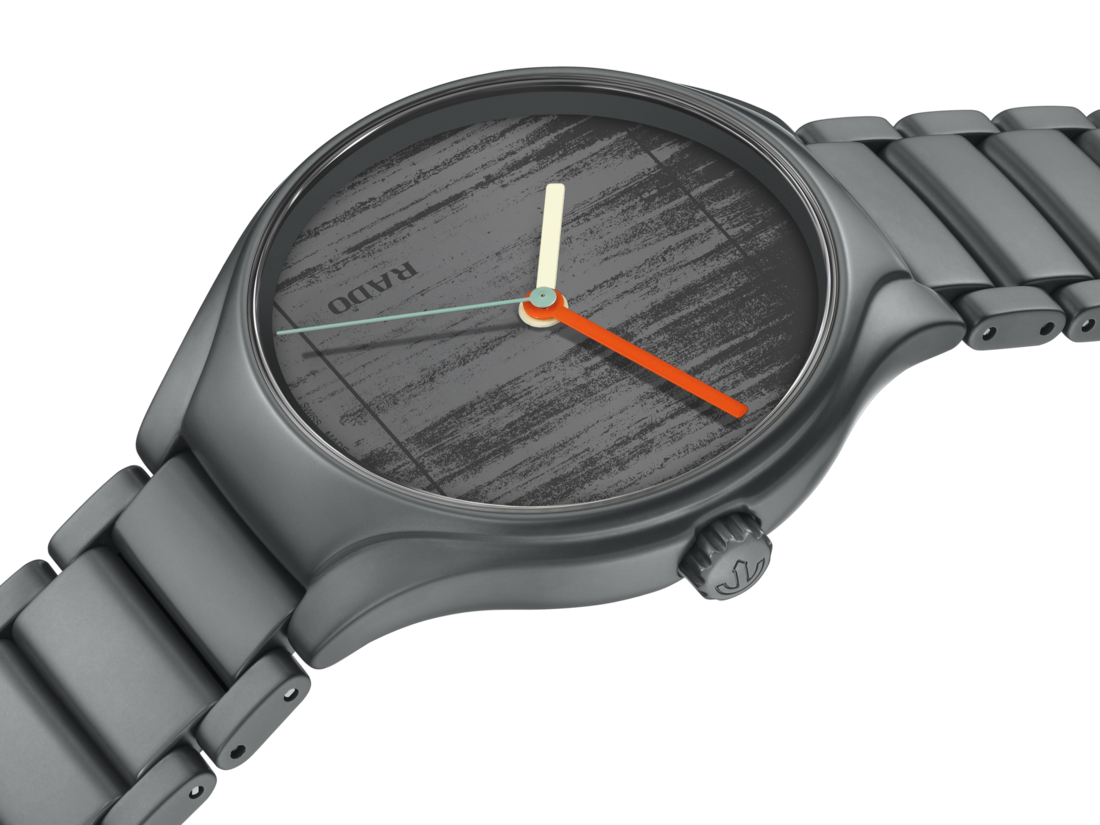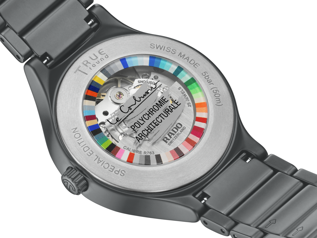 A high-tech ceramic bracelet and monobloc case in matt GRIS FONCÉ (32010) match the colour from Le Corbusier’s Polychromie Architecturale, confirming Rado as the Master of Materials. They also guarantee wearer comfort. The curved sapphire crystal and high-tech ceramic ensure that the watch maintains its as-new appearance. An anti-reflective coating on both faces of the crystal gives a clear view of the dial, which is laser engraved with an abstract representation of the concrete surface texture seen on the Carpenter Center for the Visual Arts in Cambridge, USA. The Rado logo is vertical at 8 o’clock. Designed to be complementary, the hands feature other colours from the Polychromie Architecturale: BLANC (32001), ORANGE VIF (4320S) and VERT ANGLAIS CLAIR (32041). The watch is powered by the Rado calibre R763 automatic movement, offering an 80-hour power reserve and featuring an antimagnetic Nivachron™ hairspring. Tested and adjusted in five positions, it exceeds standard testing requirements to guarantee reliability and accuracy.