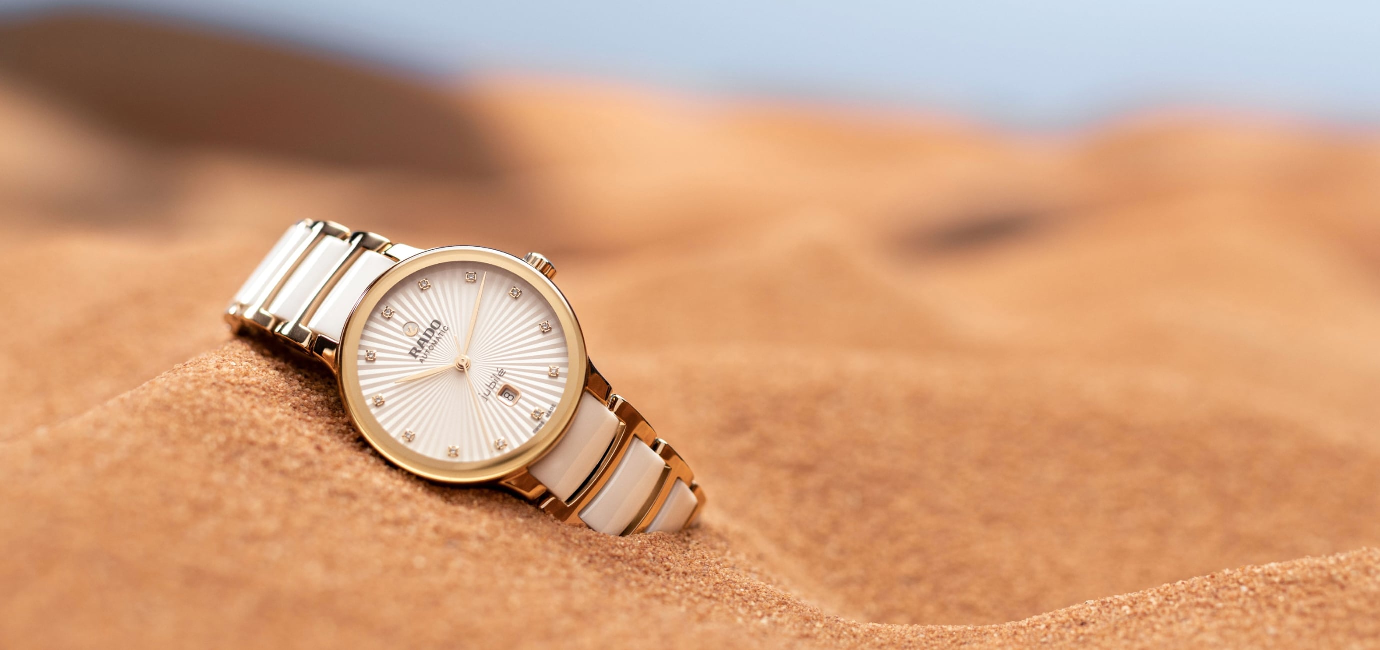 The classic Centrix Automatic Diamonds watch has been reworked not only technically, but also aesthetically. The modified model has a rounded sapphire crystal that extends all the way to the edge and a curved case blending with the curved crystal edge. The overall appearance of this iconic timepiece is completed with adjusted case lugs and a bracelet made of polished rose-gold-coloured PVD-coated stainless steel with white high-tech ceramic middle links. The silver facetted dial has an opulent 3D effect created by stamping a shaped dial and then filling it with lacquer. Inside, the three-hand calibre R582 movement exceeds standard accuracy test requirements from 3 to 5 positions, thanks to its antimagnetic Nivachron™ hairspring for increased reliability and accuracy. The watch is water resistant down to 50 m and offers 48 hours of power reserve.
