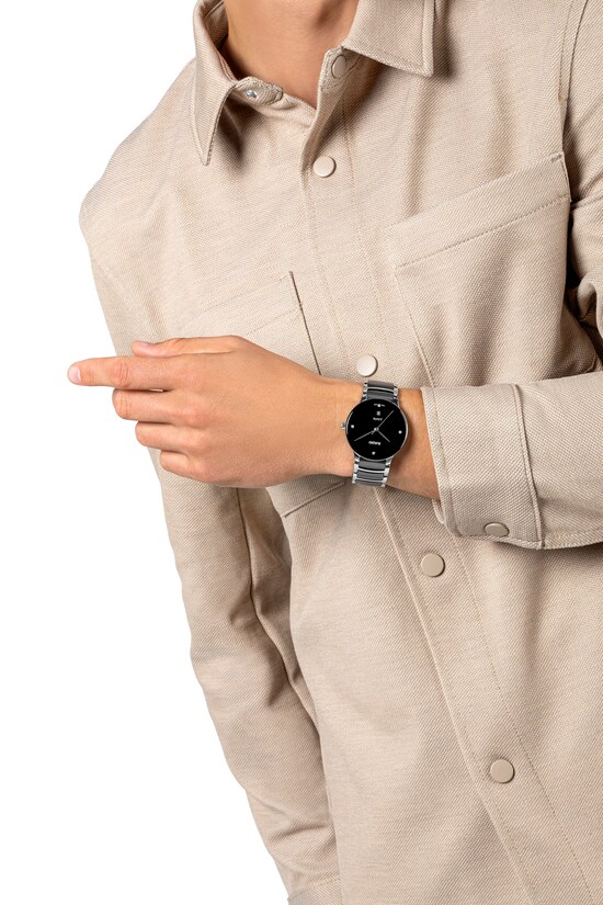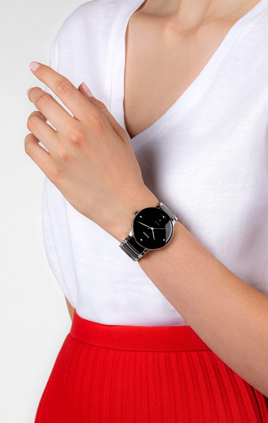 The classic Centrix Quartz Diamonds watch has been reworked not only technically, but also aesthetically. The modified model has a rounded sapphire crystal that extends all the way to the edge, as well as a curved case blending with the curved crystal edge. The adjusted case lugs and the bracelet made of polished stainless steel with black high-tech ceramic middle links complete the overall appearance of this iconic timepiece. The black lacquered dial with 4 diamonds, emphasised with the printed “jubilé” logo, matches perfectly with the rhodium-coloured hands. Thanks to the PreciDrive and HeavyDrive features in the calibre R073 quartz movement, the watch has greater accuracy and resistance to shocks. The watch is water-resistant down to 50 m.