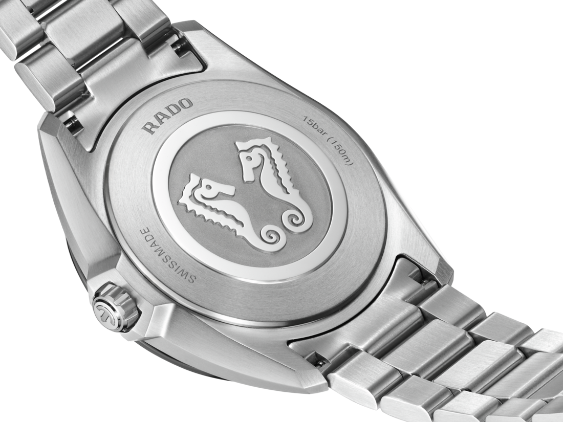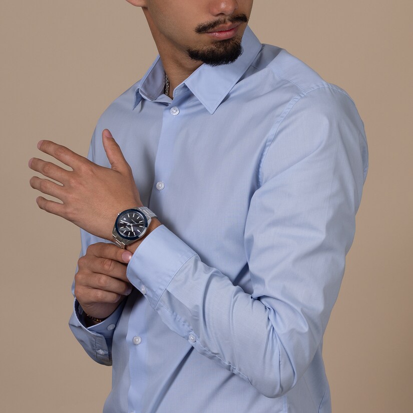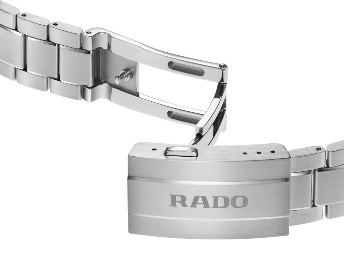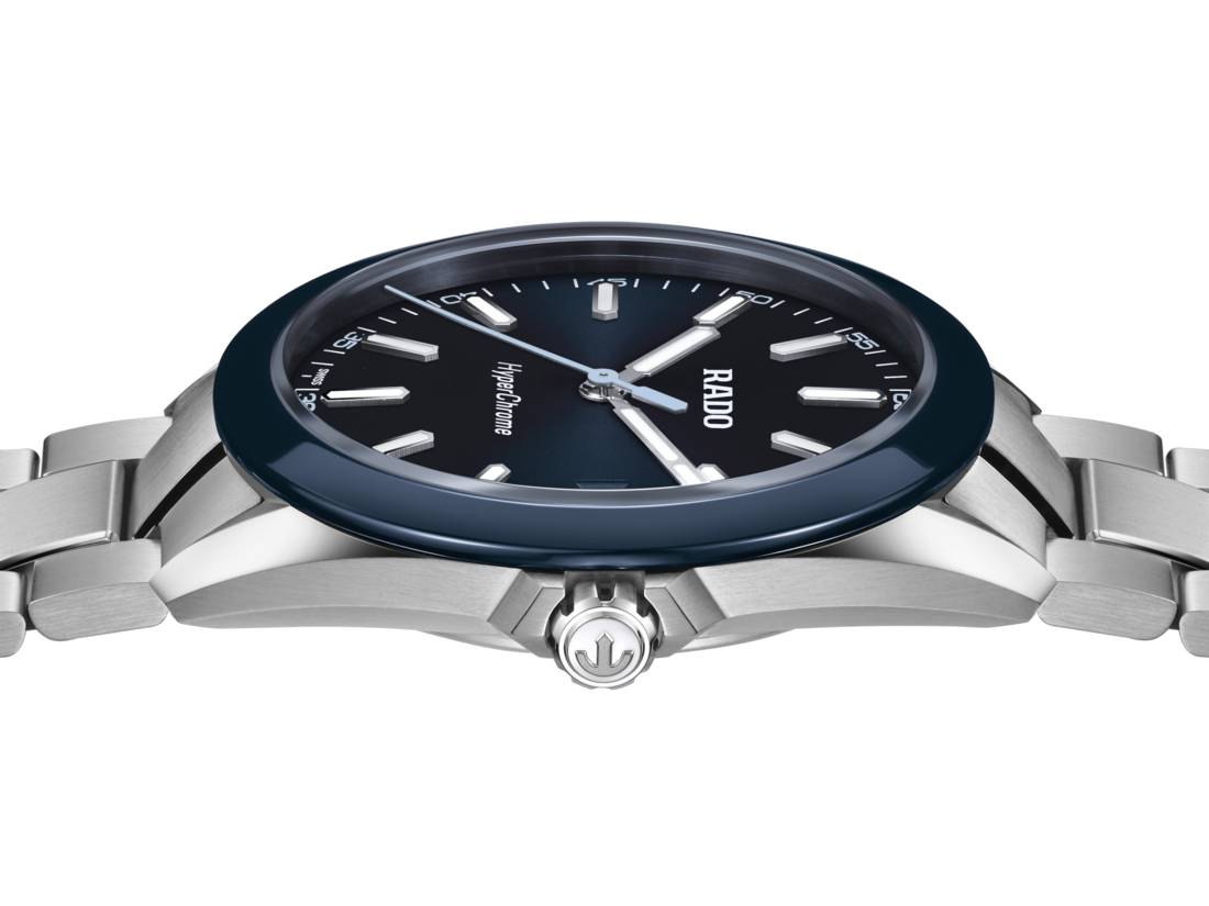 The HyperChrome Quartz is a contemporary expression of precision and material mastery, combining advanced watchmaking technology with a bold and enduring design. The case, sculpted from polished and brushed stainless steel, is encircled by a polished blue high tech ceramic bezel—an elemental combination of strength and refinement. Topping this resilient construction is a curved sapphire crystal with anti-reflective coating on the inner side, offering exceptional scratch resistance and crystal-clear legibility. With water resistance to 15 bar (150 metres), every element of the architecture is designed for lasting precision, durability, and confidence in any setting. At the heart of the watch, the Rado calibre R292 ensures exceptional accuracy and reliability. This 3-jewel quartz movement combines PreciDrive and HeavyDrive technologies, enabling precise regulation of each impulse and maintaining a deviation of no more than ±10 seconds per year. A discreet date window at 3 o’clock integrates seamlessly into the dial’s balanced design. The dark blue sunray dial offers a refined contrast to the rhodium-coloured hour and minute hands, as well as the applied indices —all treated with white Super-LumiNova® for optimal legibility in low light. A light blue second hand echoes the colour of the numerals on the minute track, adding a subtle, cohesive detail to the composition. At night, the twelve o’clock index and the minute hand emit a green glow, while the remaining indices and the hour hand radiate blue, ensuring quick, intuitive time reading in any lighting condition. Completing the case is a three-row stainless steel bracelet, featuring brushed outer links and middle links accented with polished bevels, creating a refined interplay of textures. It is secured by a triple-fold clasp with a three-position quick adjustment system, ensuring a precise and comfortable fit at all times.