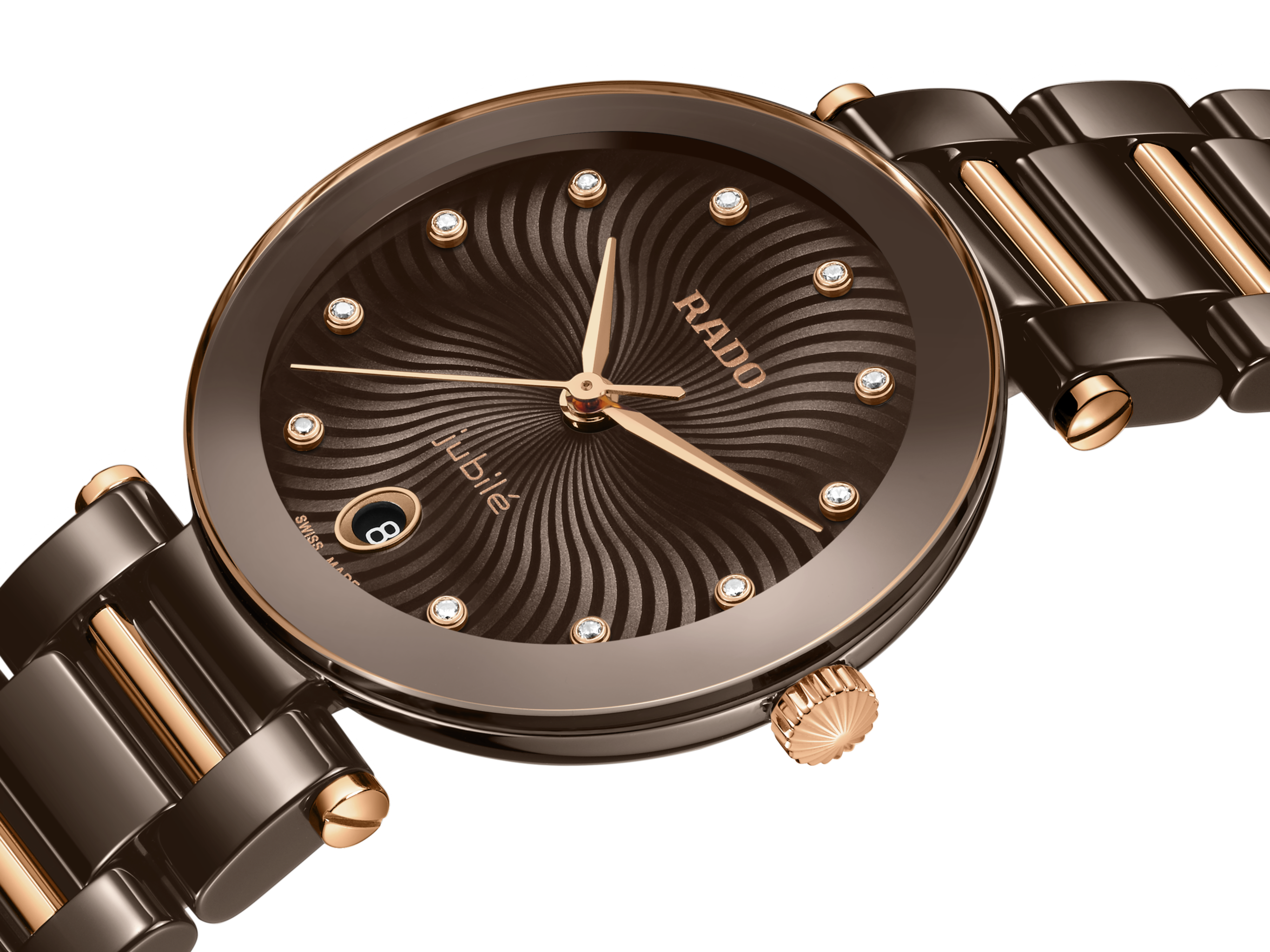 LaCoupole stands as a tribute to the icons of yesterday, redefined for today’s sophisticated wearer. An expression of refined glamour, engineered with the precision and innovation only Rado can offer. Its 31 mm monobloc case in polished brown high-tech ceramic is crowned by a domed sapphire crystal, elevated by a brown & rose gold coloured metallised border. The case is water-resistant to 5 bar (50 metres), uniting everyday resilience with enduring elegance. The result is a silhouette that is unmistakably Rado—sleek, sculptural, and timeless. The brown dial features wave-shaped markings filled with lacquer, creating an opulent three-dimensional effect. 11 Top Wesselton full-cut diamonds serve as hour markers, bringing quiet brilliance to the dial, while a date window at 6 o’clock offers refined functionality. At its heart beats the 8-jewel quartz Calibre R218, elevated by PreciDrive™ technology for exceptional precision. Securing the case, the bracelet crafted from polished brown high-tech ceramic and enriched with rose gold PVD coated elements and clasp completes the design with seamless harmony. The LaCoupole is an emblem of grace: designed to be desired and crafted to endure.