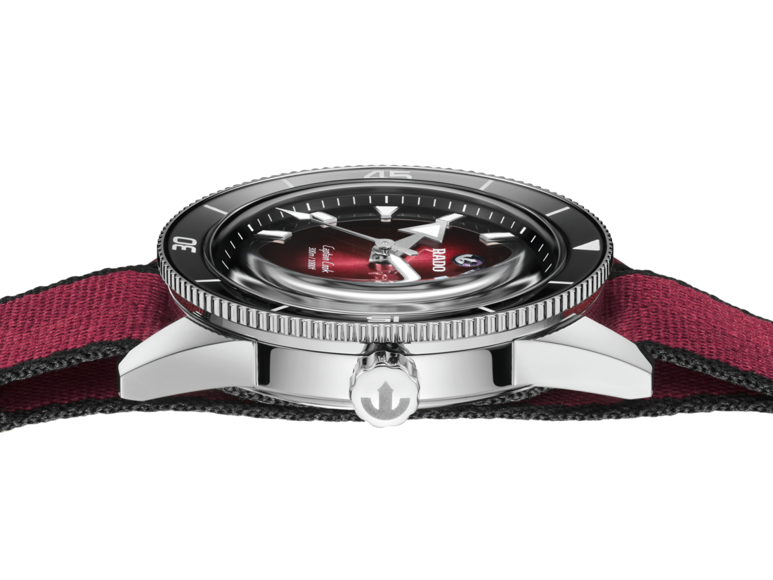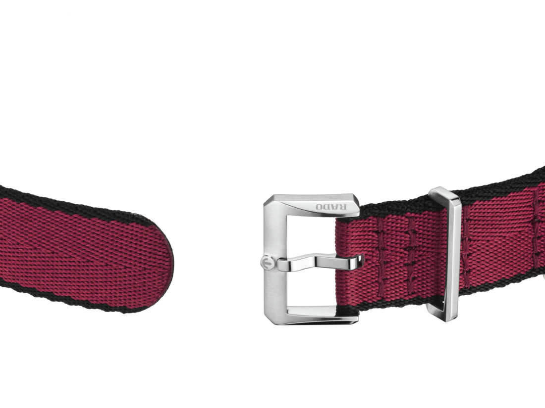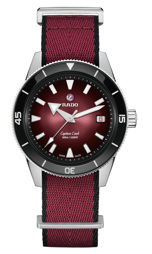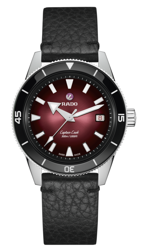 This captivating Captain Cook, inspired by the original 1962 edition, gives pride of place to the black-to-burgundy gradient dial shimmering beneath a box-shaped sapphire crystal. The striking look is enhanced by rhodium-coloured applied indexes and hands with Super-LumiNova, and by the polished black bezel insert in Rado’s signature high-tech ceramic. The watch is powered by Rado calibre R763, a 25-jewel, three-hand automatic movement with an antimagnetic Nivachron hairspring for enhanced reliability and accuracy. Water-resistant to 30 bar (300m), the 39mm diameter case in stainless steel complements the existing 37mm and 42 mm case sizes, extending the appeal of the Captain Cook range to accommodate wrists of all sizes. The watch is worn with a vintage-style rice grain stainless steel bracelet for classic occasions, easily exchanged for two additional straps: a burgundy NATO-style textile strap with black border, and a black leather strap. Rich, robust and reliable – a perfect companion for active adventurers.