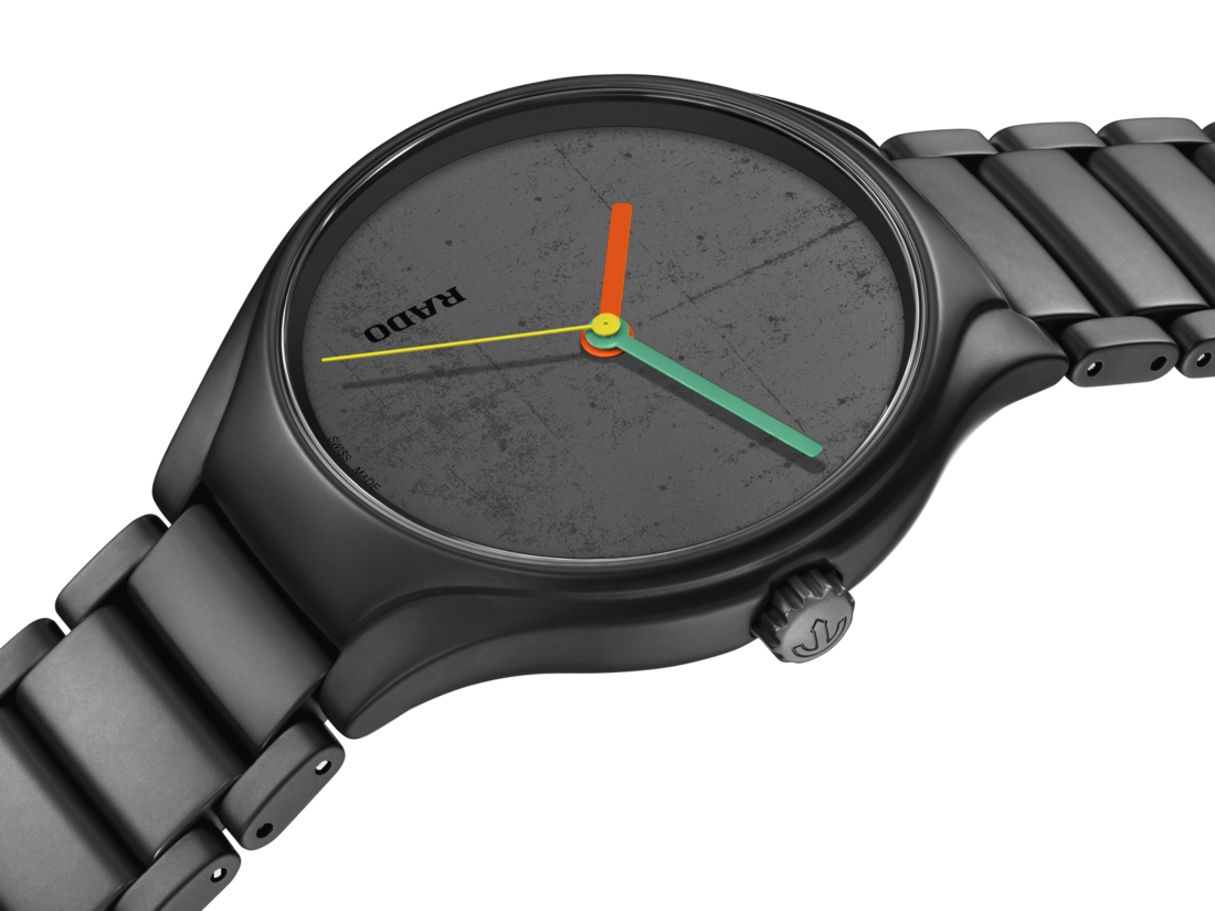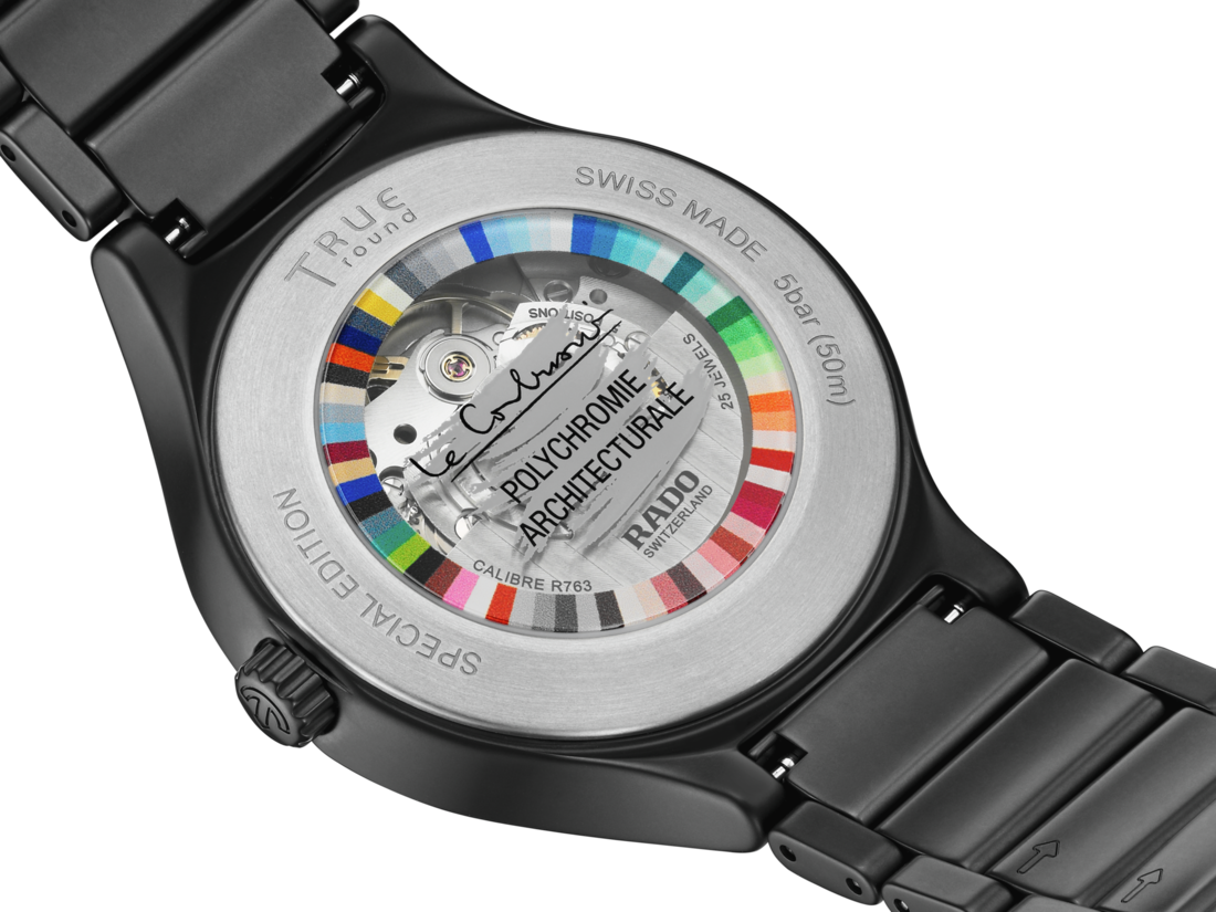 A high-tech ceramic bracelet and monobloc case in matt NOIR D’IVOIRE (4320E) match the colour from Le Corbusier’s Polychromie Architecturale, confirming Rado as the Master of Materials. They also guarantee wearer comfort. The curved sapphire crystal and high-tech ceramic ensure that the watch maintains its as-new appearance. An anti-reflective coating on both faces of the crystal gives a clear view of the dial, which is laser engraved with an abstract representation of the concrete surface texture of the Palace of Assembly in Chandigarh, India. The Rado logo is vertical at 8 o’clock. Designed to be complementary, the hands feature other colours from the Polychromie Architecturale: ORANGE VIF (4320S), VERT 59 (4320G) and VERT OLIVE (4320F). The watch is powered by the Rado calibre R763 automatic movement, offering an 80-hour power reserve and featuring an antimagnetic Nivachron™ hairspring. Tested and adjusted in five positions, it exceeds standard testing requirements to guarantee reliability and accuracy.