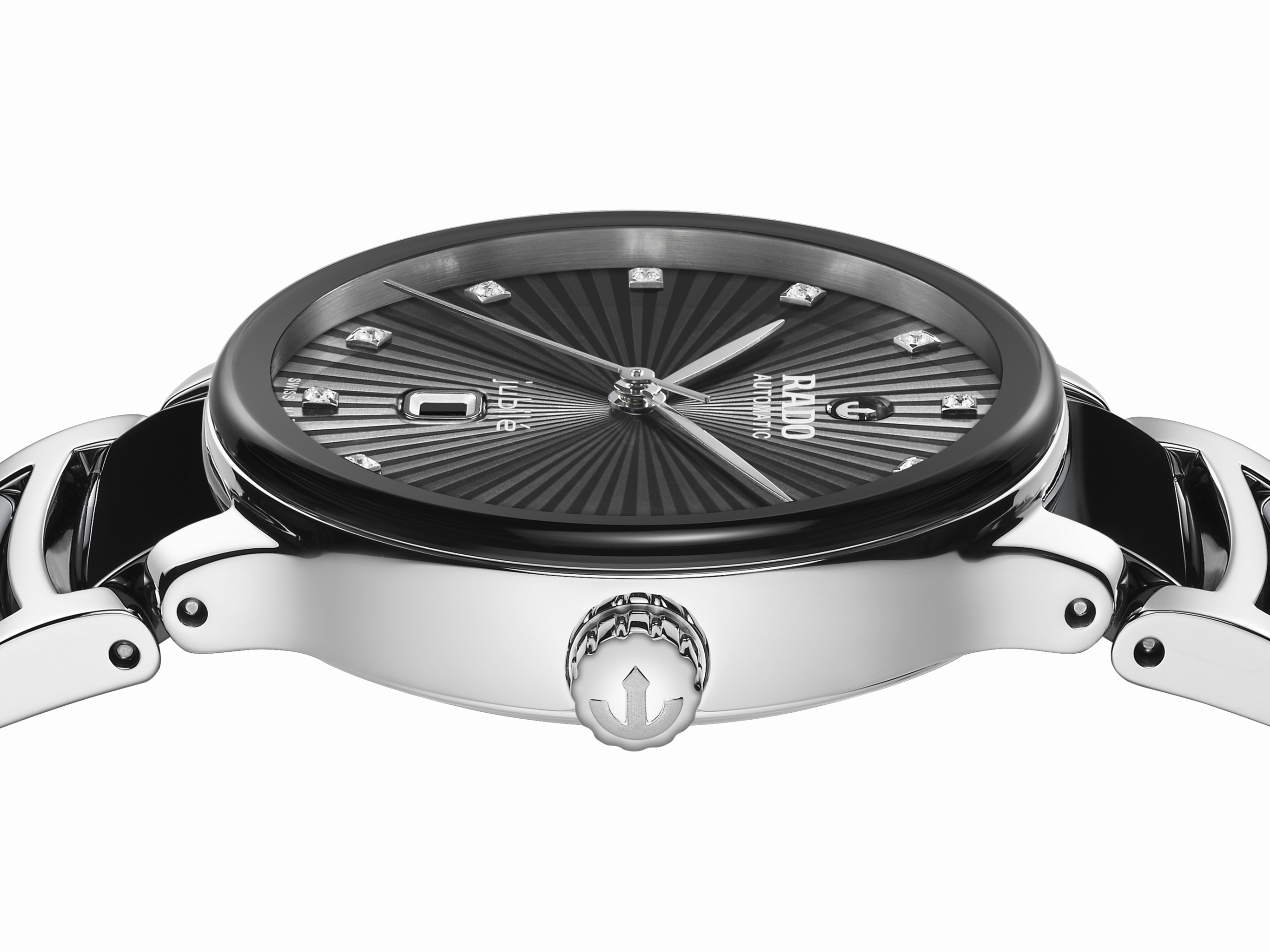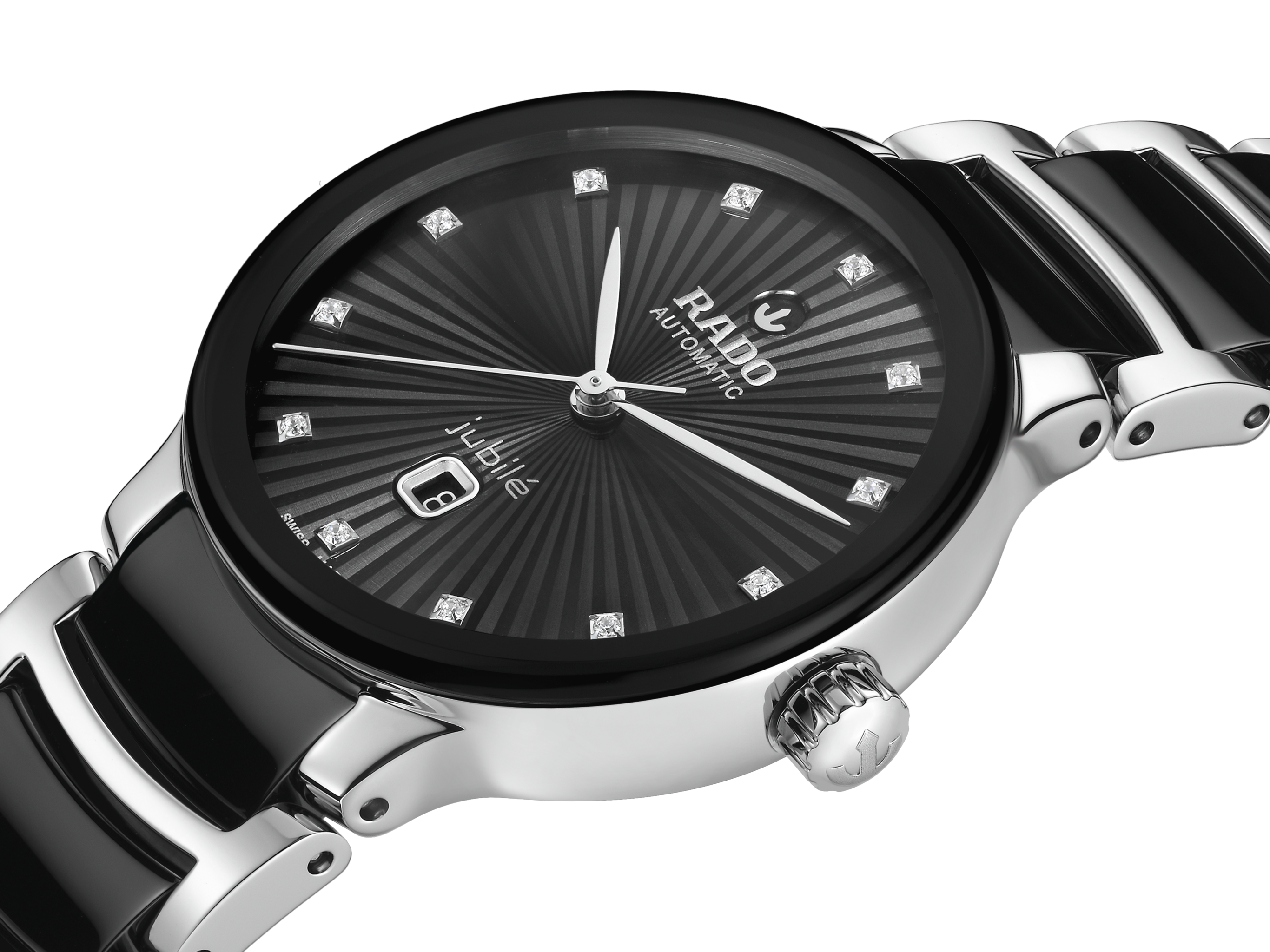 The classic Centrix Automatic Diamonds watch has been reworked not only technically, but also aesthetically. The modified model has a rounded sapphire crystal that extends all the way to the edge and a curved case blending with the curved crystal edge. The adjusted case lugs and the bracelet made of polished stainless steel with black high-tech ceramic middle links complete the overall appearance of this iconic timepiece. The black facetted dial has an opulent 3D effect created by stamping a shaped dial and then filling it with lacquer. The three-hand calibre R582 movement inside exceeds standard accuracy test requirements from 3 to 5 positions, thanks to its antimagnetic Nivachron™ hairspring for increased reliability and accuracy. The watch is water resistant down to 50 m and offers 48 hours of power reserve.