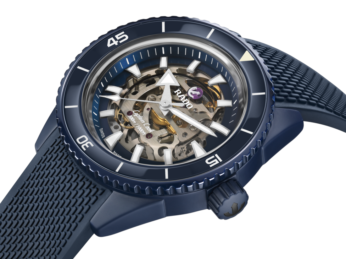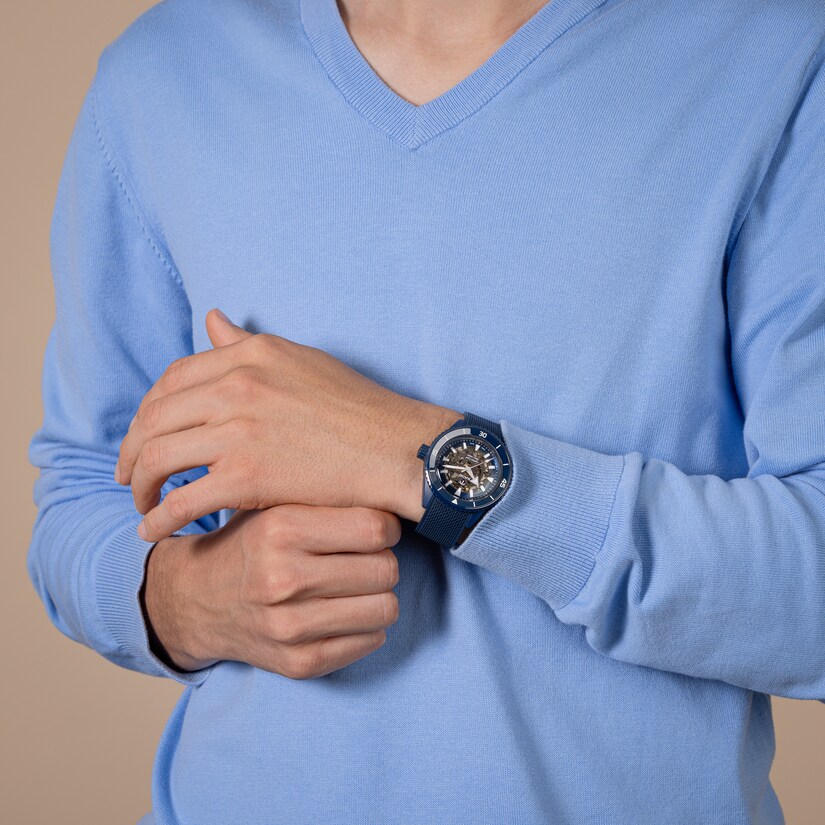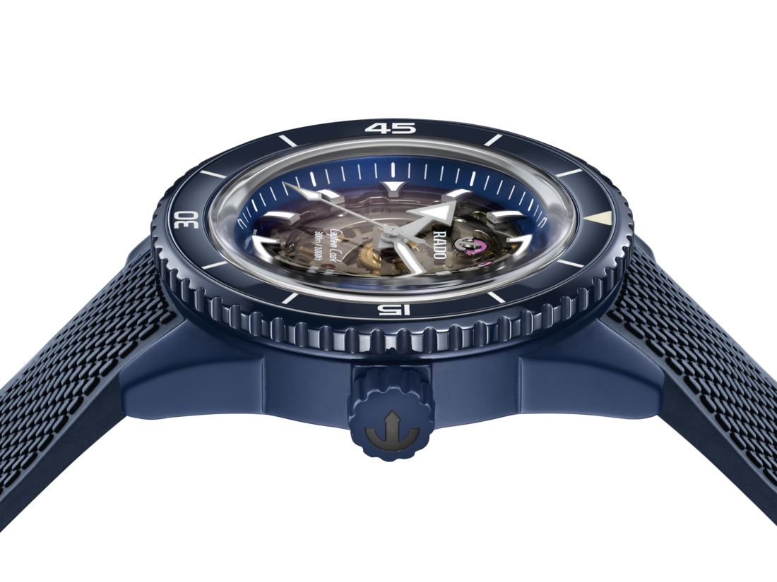 The Captain Cook High-Tech Ceramic Skeleton showcases its innovative R808 movement, a marvel of contrasts, know-how and clever geometry, that allows a distinct view of the various parts. It’s equipped with an anti-magnetic and highly reliable NivachronTM hairspring that has been fully tested in five positions and provides up to 80 hours of power reserve. The superb matt navy blue high-tech ceramic monobloc case is topped by a polished navy blue high-tech ceramic rotatable bezel with a navy blue ceramic insert to match the case and lugs, for visual harmony. The dial is clear and spartan, with generous geometric indices and hour/minute/second hands in rhodium tones, treated with white Super-LumiNova® for best readability in low-light conditions. Thanks to a matching navy blue rubber strap and the high-tech ceramic buckle cover, the new Captain Cook shows its sporty side.