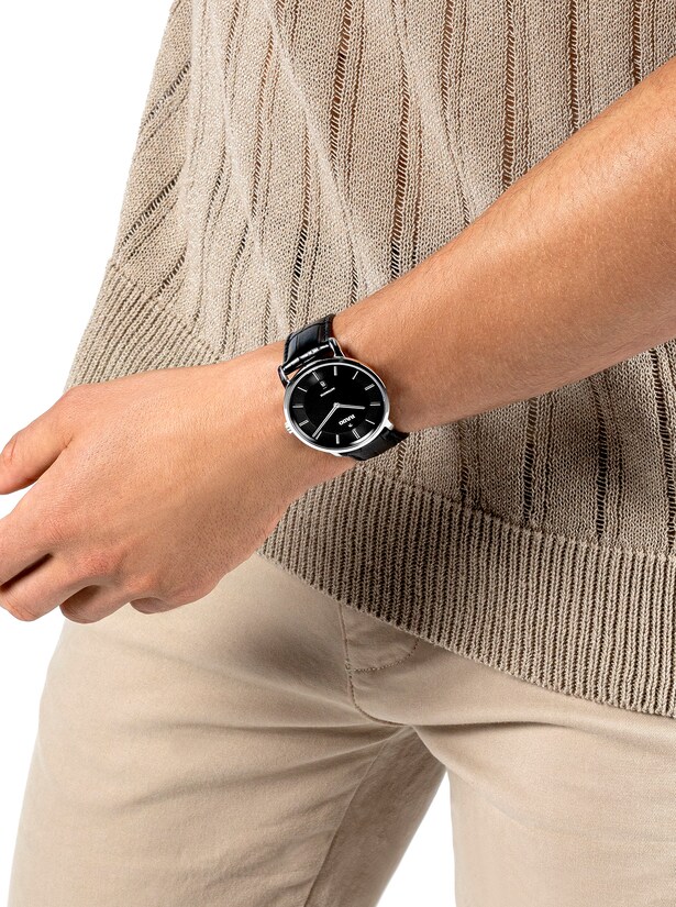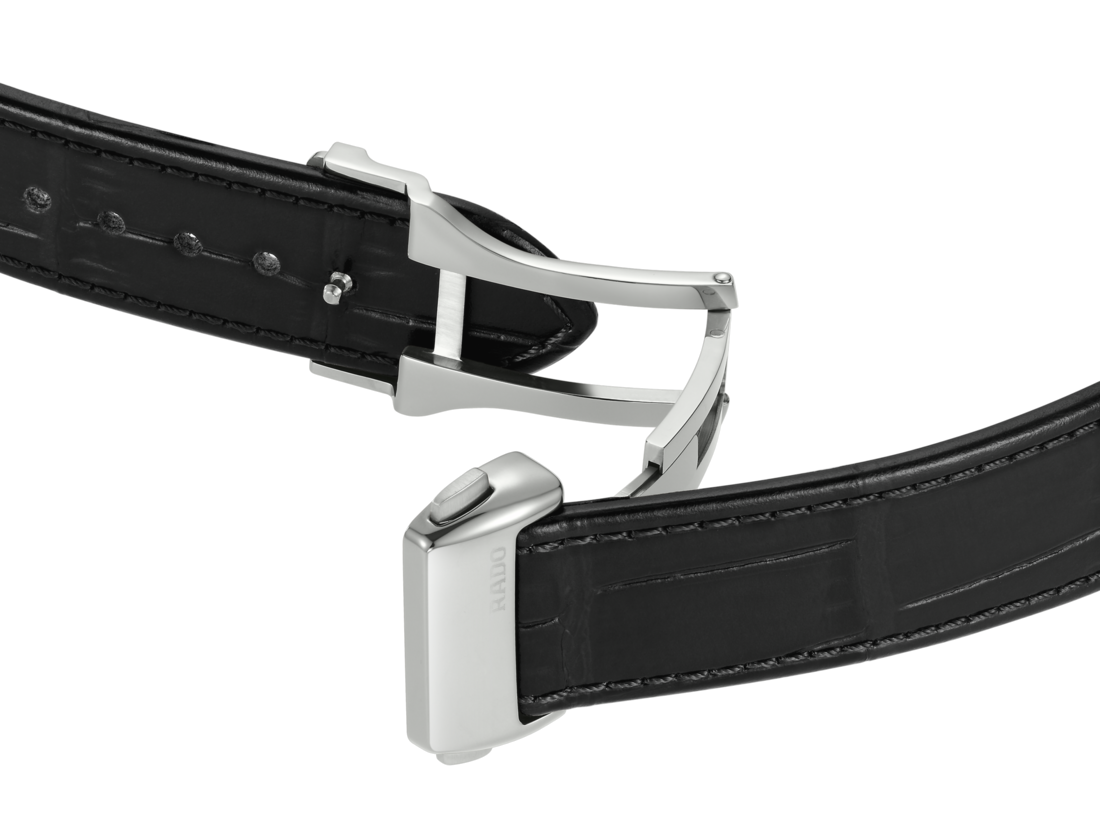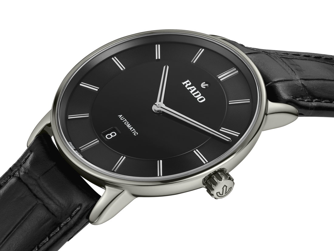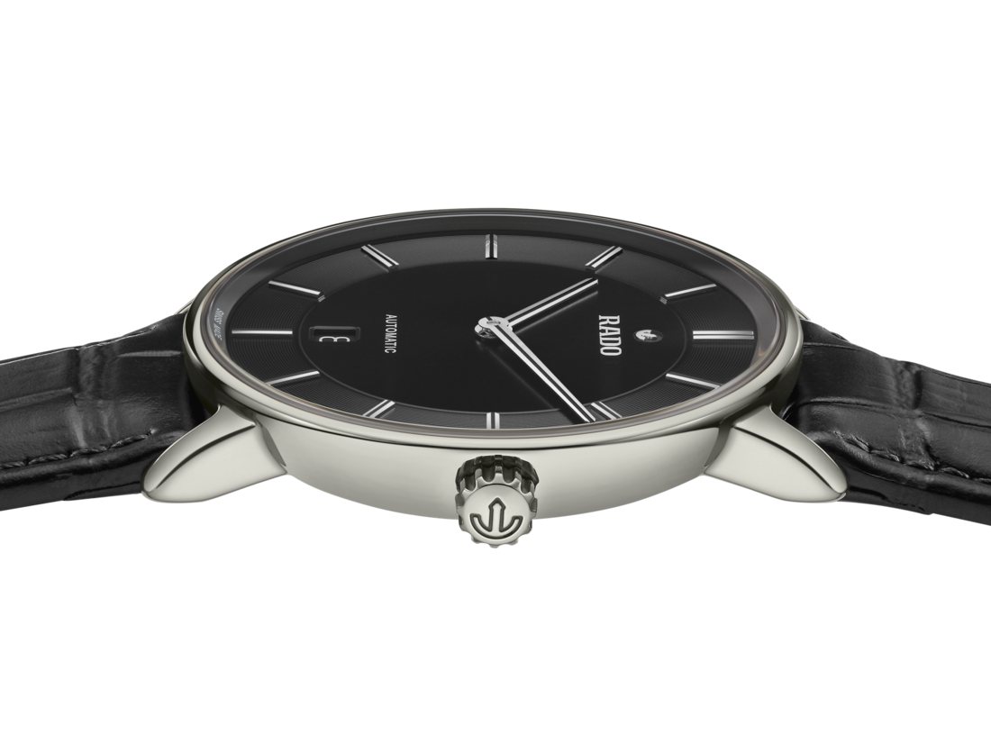 Introducing the Rado DiaMaster Thinline Automatic: Powered by the automatic Rado calibre R766 movement, this watch seamlessly combines tradition and innovation. With an impressive 72-hour power reserve this watch ensures long duration. Housed in a 41 mm polished platinum coloured Ceramos™ case, the DiaMaster Thinline Automatic exhibits a monobloc construction for enhanced durability. The pressed titanium case back, fitted with a sapphire crystal, adds a touch of sophistication. The black dial, accentuated by rhodium coloured applied indexes with a black veneer, showcases a captivating interplay of light and shadows. The rhodium coloured hands, also adorned with a black veneer, provide excellent legibility while adding a subtle touch of luxury. Completing the ensemble is a black leather strap featured with a buckle cover in polished platinum coloured Ceramos™ that exudes both refinement and comfort.