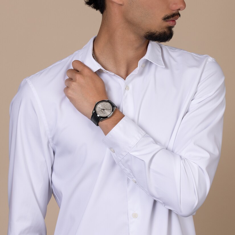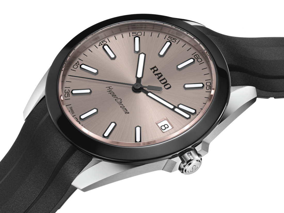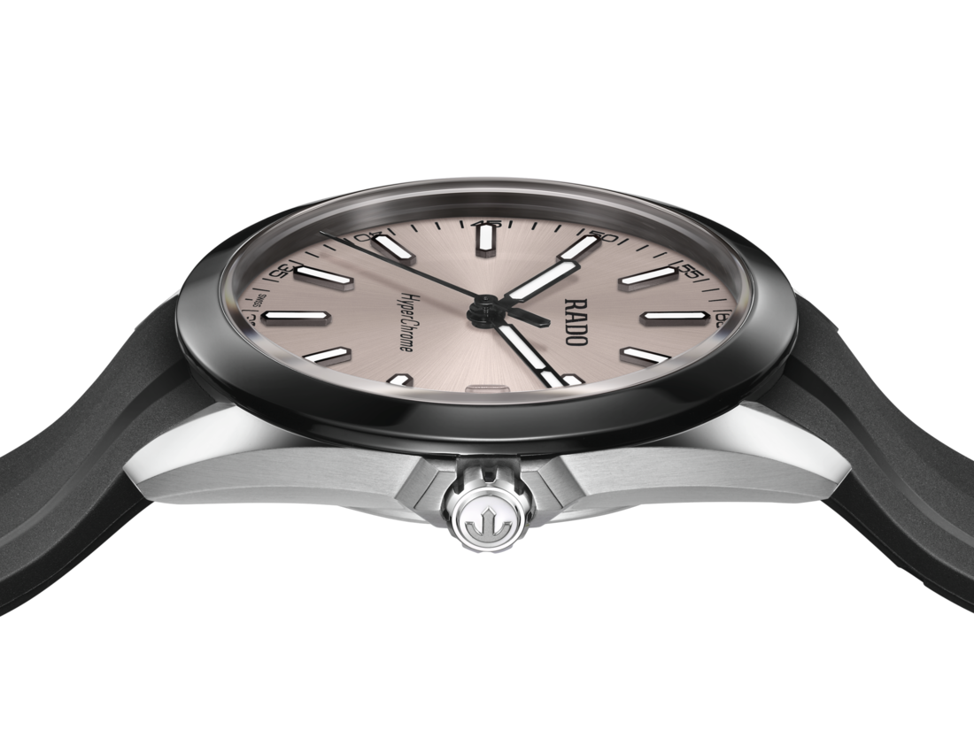 The HyperChrome Quartz is a contemporary expression of precision and material mastery, combining advanced watchmaking technology with a bold and enduring design. The case, sculpted from polished and brushed stainless steel, is encircled by a polished black high tech ceramic bezel—an elemental combination of strength and refinement. Topping this resilient construction is a curved sapphire crystal with anti-reflective coating on the inner side, offering exceptional scratch resistance and crystal-clear legibility. With water resistance to 15 bar (150 metres), every element of the architecture is designed for lasting precision, durability, and confidence in any setting. At the heart of the watch, the Rado calibre R292 ensures exceptional accuracy and reliability. This 3-jewel quartz movement combines PreciDrive and HeavyDrive technologies, enabling precise regulation of each impulse and maintaining a deviation of no more than ±10 seconds per year. A discreet date window at 3 o’clock integrates seamlessly into the dial’s balanced Sdesign. The rhodium sunray dial offers a refined contrast to the black PVD coated hands and indices, all treated with white Super-LumiNova® for optimal legibility in low light. At night, the twelve o’clock index and the minute hand emit a green glow, while the remaining indices and the hour hand radiate blue, ensuring quick, intuitive time reading in any lighting condition. Completing the case is a black rubber strap, secured by a polished and brushed stainless steel pin buckle that ensures a precise and comfortable fit at all times.