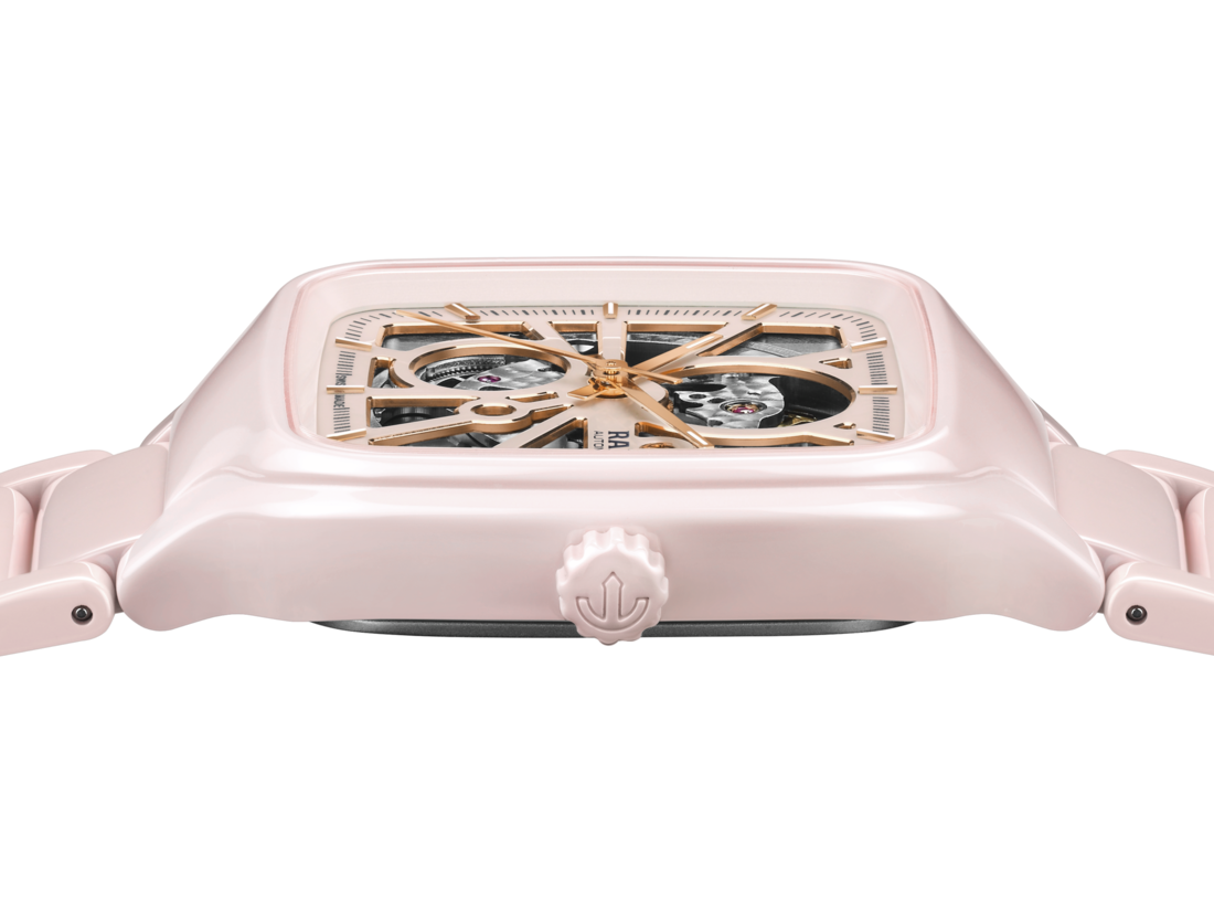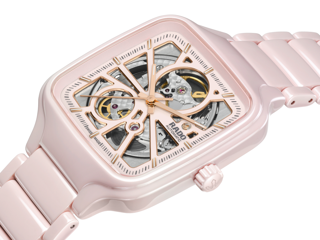 The Rado True Square open heart unites complex high-tech materials and ultra fine craftsmanship. The 38mm polished rose high-tech ceramic monobloc case is lightweight, hypoallergenic with exceptional hardness and durability, rated at 1,250 Vickers. It forms a resilient case for the calibre R734, equipped with 25 jewels, an 80-hour power reserve and an antimagnetic Nivachron™ hairspring. Crowned by a flat sapphire crystal, the dial reveals an open heart architecture that showcases the inner workings with refined clarity. The rose sunray dial is precisely sculpted, its bevelled apertures framed in matching rose gold tones to accentuate the mechanical beauty beneath. Rose gold coloured applied indexes filled with white Super-LumiNova are complemented by finely printed grey minute markers, achieving a harmonious and precise composition. Visible through the open section, the movement holder is adorned with Côtes de Genève, while the dial side of the movement features elegant circular graining. Slightly above the three o’clock position, the iconic rotating anchor in rose gold brings a dynamic touch to this display of horological finesse. Completing the case design is a polished rose high-tech ceramic bracelet, which is secured by a titanium 3-fold clasp, delivering the exceptional wearing comfort that high-tech ceramic provides.