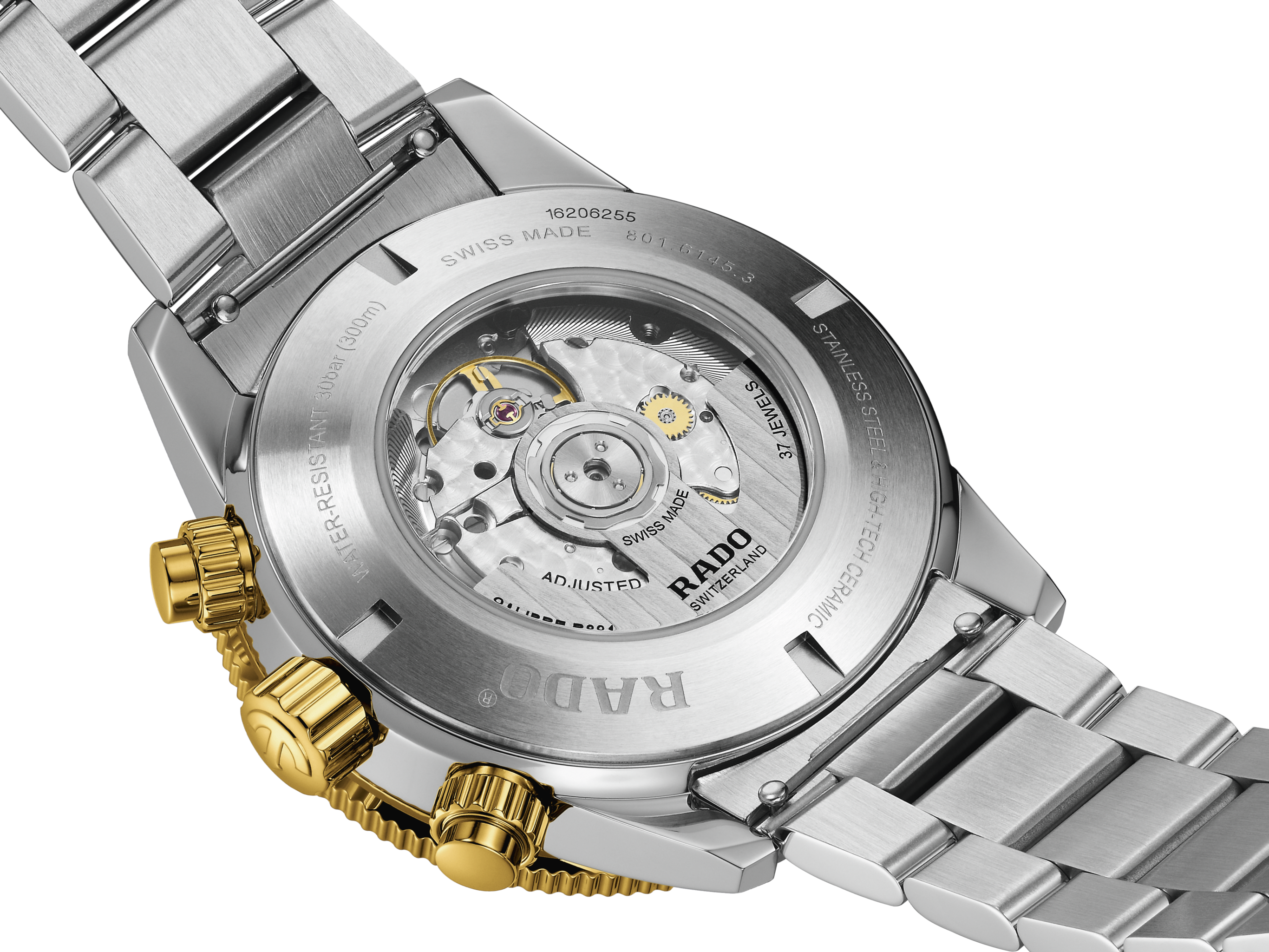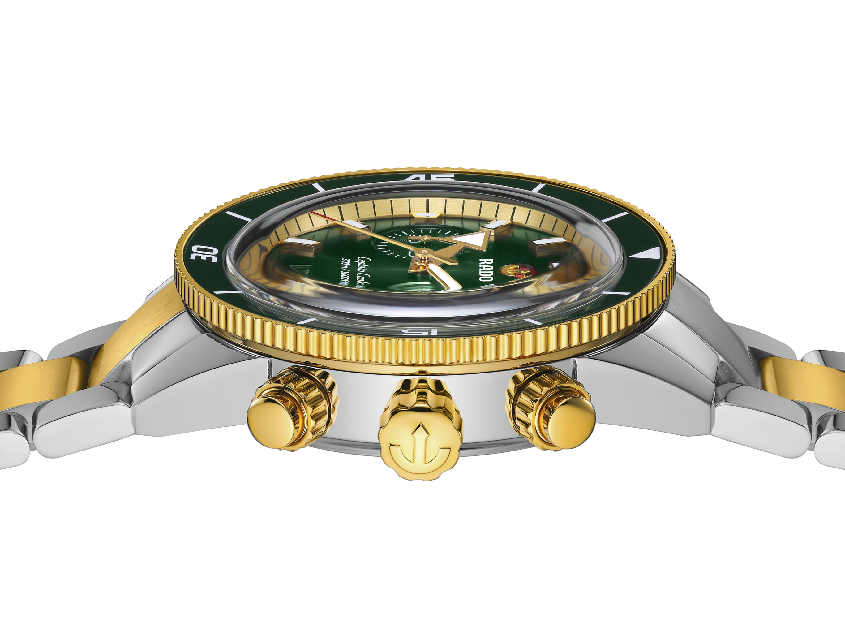 Embark on a journey of style with the Rado Captain Cook Automatic Chronograph watch. Equipped with the automatic Rado calibre R801 movement, this watch delivers impeccable precision and reliability. With a 59-hour power reserve and an antimagnetic Nivachron™ hairspring, it ensures accurate timekeeping even in challenging environments. Adjusted in five positions, it surpasses expectations in terms of performance. The polished stainless steel case of 43 mm exudes a rugged elegance. The box-shaped sapphire crystal, with anti-reflective coating on both sides, offers exceptional durability and clarity. With a remarkable water resistance of 30 bar (300m), this watch is ready to accompany you on all your aquatic adventures. The dial boasts a captivating green to black gradient, reflecting the depth and allure of the ocean. The yellow gold-coloured applied indexes, enhanced with white Super-LumiNova®, ensure excellent legibility even in low-light conditions. To further enhance your experience, this timepiece comes with a special packaging that includes two additional straps: a green leather strap with polished yellow gold-coloured PVD and a green textile NATO style strap. With these options, you can effortlessly personalise your watch to match any occasion.