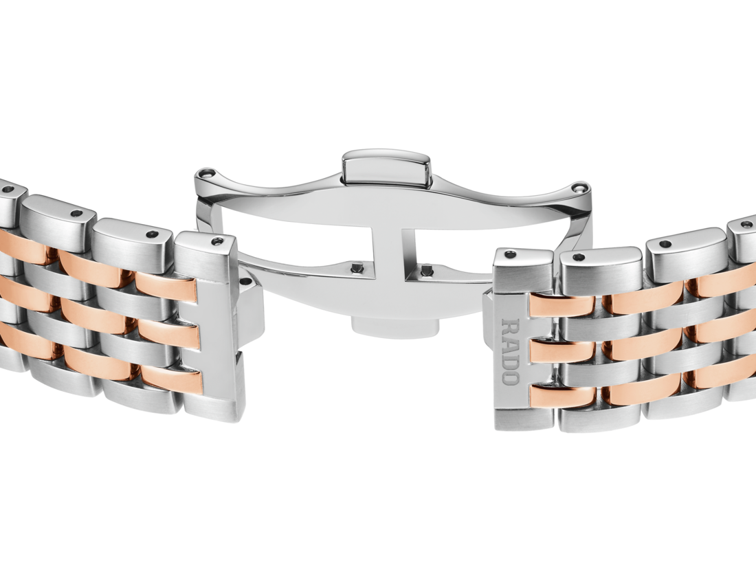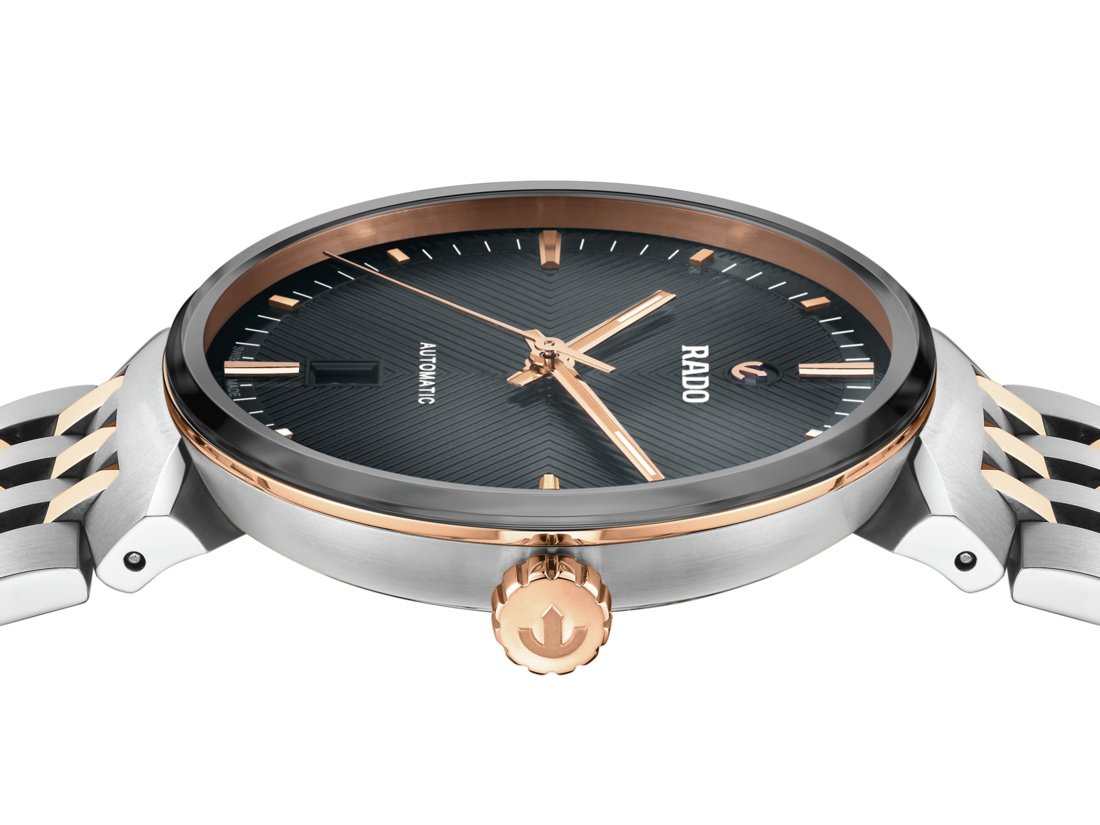 Discover the timeless blend of Swiss precision and elegance with the iconic Rado Florence. The 39 mm case is crowned with an edge-to-edge sapphire crystal, featuring a metallised edge that matches the stainless steel case. This sapphire crystal functions both as the protective front and as a bezel, seamlessly integrated into the case to enhance the Florence iconic refined profile. Serving as a theatre scene, the grey dial showcases extreme attention to detail with its sophisticated embossed pattern. The contrasting rose gold-coloured applied hour markers, topped by the moving Rado anchor symbol, finished with brushing and polishing, create a hypnotising contrast against the grey background. The case is complemented by a bi-tone bracelet combining polished rose gold-coloured PVD-coated stainless steel links with brushed stainless steel links, secured by a stainless steel three-fold clasp. Beneath the box-shaped sapphire crystal case back lies the soul of the Florence: the Automatic R763 calibre. Finely regulated in five positions and featuring a Nivachron™ hairspring, this movement delivers a high level of accuracy and a robust 80-hour power reserve, underlining Rado's commitment to perfection.