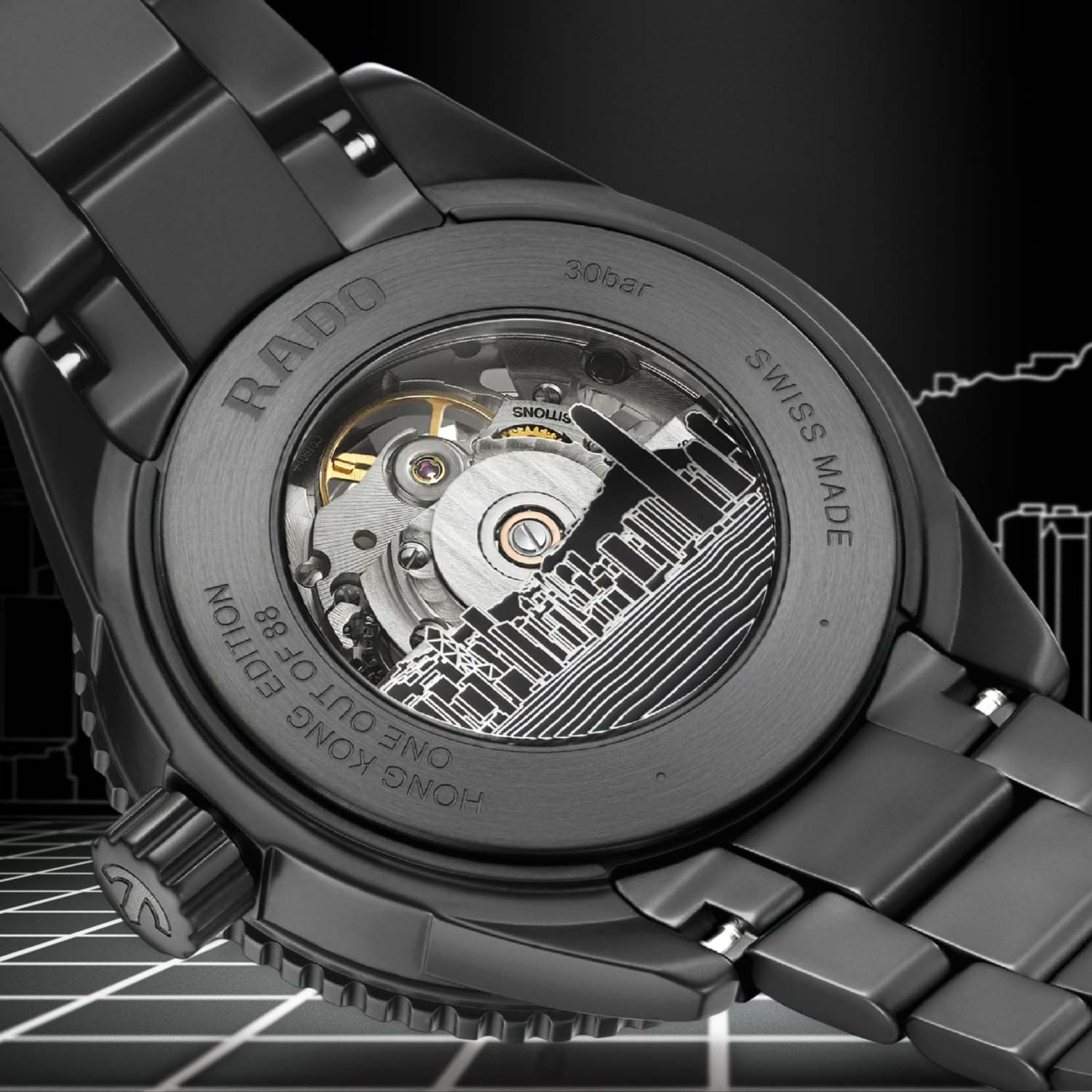 This Rado Captain Cook, exclusively available in Hong Kong and limited to just 88 pieces, is fully high-tech ceramic. Monobloc case, bracelet, bezel and crown. Lightness, comfort and durability are assured. The high-tech ceramic bezel features Rado anti-fingerprint technology with polished numbers, markers and triangle. Rado calibre R808 automatic skeleton movement, 80 hours of power reserve, antimagnetic Nivachron™ hairspring, exceeding standard testing requirements, being tested and adjusted in five positions. Visible through a black tinted sapphire crystal dial and an exhibition case back, horizontal brushed, nickel colour finish to the dial side, a nickel colour finish to the reverse. The case back is printed with an image of the Hong Kong skyline and the wording One Out Of 88. The indexes, hour and minute hand feature black Super-LumiNova®, the second hand has a red tip and white Super-LumiNova®. The box shaped sapphire crystal has an antireflective coating on both surfaces.