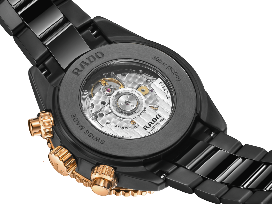 Precision forged through extreme engineering—the Captain Cook High-Tech Ceramic Chronograph is the result of uncompromising processes and material innovation. Born from pressure, heat, and technical mastery, its construction pushes the boundaries of what’s possible in modern watchmaking. The 43 mm monobloc case, crafted in matt black high-tech ceramic, is paired with a rose gold-coloured PVD-coated stainless steel turning bezel and a polished black ceramic insert, engraved with white Super-LumiNova® markers. Topped with a box-shaped sapphire crystal, forged at temperatures over 2,000°C and coated with anti-reflective layers on both sides, the crystal offers exceptional clarity and scratch resistance, only surpassed by diamond in hardness. At its core beats the Calibre R801, a self-winding chronograph movement developed for uncompromising reliability. Engineered with 37 jewels and regulated in five positions, it ensures precise timekeeping under the most demanding conditions. The movement is equipped with an antimagnetic Nivachron™ hairspring. With a robust 59-hour power reserve, the R801 exemplifies technical mastery and mechanical resilience, embodying the spirit of Swiss engineering and Rado’s continued pursuit of horological excellence. The black dial reflects a pure expression of function and form. Polished rose gold-coloured indexes and hands are coated with white Super-LumiNova®, while three precisely arranged counters display 12-hour, 30-minute, and small seconds functions. A date guichet at 6 o’clock and the iconic rotating anchor on a ruby backplate complete the dial’s mechanical signature. The design is completed by a matt and polished black high-tech ceramic bracelet, secured by a titanium 3-fold clasp for a seamless fit. Water-resistant to 30 bar (300 m), the Captain Cook High-Tech Ceramic Chronograph redefines adventure—uniting Swiss precision with contemporary elegance.