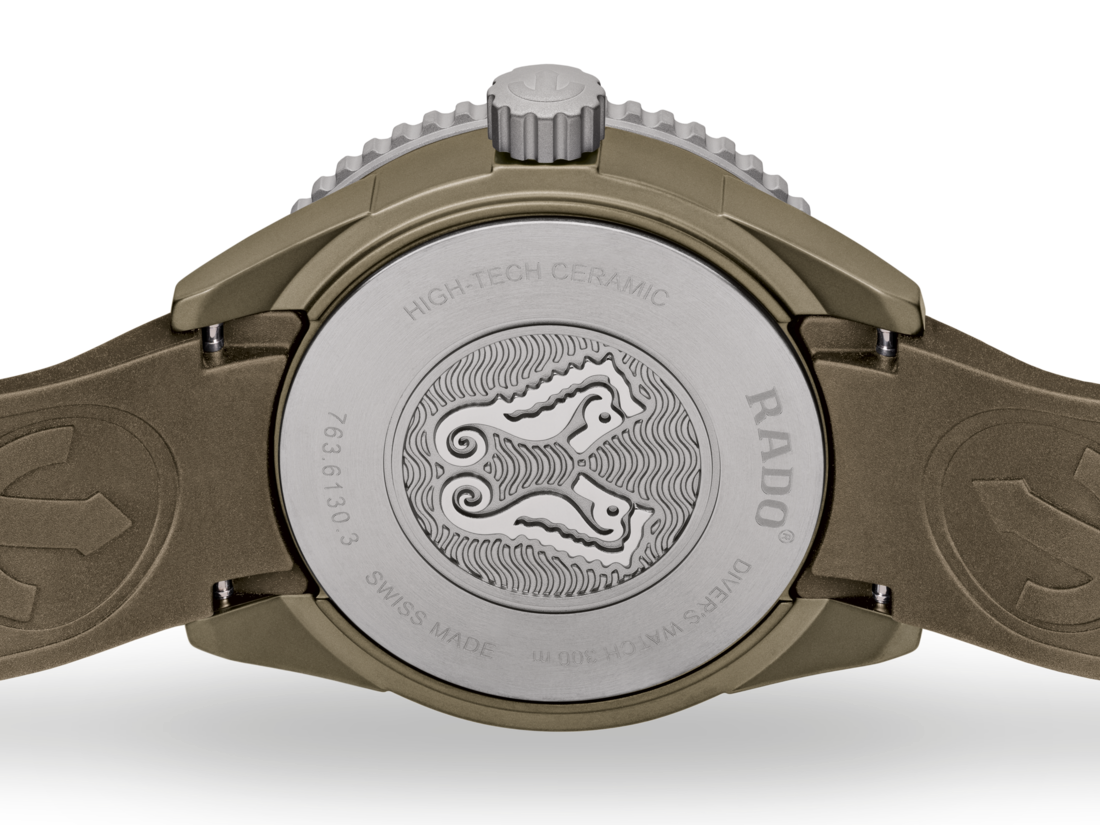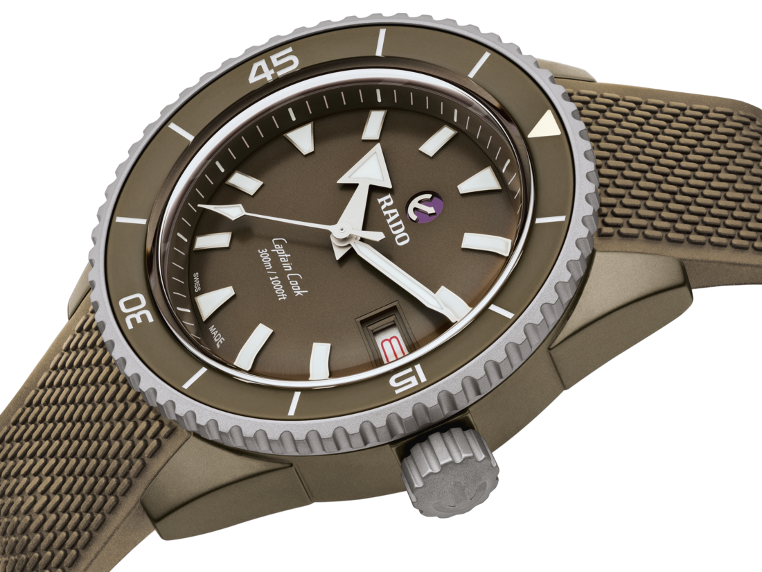 The Captain Cook High-Tech Ceramic Diver watch is water resistant down to 300 m. The hands and indices of the ISO 6425 certified diver's watch are coated with SuperLuminova® to ensure excellent visibility on the matte olive-green dial. The 43 mm monobloc case is made of matte olive-green high-tech ceramic, while the rotating bezel is made of polished stainless steel. Inside, the Rado R763 automatic movement exceeds standard accuracy test requirements from 3 to 5 positions and offers 80 hours of power reserve. This model comes with a matte olive-green rubber strap. Whatever your field of exploration is, your Captain Cook High-Tech Ceramic Diver will be a reliable and solid partner at your side for years to come.