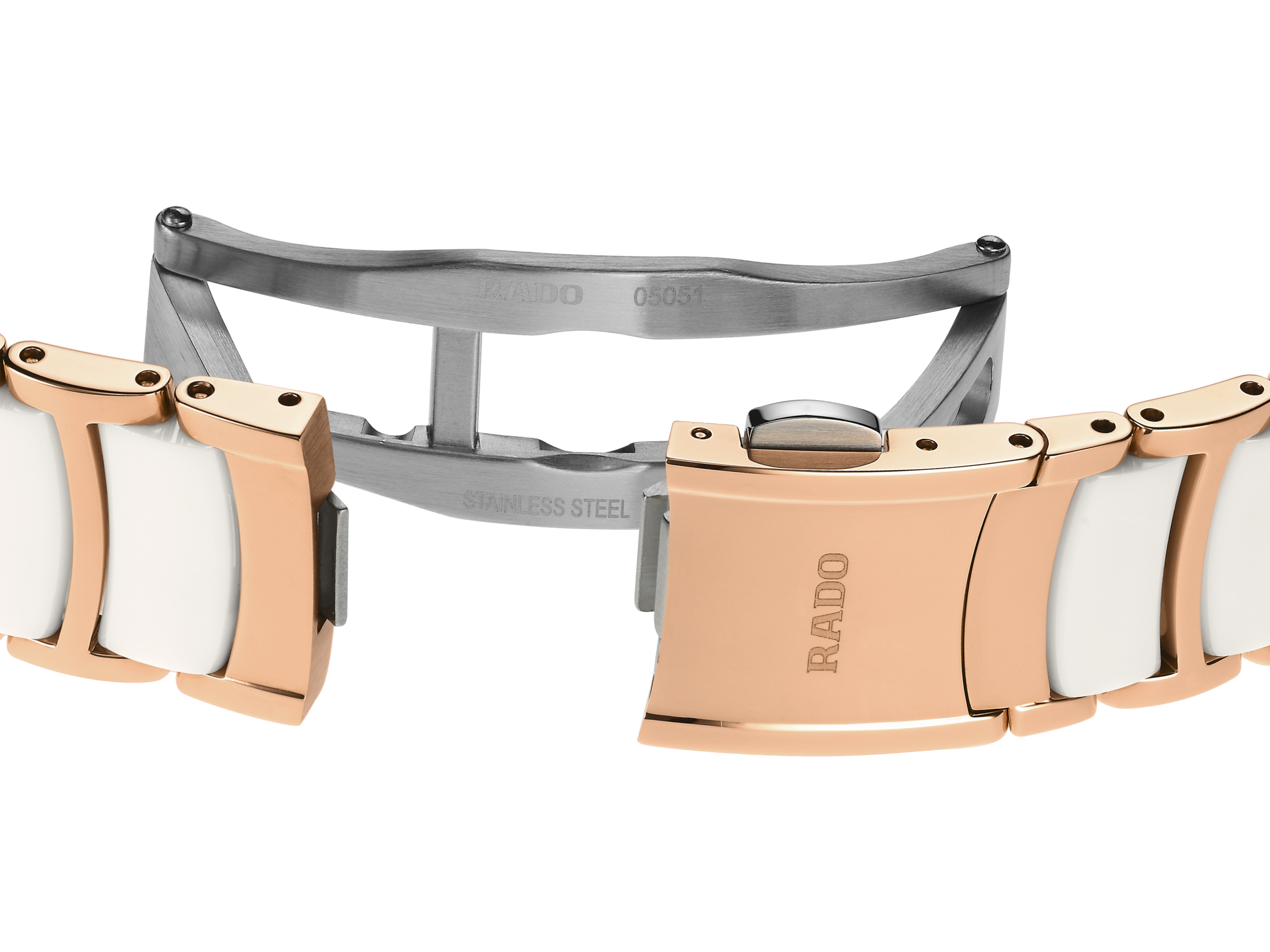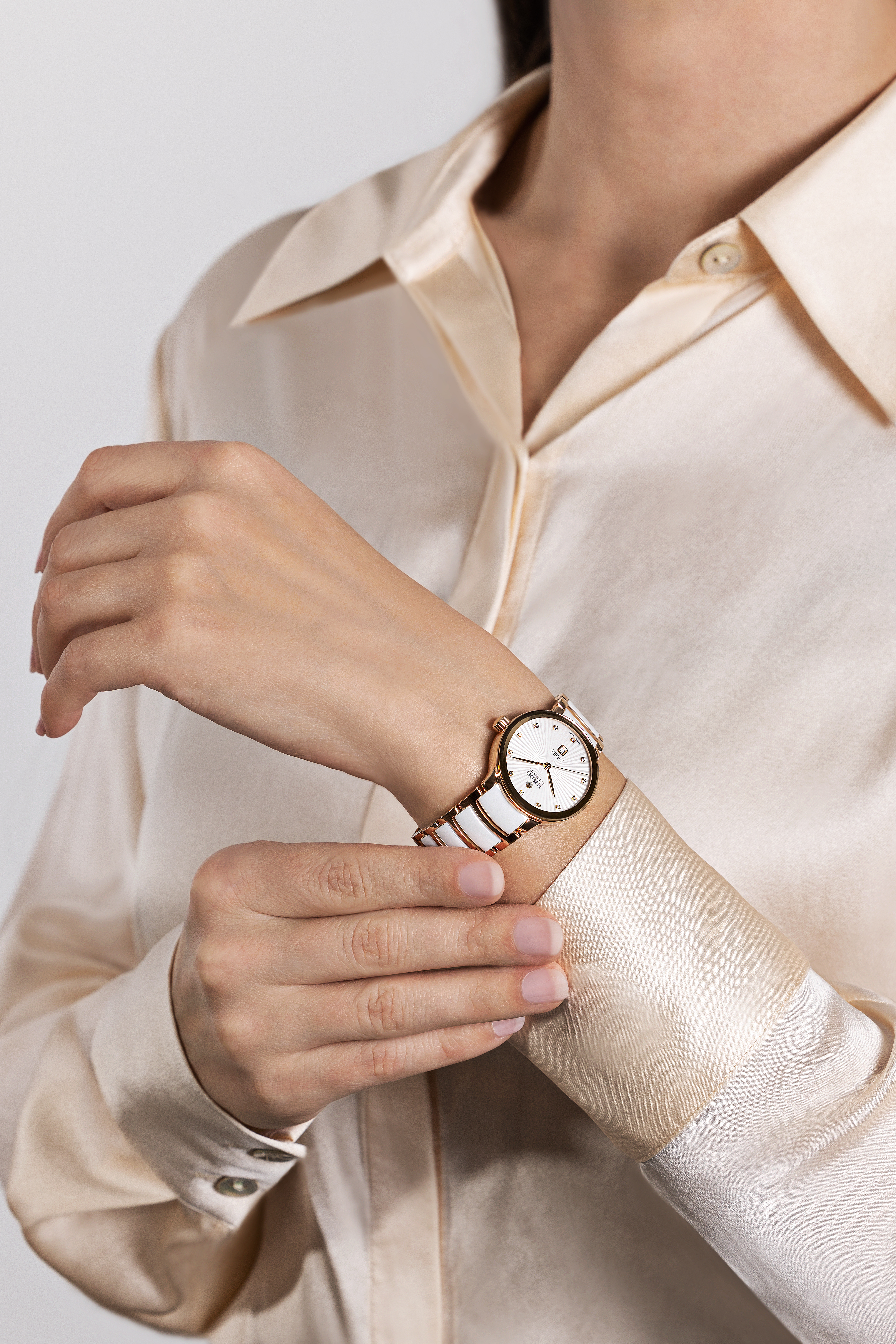 The classic Centrix Automatic Diamonds watch has been reworked not only technically, but also aesthetically. The modified model has a rounded sapphire crystal that extends all the way to the edge and a curved case blending with the curved crystal edge. The overall appearance of this iconic timepiece is completed with adjusted case lugs and a bracelet made of polished rose-gold-coloured PVD-coated stainless steel with white high-tech ceramic middle links. The silver facetted dial has an opulent 3D effect created by stamping a shaped dial and then filling it with lacquer. Inside, the three-hand calibre R582 movement exceeds standard accuracy test requirements from 3 to 5 positions, thanks to its antimagnetic Nivachron™ hairspring for increased reliability and accuracy. The watch is water resistant down to 50 m and offers 48 hours of power reserve.