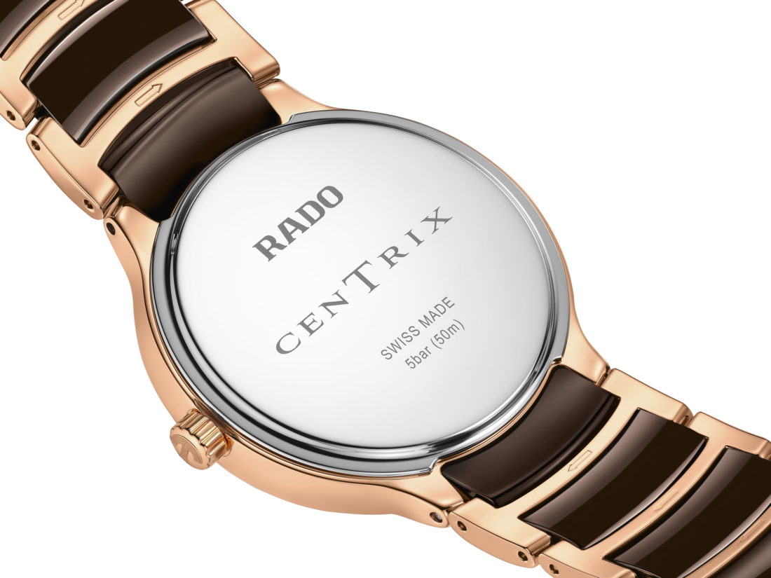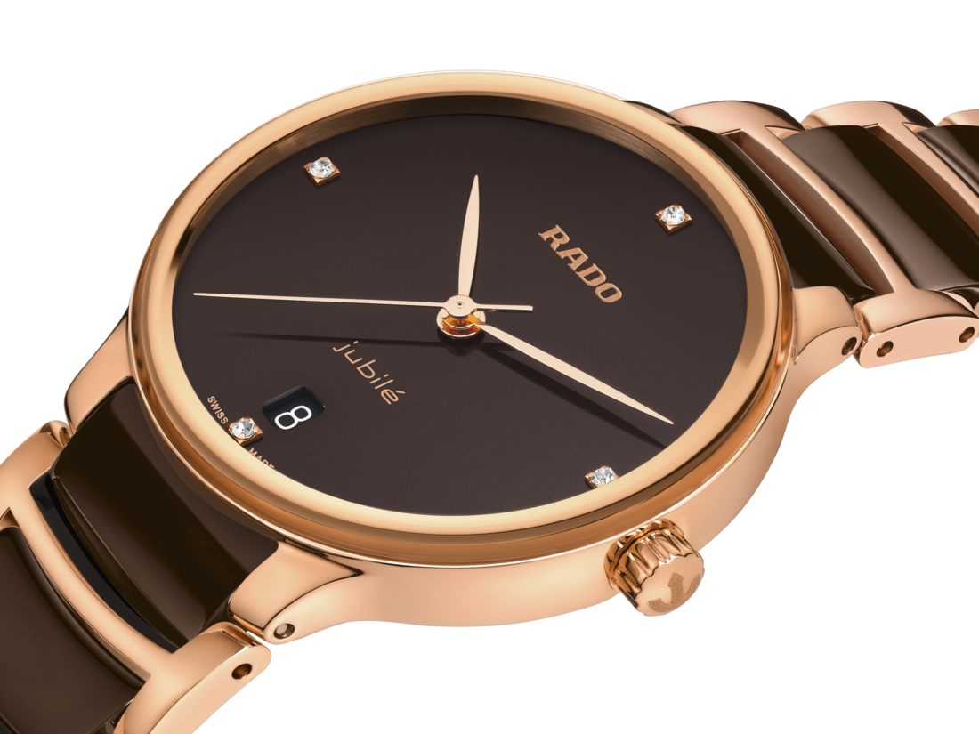 The classic Centrix Quartz Diamonds watch has been reworked not only technically, but also aesthetically. The modified model has a rounded sapphire crystal that extends all the way to the edge and a curved case blending with the curved crystal edge. The overall appearance of this iconic timepiece is completed with adjusted case lugs and a bracelet made of polished rose gold-coloured PVD-coated stainless steel with brown high-tech ceramic middle links. The brown lacquered dial with 4 diamonds, emphasised with the printed “jubilé” logo, matches perfectly with the rose gold-coloured hands. Thanks to the PreciDrive and HeavyDrive features in the calibre R073 quartz movement, the watch has greater accuracy and resistance to shocks. The watch is water-resistant down to 50 m.