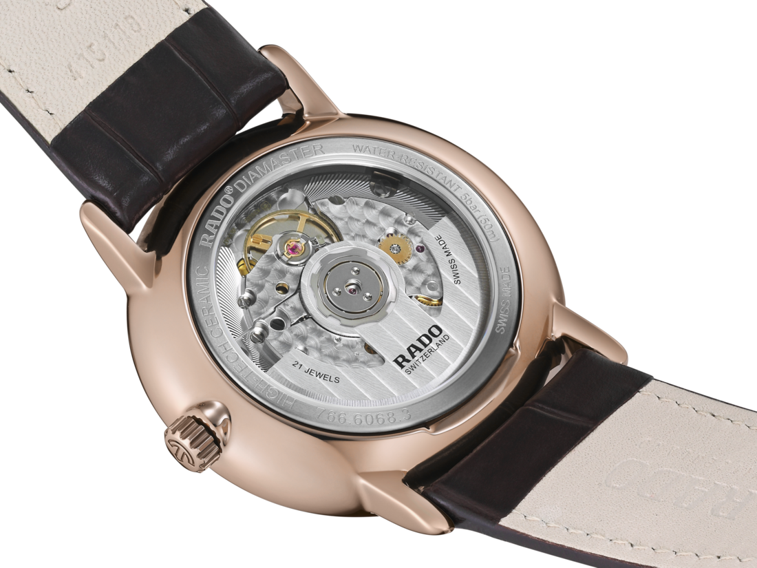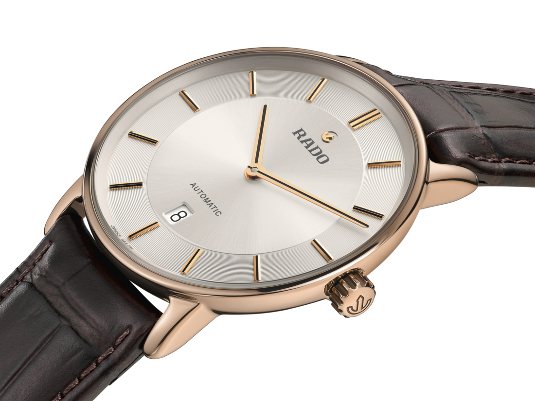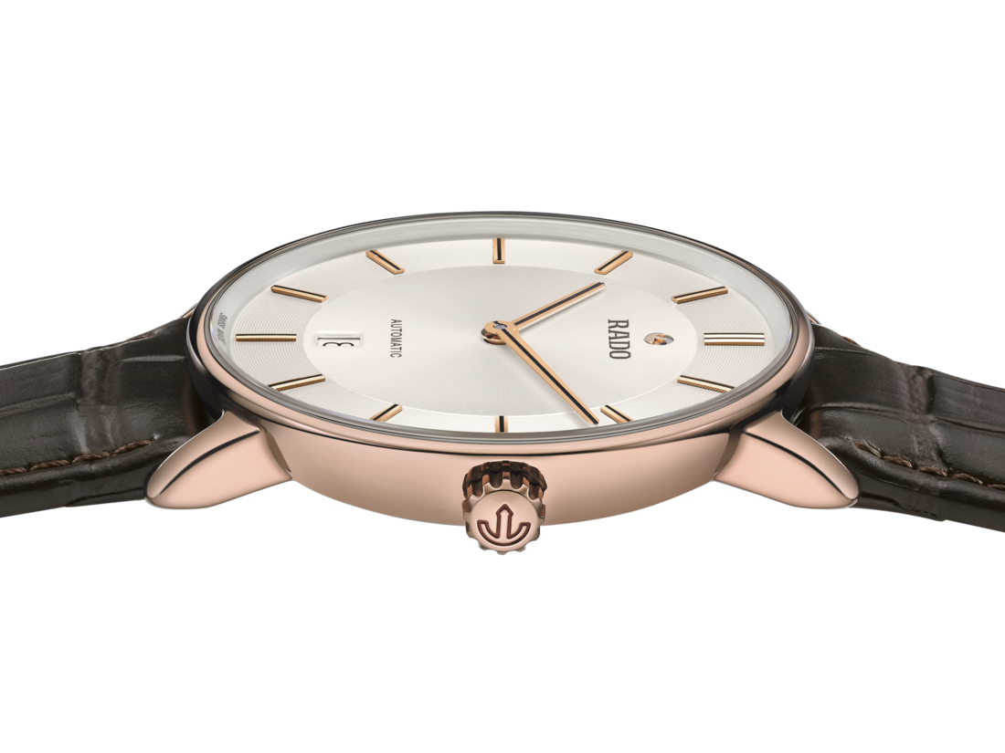 Introducing the Rado DiaMaster Thinline Automatic: Powered by the automatic Rado calibre R766 movement, this watch seamlessly combines tradition and innovation. With an impressive 72-hour power reserve this watch ensures long duration. Housed in a 41 mm polished rose gold coloured Ceramos™ case, the DiaMaster Thinline Automatic exhibits a monobloc construction for enhanced durability. The pressed titanium case back, fitted with a sapphire crystal, adds a touch of sophistication. The silver dial, accentuated by rose gold coloured applied indexes with a black veneer, showcases a captivating interplay of light and shadows. The rose gold coloured hands, also adorned with a black veneer, provide excellent legibility while adding a subtle touch of luxury. Completing the ensemble is a brown leather strap featured with a buckle cover in rose gold coloured Ceramos™ that exudes both refinement and comfort.