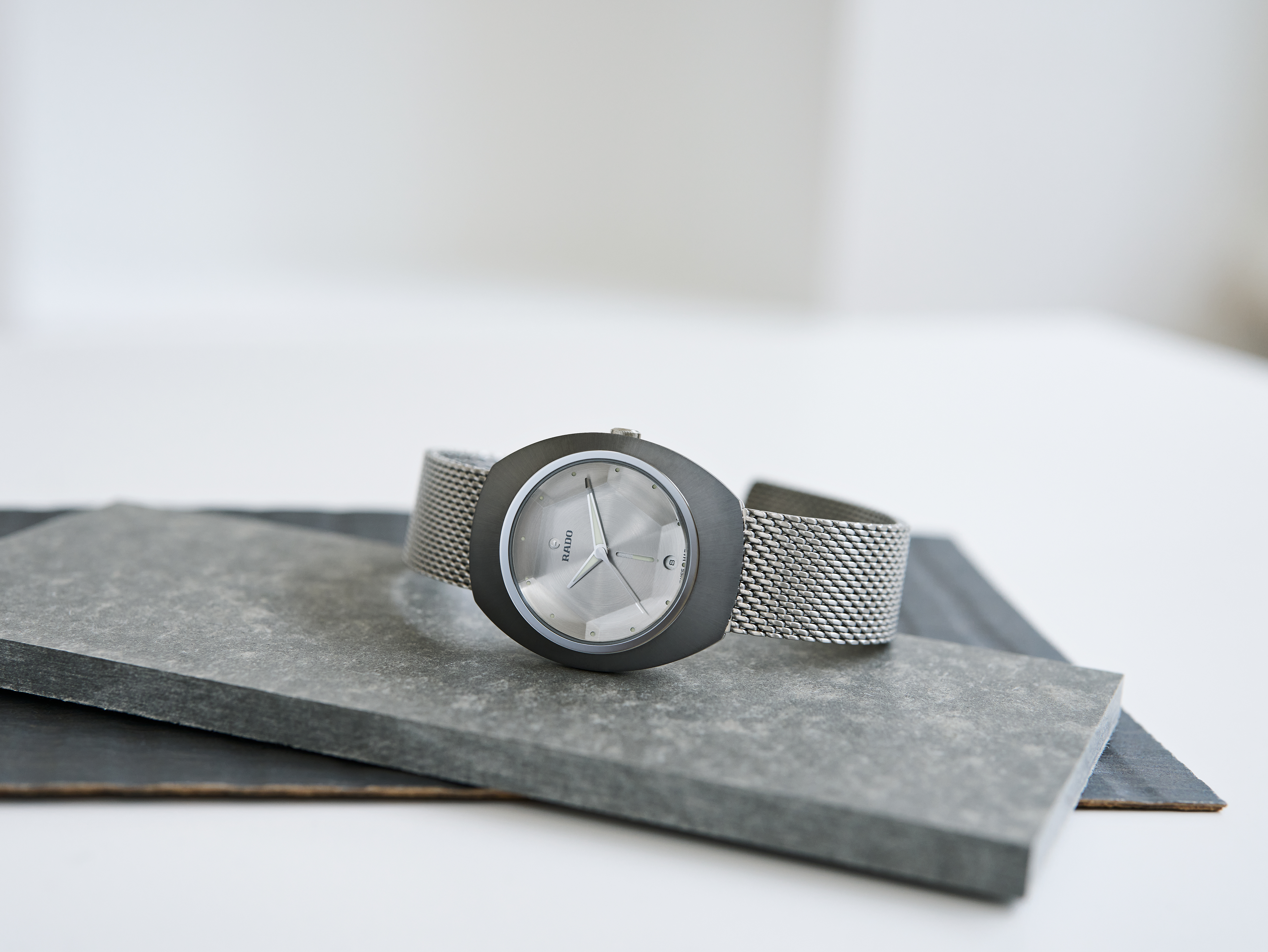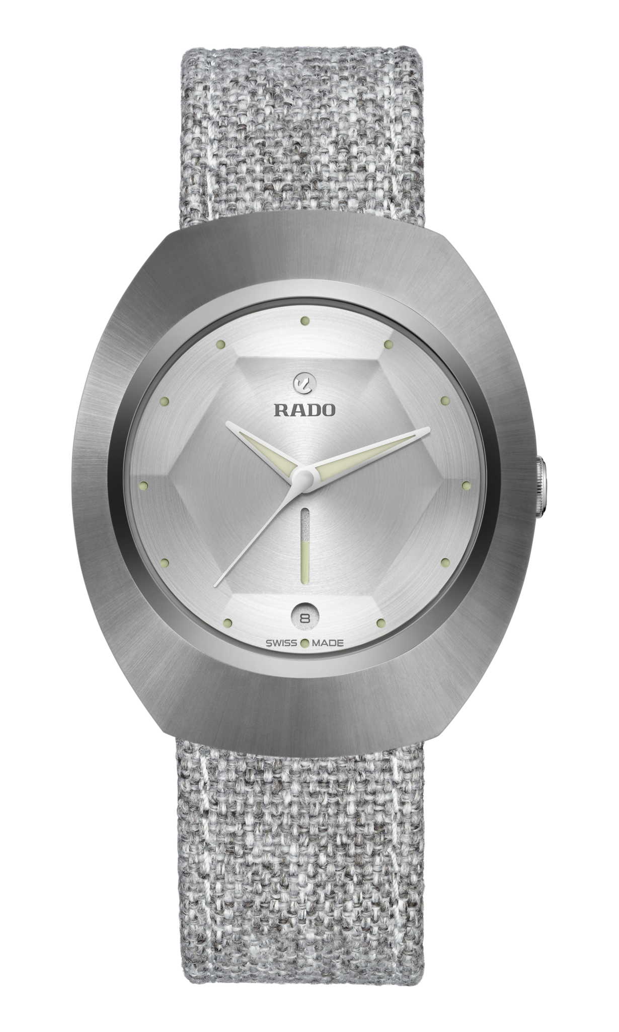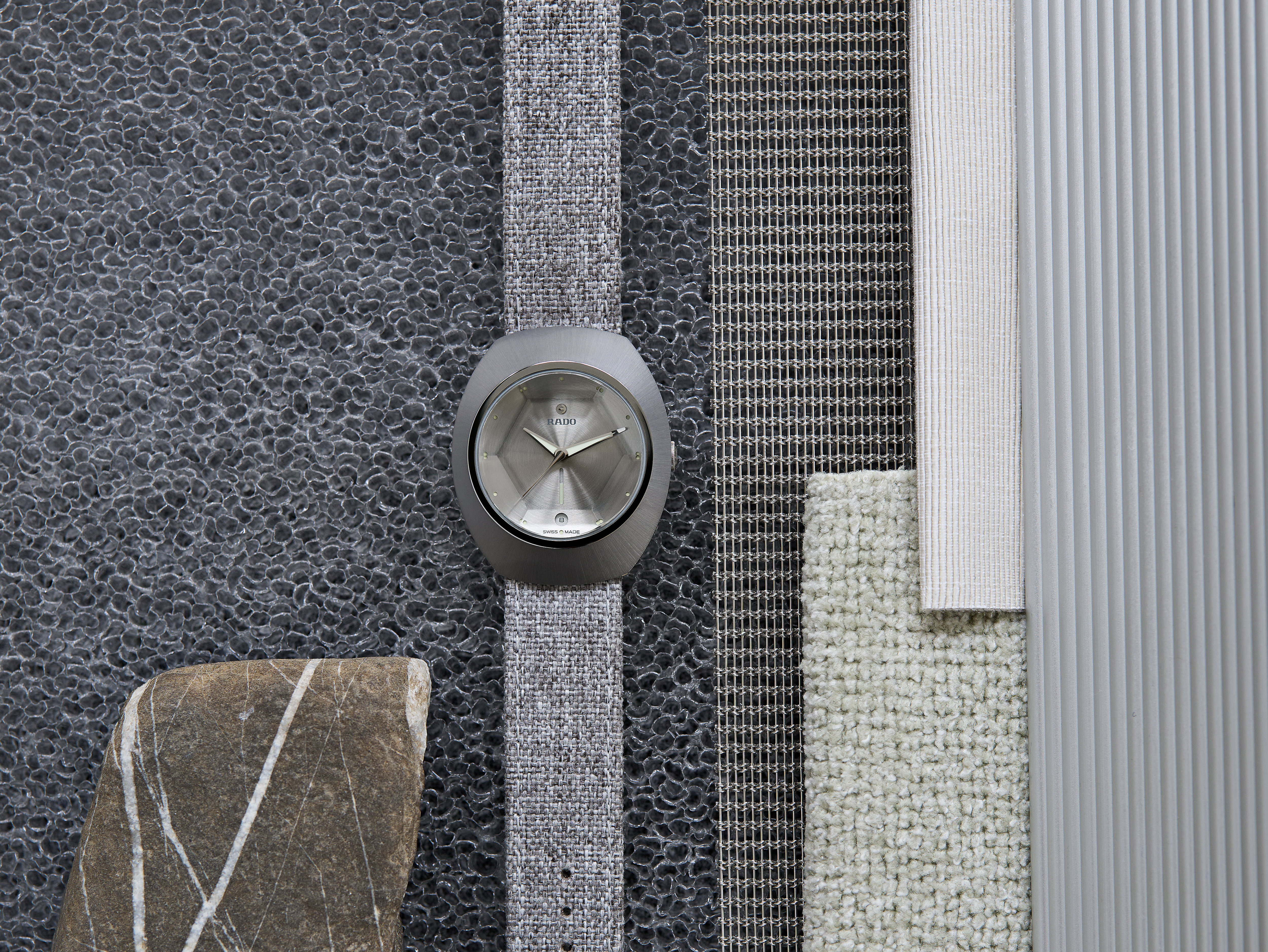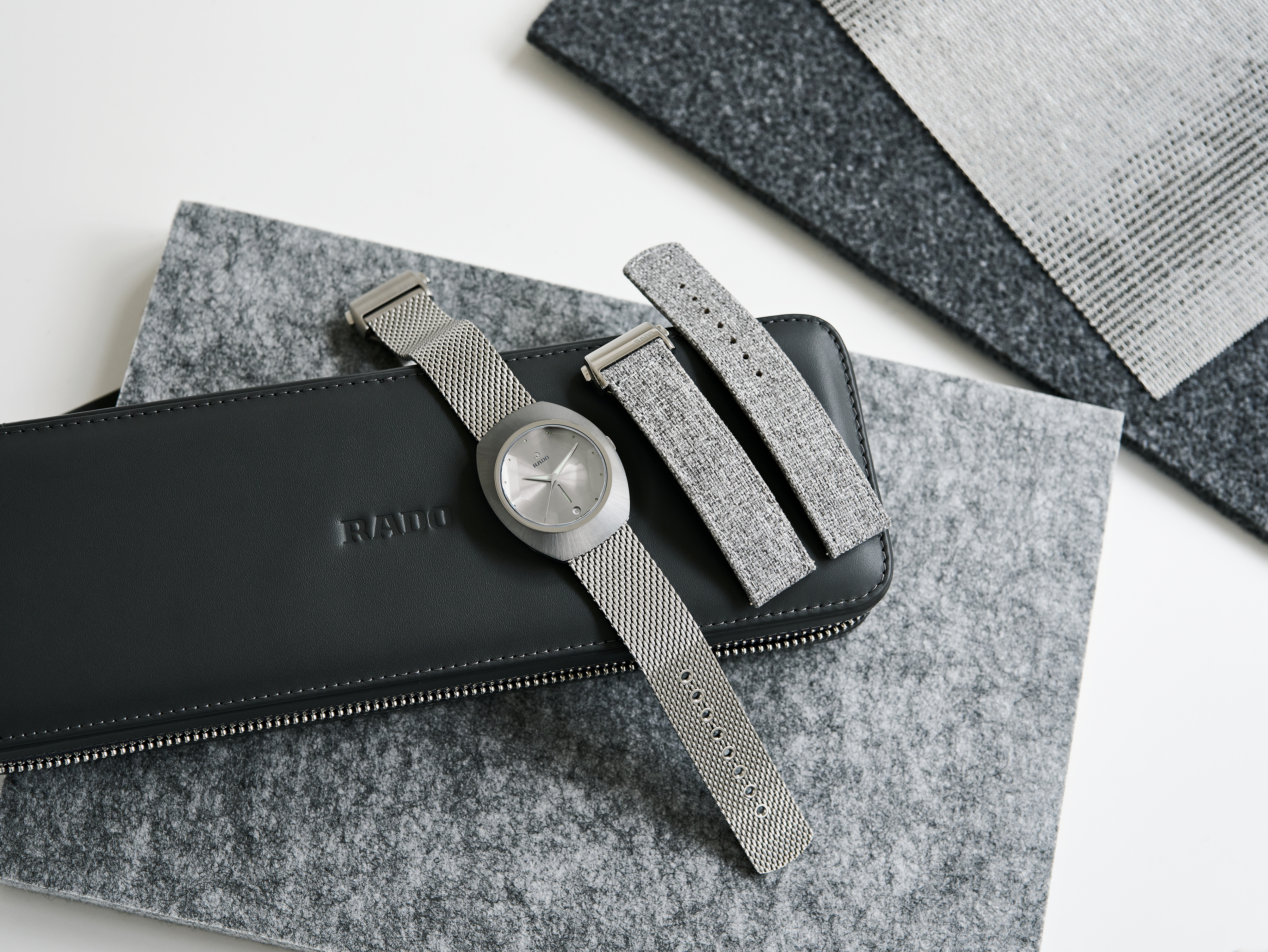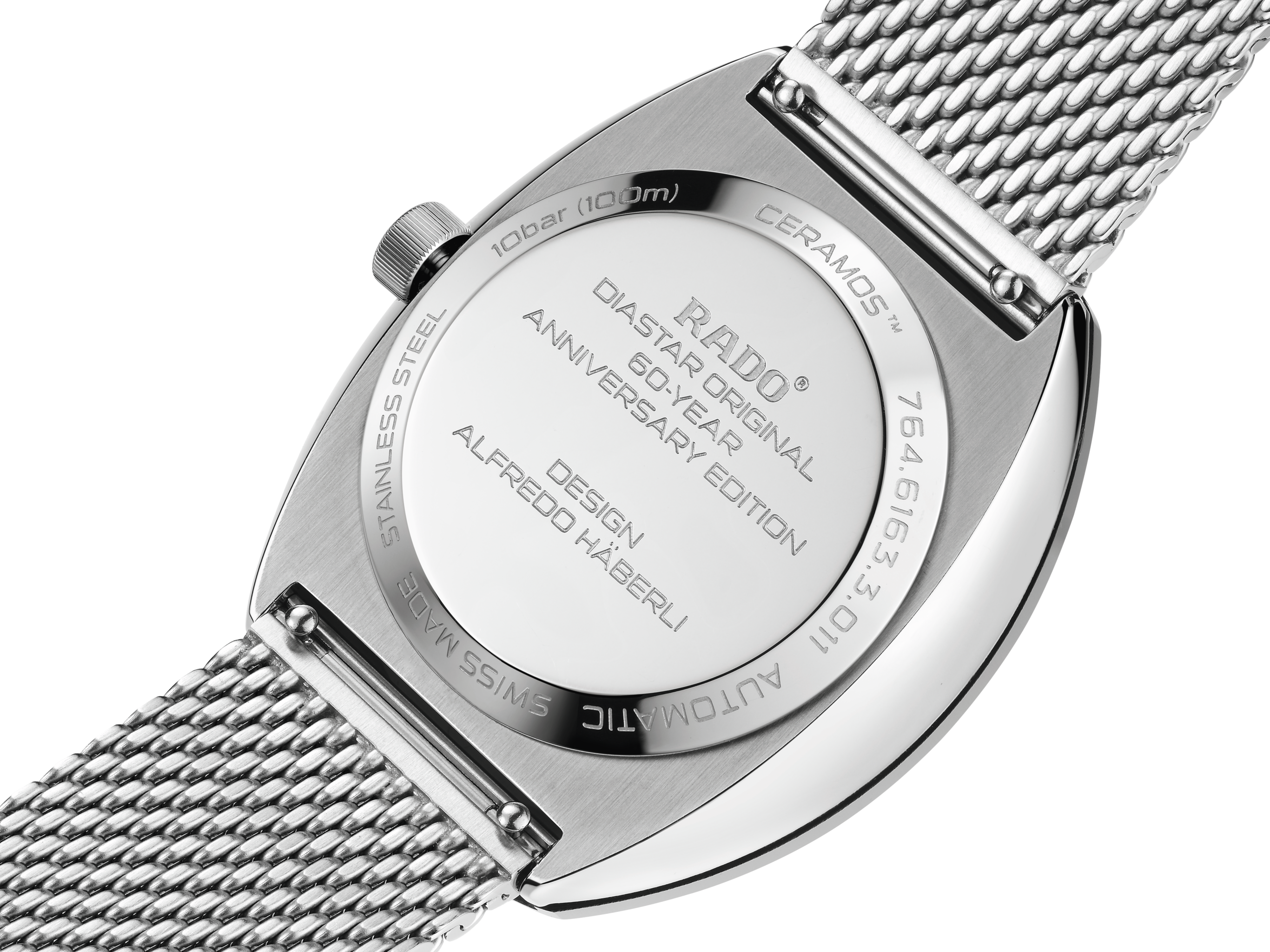 The DiaStar Original 60-Year Anniversary Edition has been created in collaboration with the Swiss designer Alfredo Häberli. Framed by a radial-brushed Ceramos™ coiffe with polished angles and detailing set over a matching, monochrome stainless steel case, the watch also features a sapphire crystal with hexagonal facets to mark six decades since the original watch. The case and dial are made in a monochromatic colour scheme, whereas the hands and hour markers are coloured with a touch of Super-LumiNova®. Inside, the Rado R764 automatic movement with 80 hours of power reserve ensures reliable and precise timekeeping. The watch has a diameter of 38 mm and is water resistant to 100 m. It stands for dependability, lasting beauty and endless wearing pleasure. This edition is delivered in a stylish grey pouch with a woven stainless-steel mesh “Milanese” bracelet, as well as a mottled grey textile strap: the EasyClip system makes interchanging for a different look effortlessly quick.