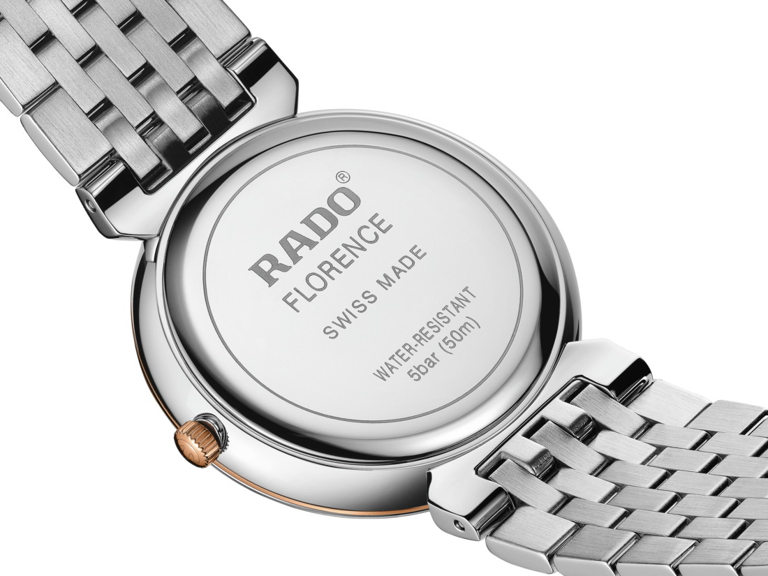 The harmonious design of the Rado Florence calls to mind the elegant domes and towers of the city from which the collection takes its name. Powered by a reliable three-hand Quartz Rado calibre R073 movement, this watch ensures greater accuracy and resistance to shocks. The 38 mm watch has an edge-to-edge-bevelled, curved sapphire crystal. The watch boasts a polished stainless steel case, crown, bezel and case back. The bracelet made of polished stainless steel with rose gold coloured alternate middle links completes the overall appearance of this classic timepiece. The champagne dial with rose gold glitter decoration, emphasised with the grey printed “Rado” logo, matches perfectly with the rose gold coloured hands. The watch is water resistant down to 50 m and is also available in S size, which makes it an ideal couples’ watch.