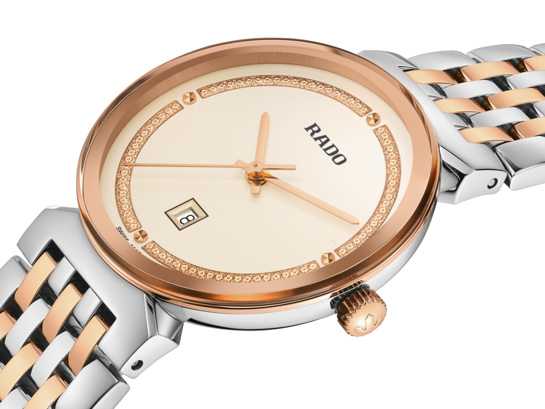 The harmonious design of the Rado Florence calls to mind the elegant domes and towers of the city from which the collection takes its name. Powered by a reliable three-hand Quartz Rado calibre R079 movement, this watch ensures greater accuracy and resistance to shocks. The 30 mm watch has an edge-to-edge-bevelled, curved sapphire crystal. The watch boasts a polished stainless steel case, crown, bezel and case back. The bracelet made of polished stainless steel with rose gold coloured alternate middle links completes the overall appearance of this classic timepiece. The champagne dial with rose gold glitter decoration, emphasised with the grey printed “Rado” logo, matches perfectly with the rose gold coloured hands. The watch is water resistant down to 50 m and is also available in L size, which makes it an ideal couples’ watch.