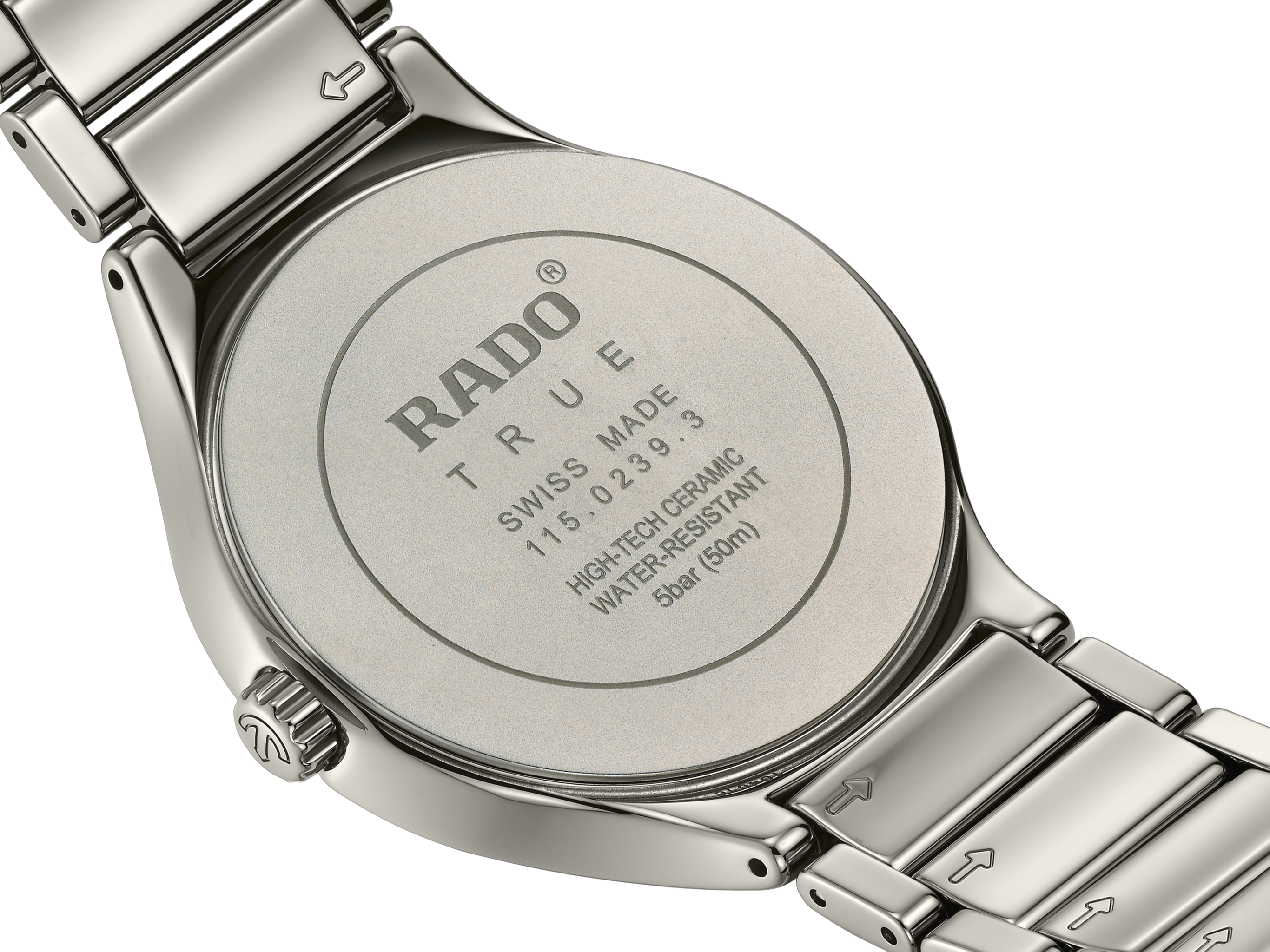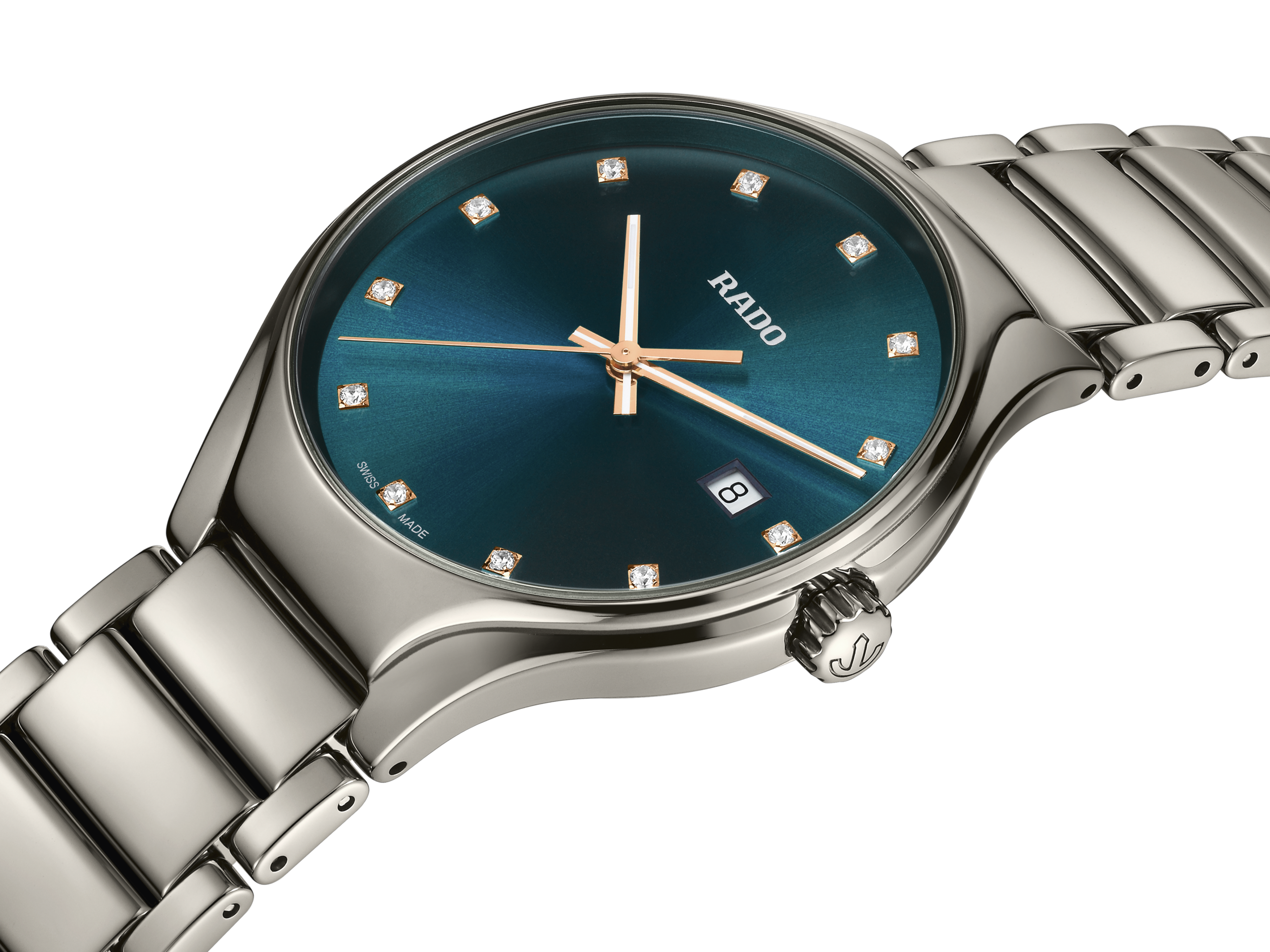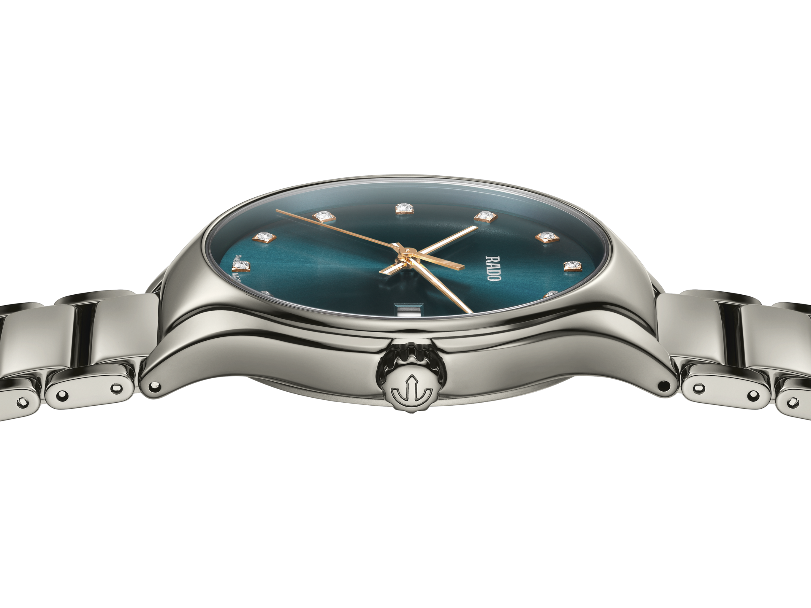 The True Quartz features a 40mm polished plasma high-tech ceramic monobloc case which matches perfectly with the dark turquoise dial. The dial with 12 diamonds is covered by a curved sapphire crystal. The rose gold coloured hands with white veneer are coated with white Super-Luminova® to ensure excellent visibility. The watch is water-resistant up to (50m) and equipped with a polished plasma high-tech ceramic bracelet, fastened by a reliable, triple-fold titanium clasp.